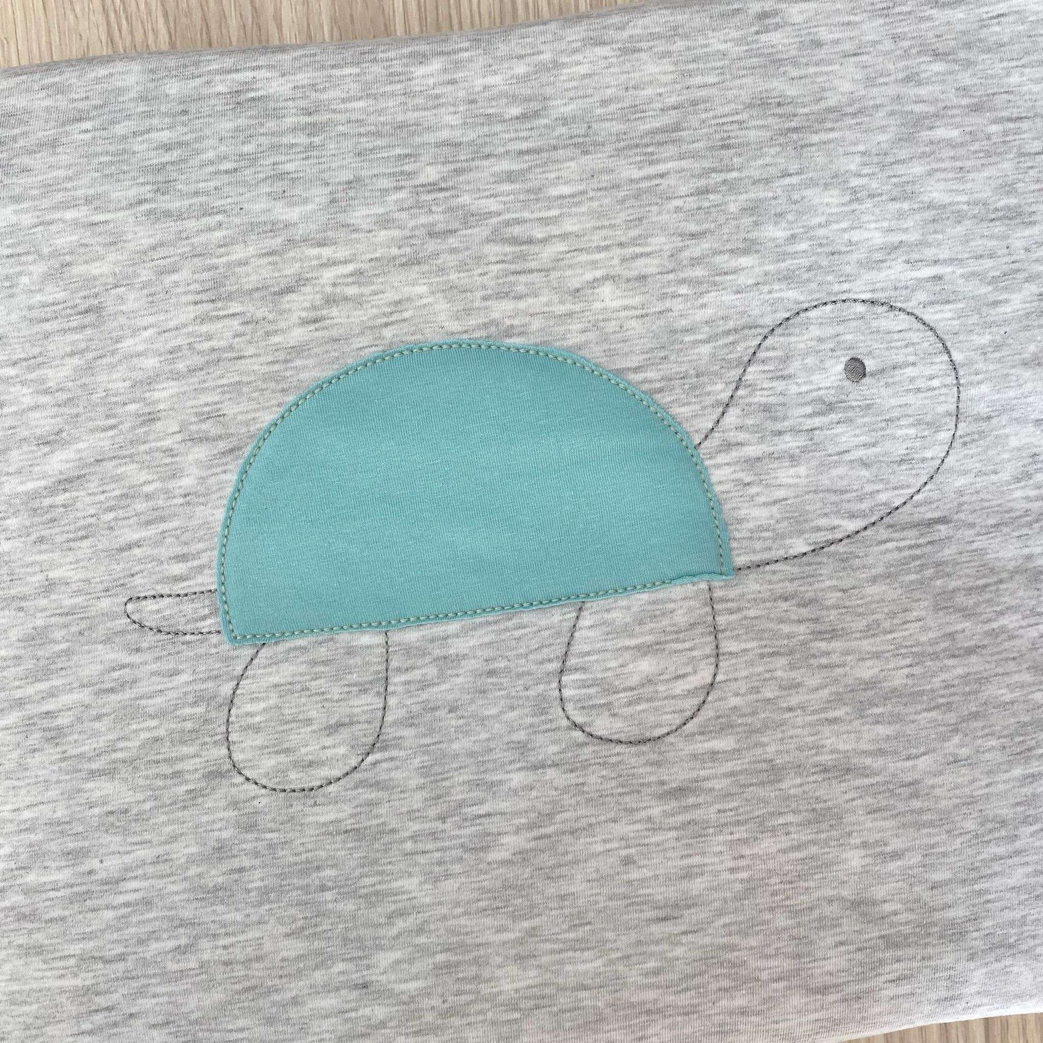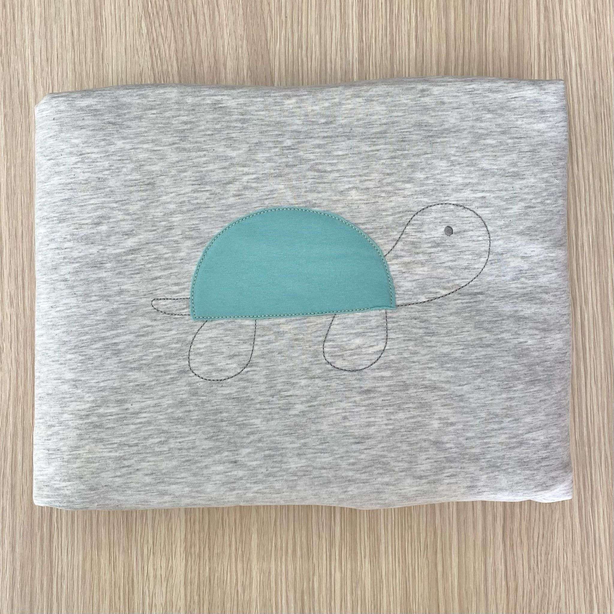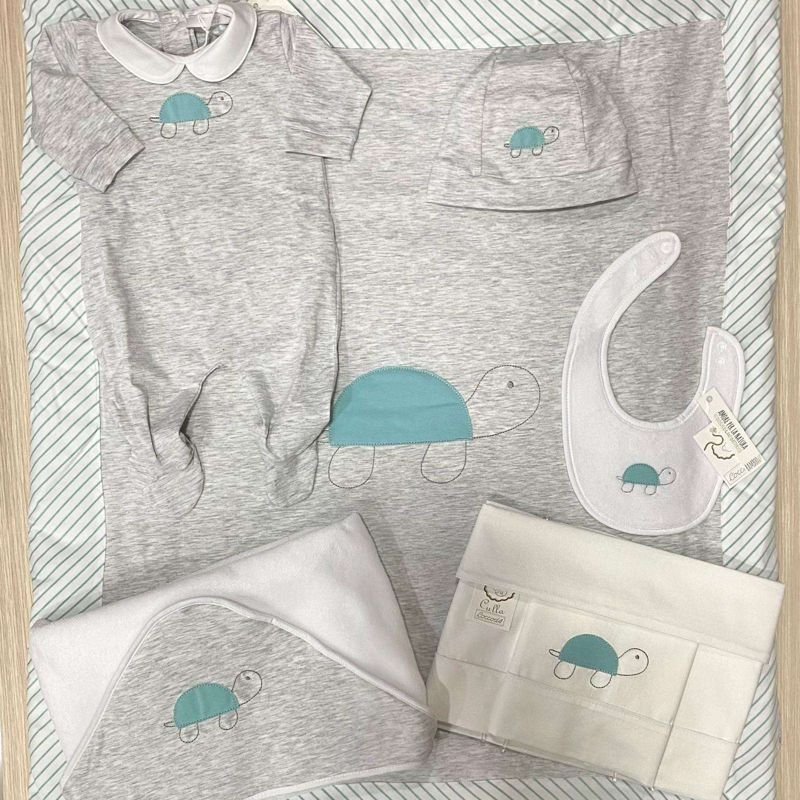 Trapuntina sfoderabile neonato in cotone, di colore grigio e verde acqua, con disegni ricamati.