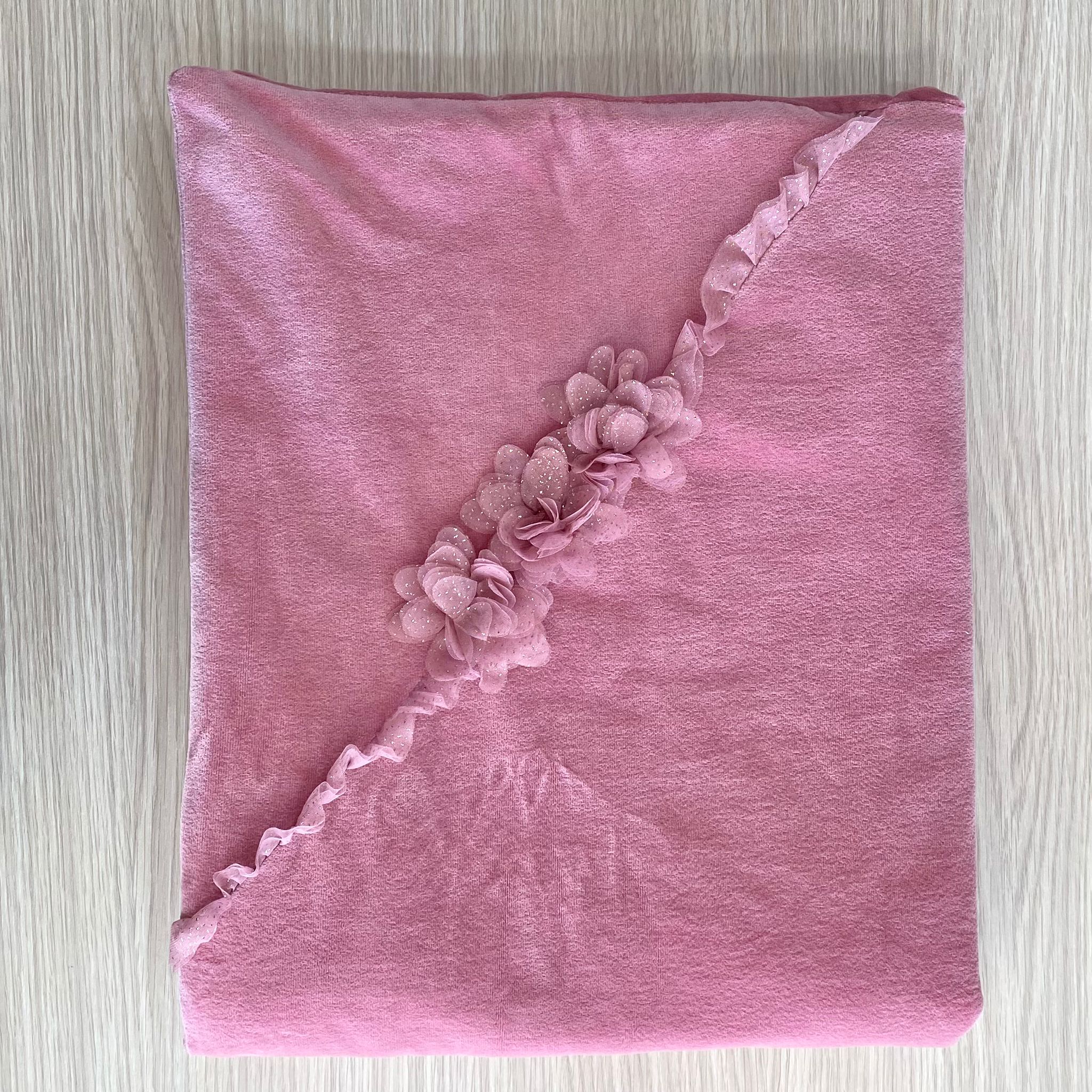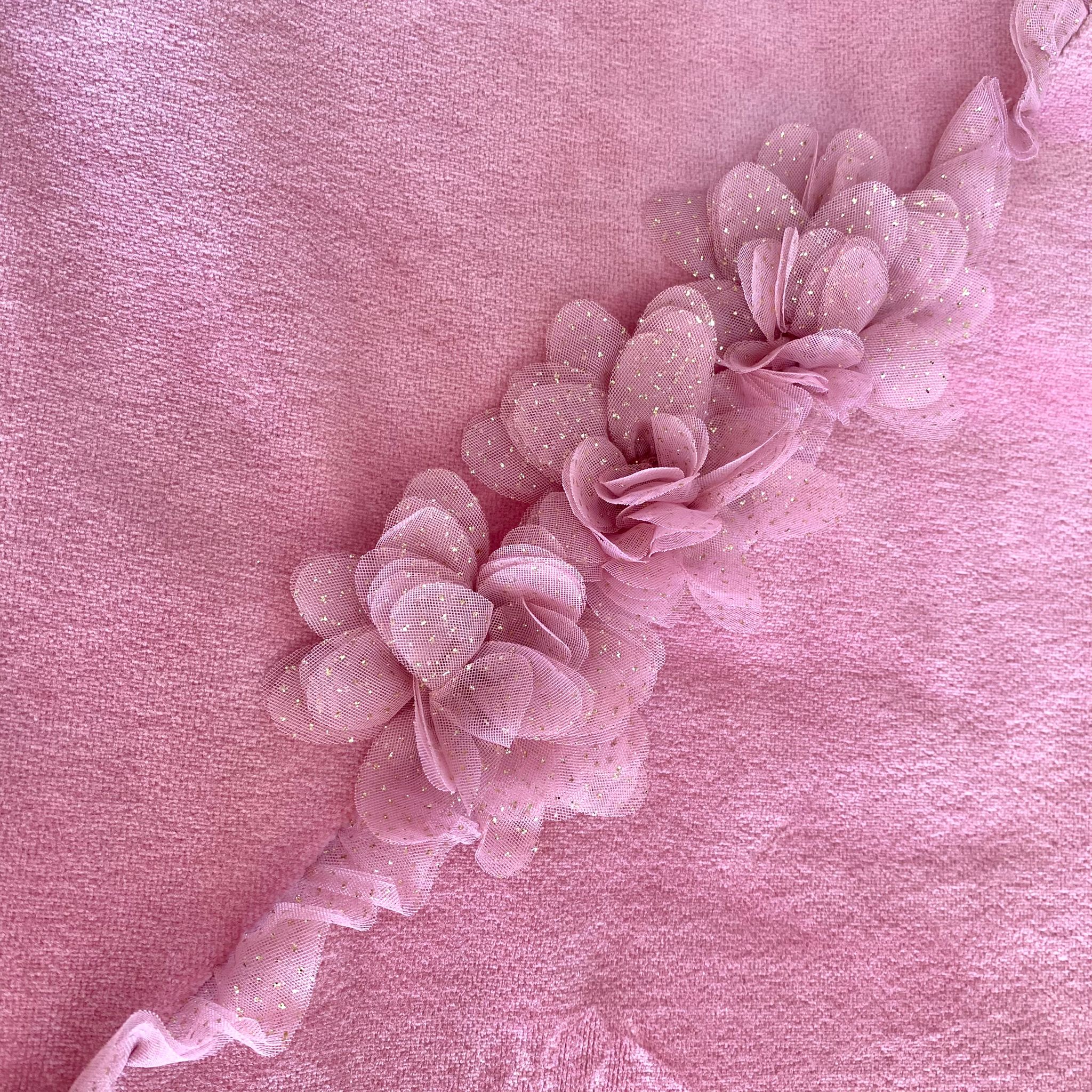 Trapuntina sfoderabile neonata in ciniglia,di colore ortensia, con applicazione in organza e dettagli glitterati.