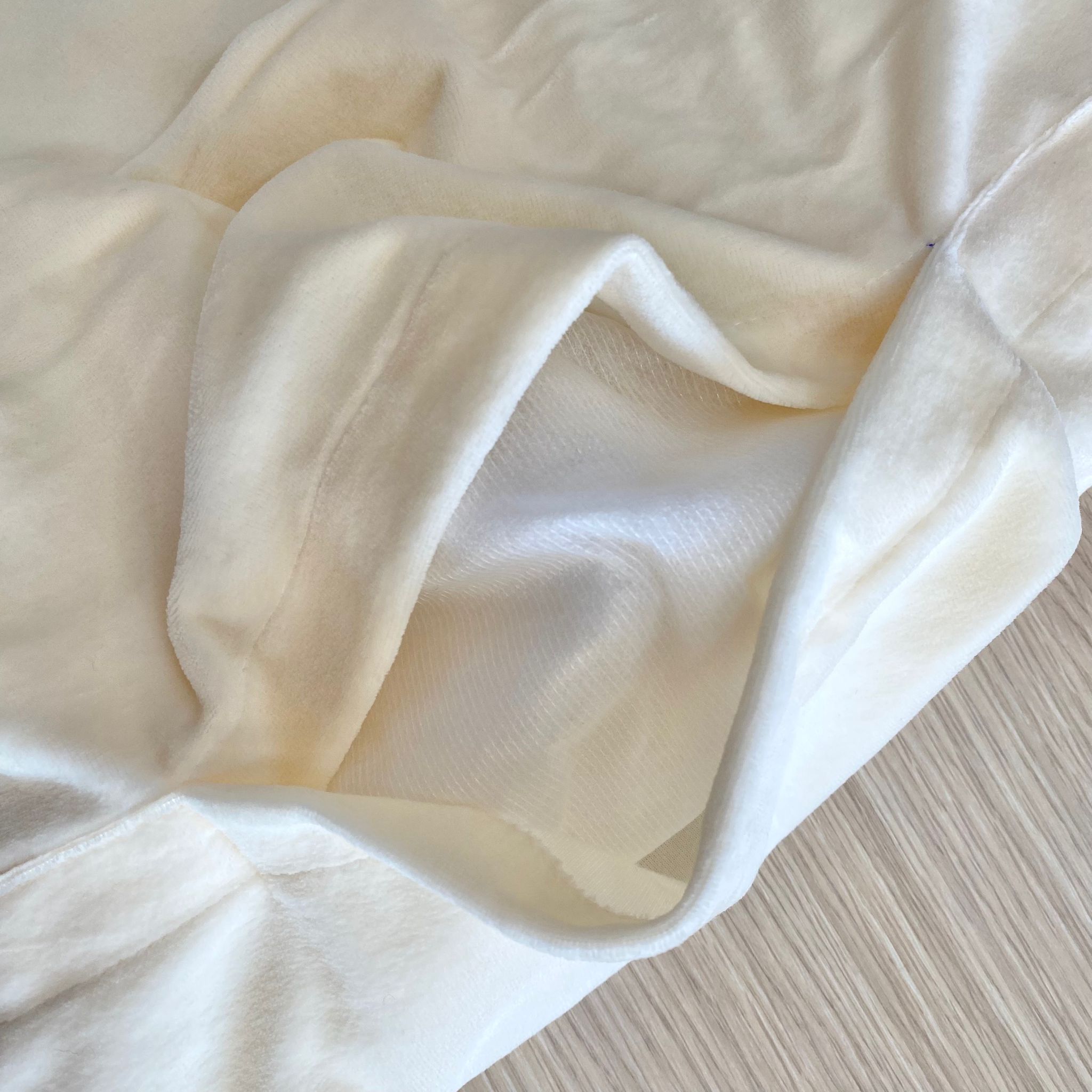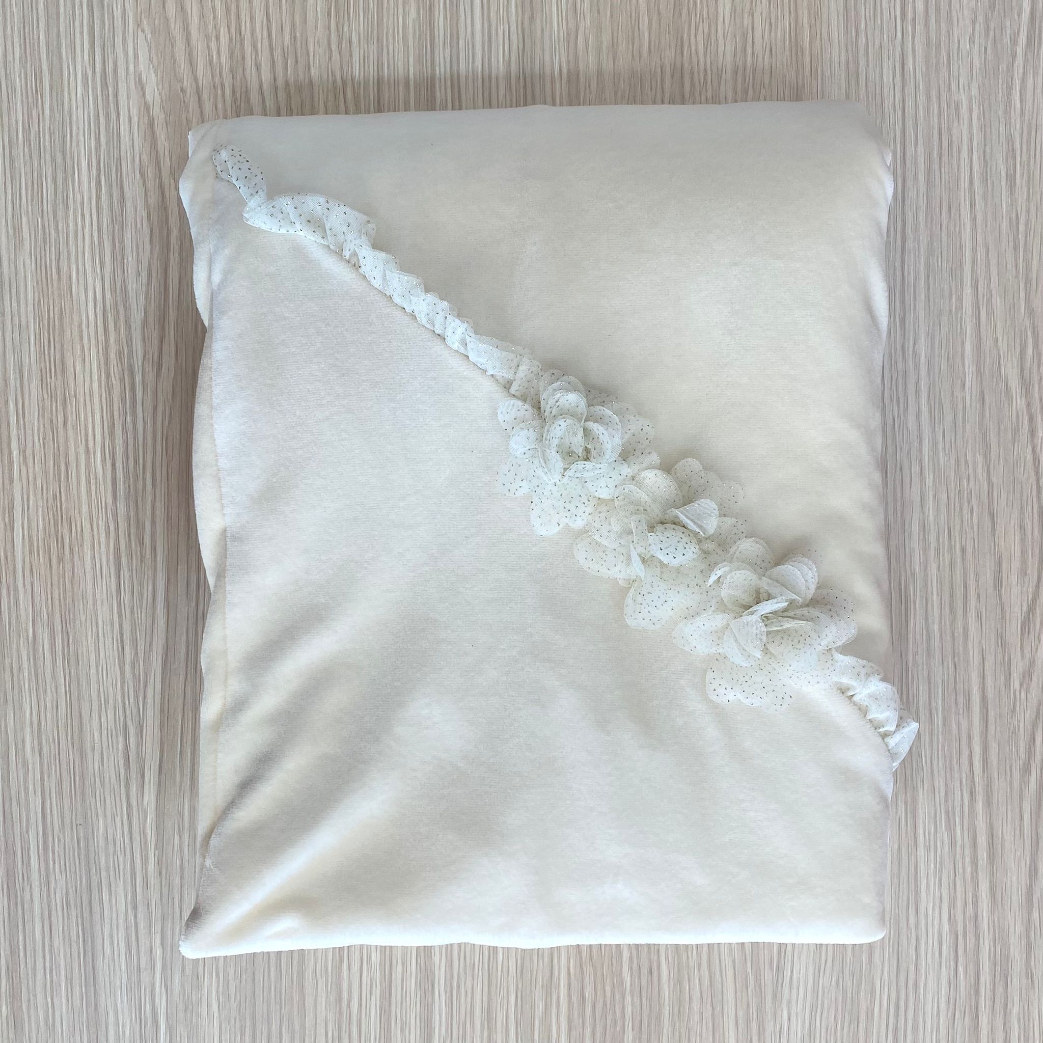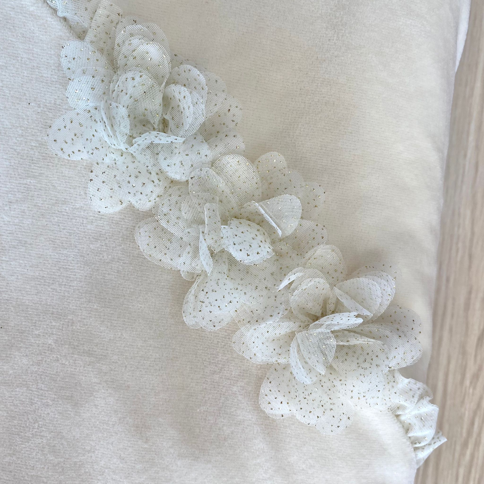 Trapuntina sfoderabile neonata in ciniglia,di colore burro, con applicazione in organza e dettagli glitterati.