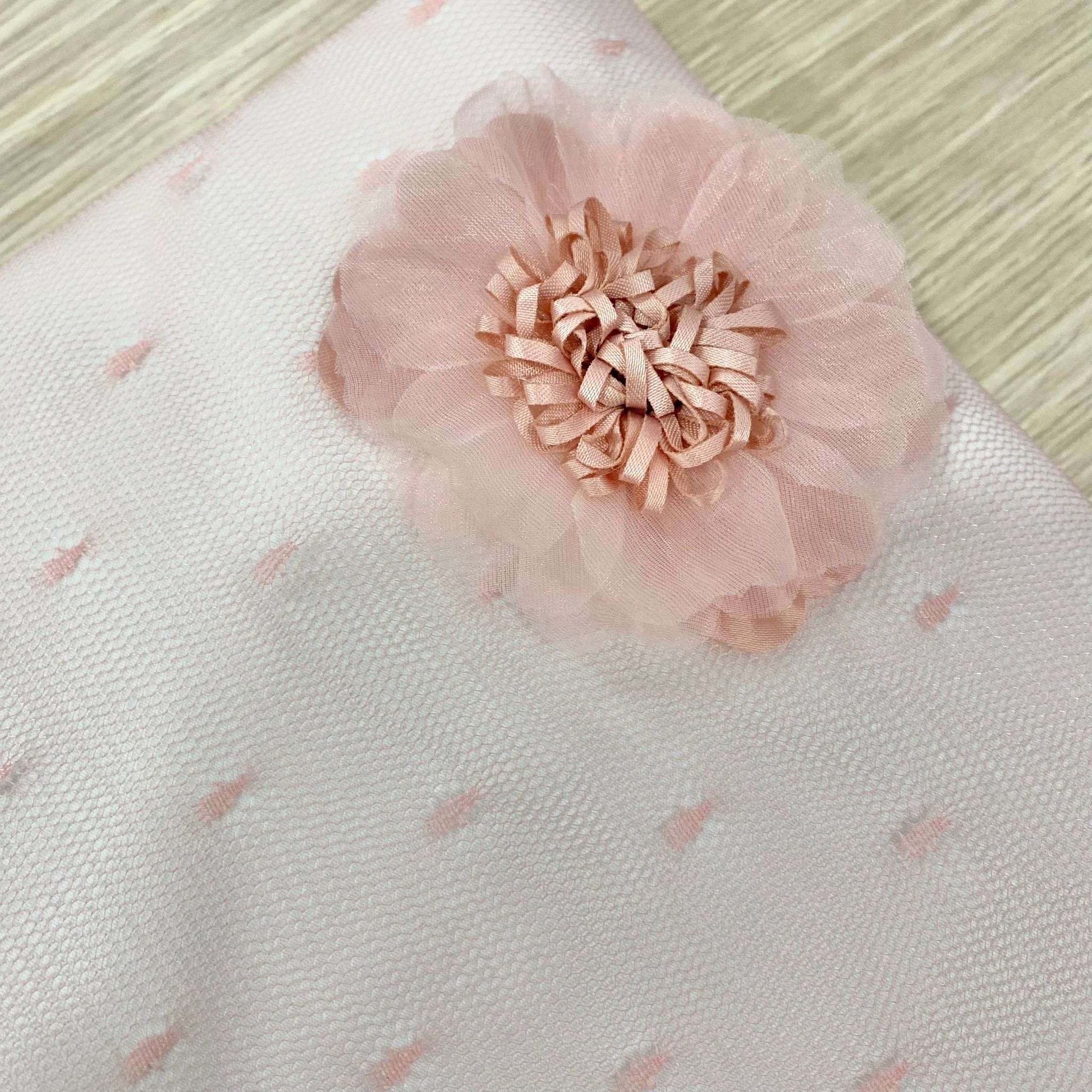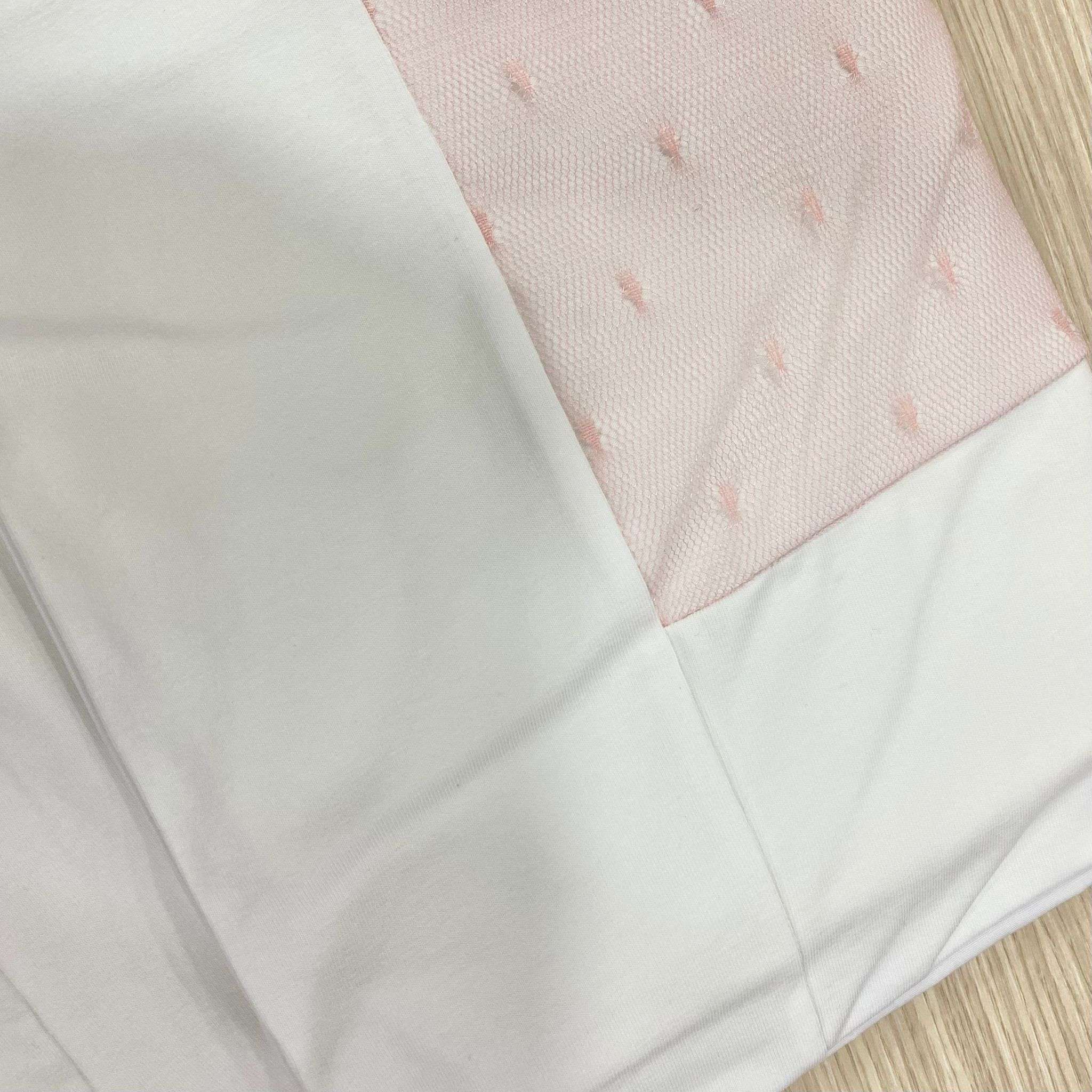 Trapuntina sfoderabile leggera neonata in cotone, di colore bianco e rosa, con retina in tulle e applicazione di fiorellino.