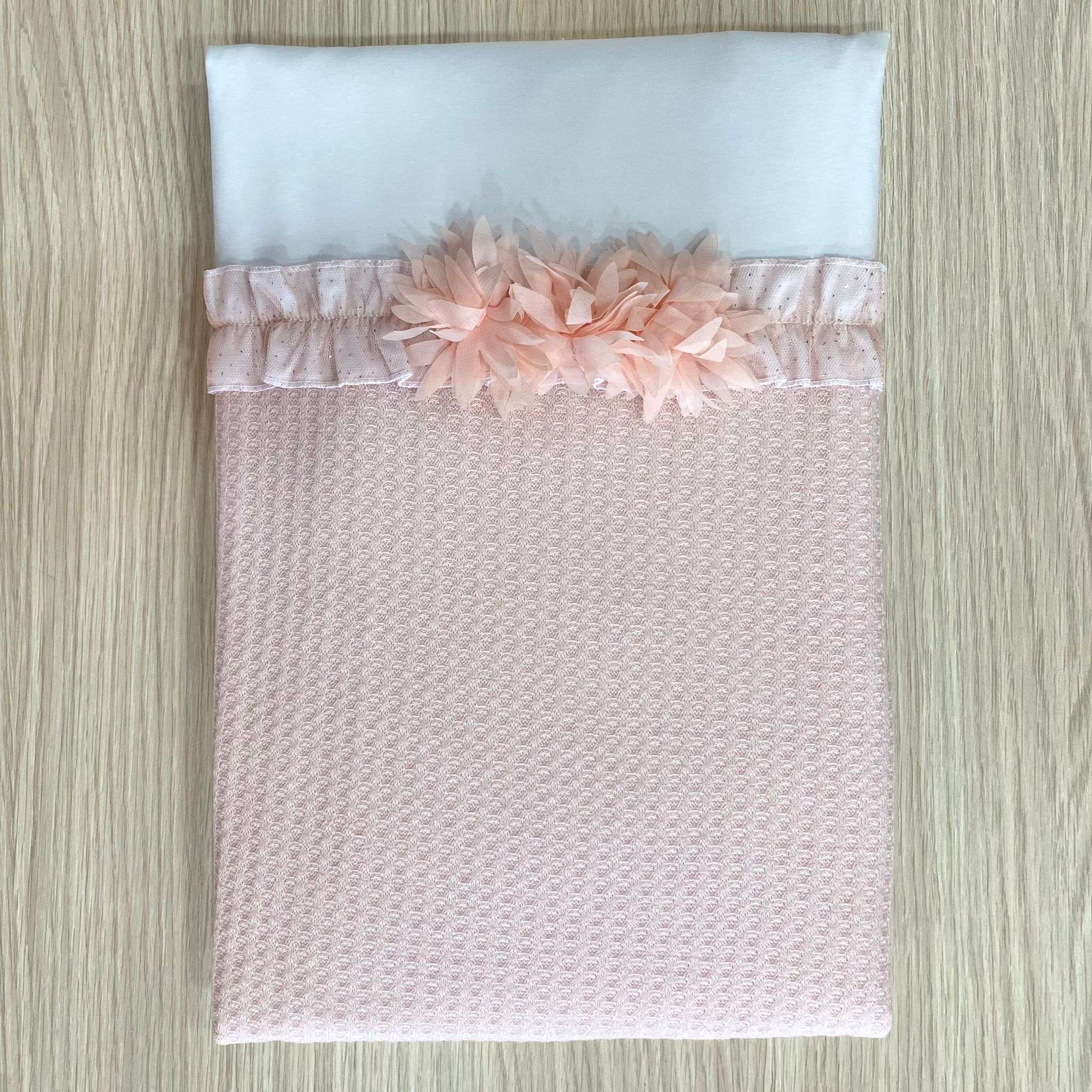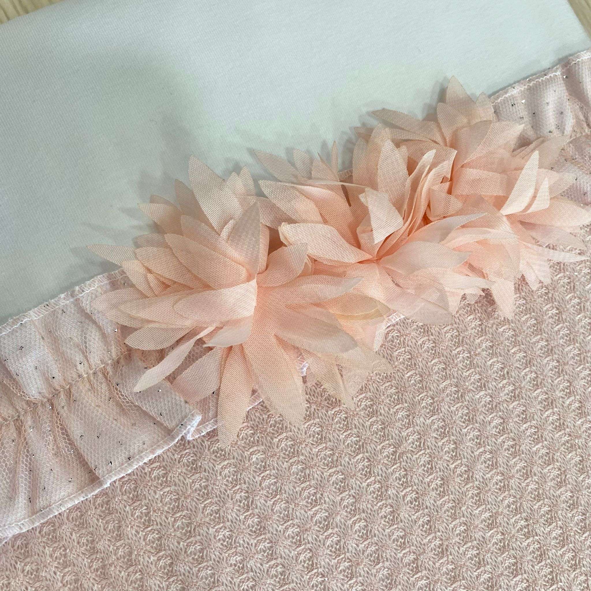 Trapuntina sfoderabile leggera neonata in cotone, di colore bianco e rosa, con retina in tulle con glitter argentati e applicazione di fiorellini in organza.