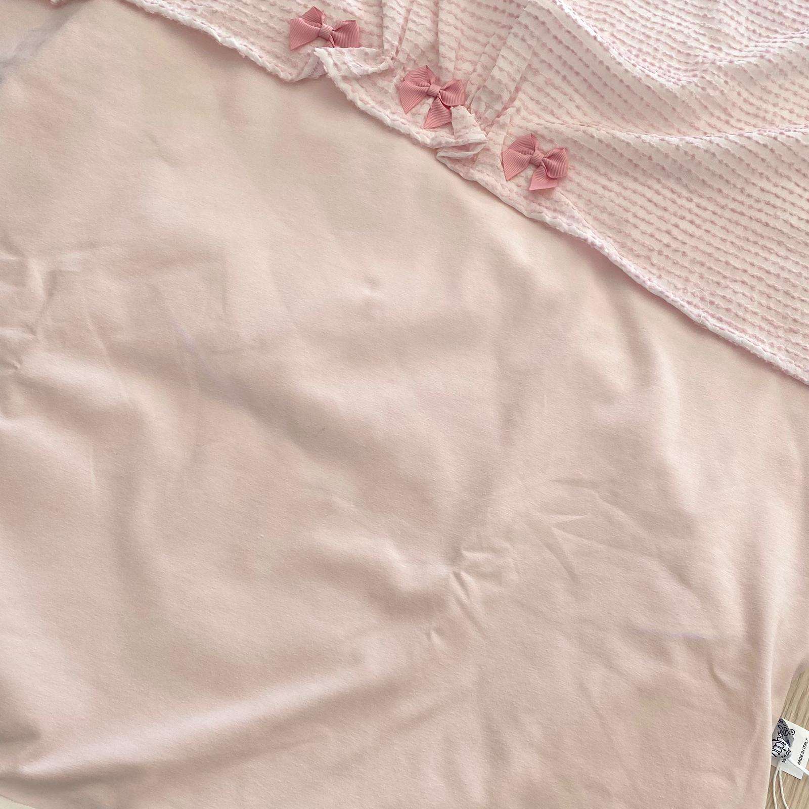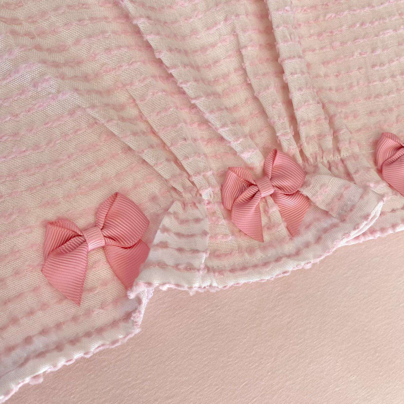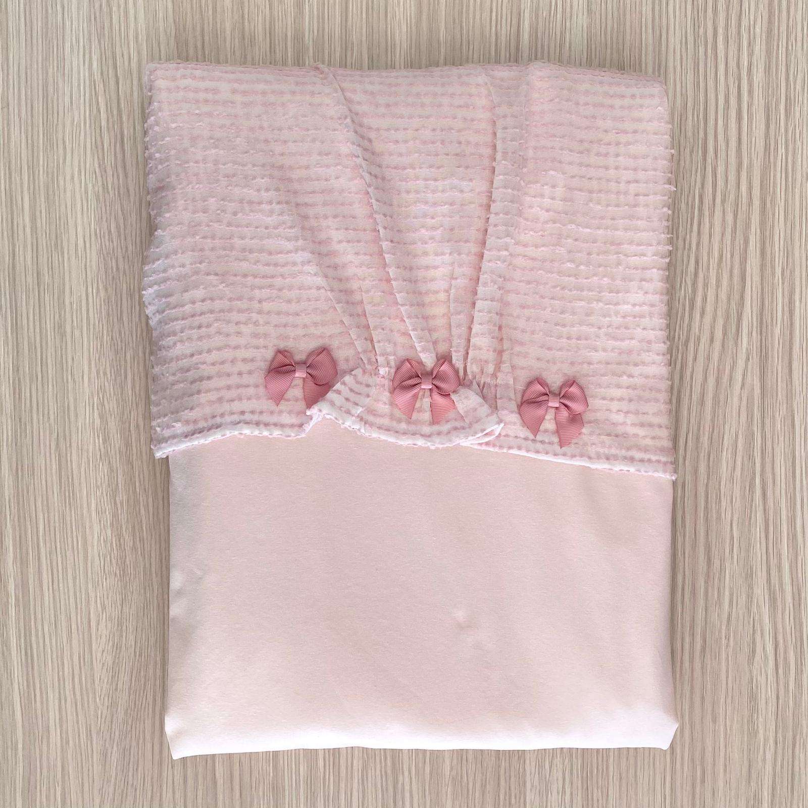 Trapuntina sfoderabile leggera neonata in cotone, di colore rosa con applicazione di veletto in cotone e fiocchetti.