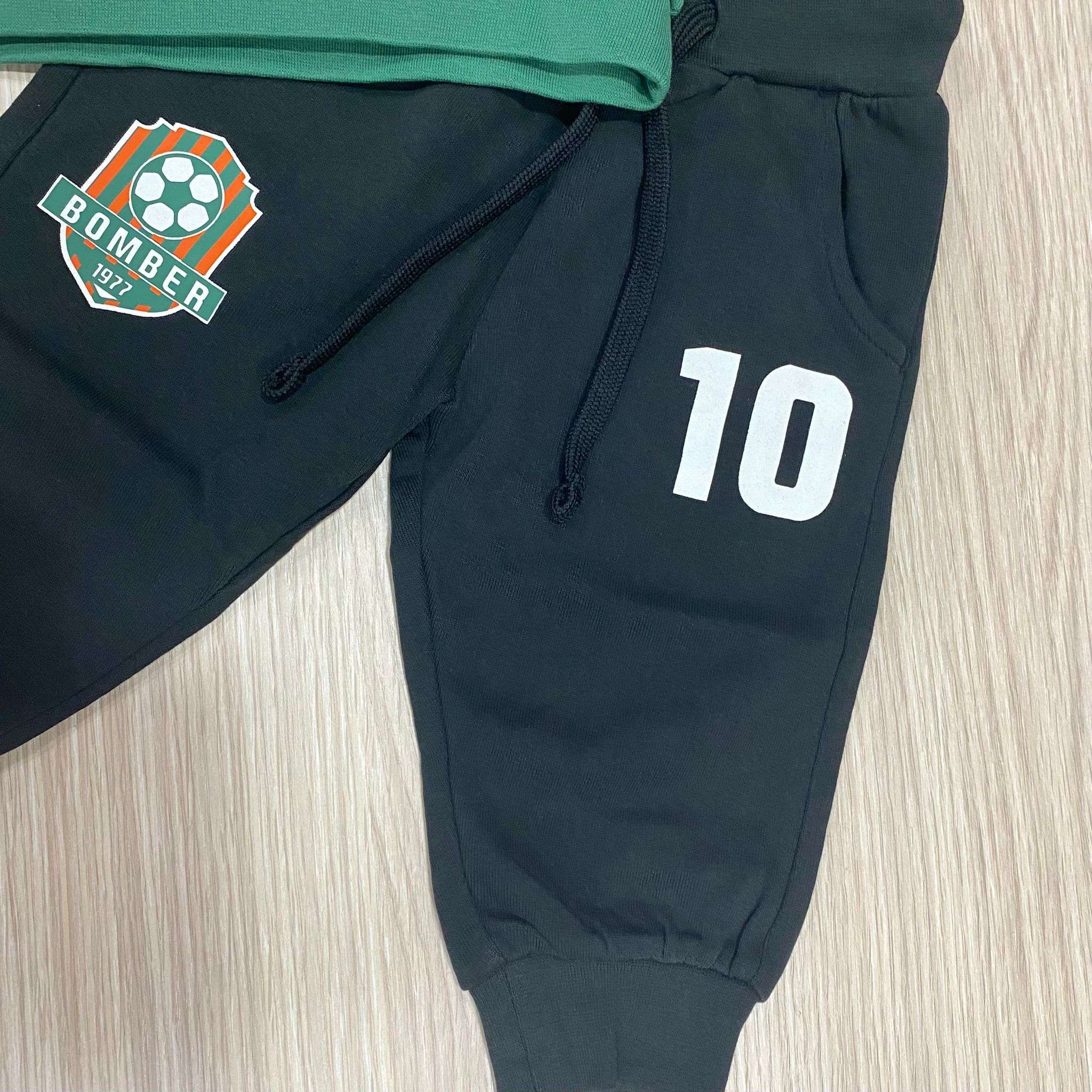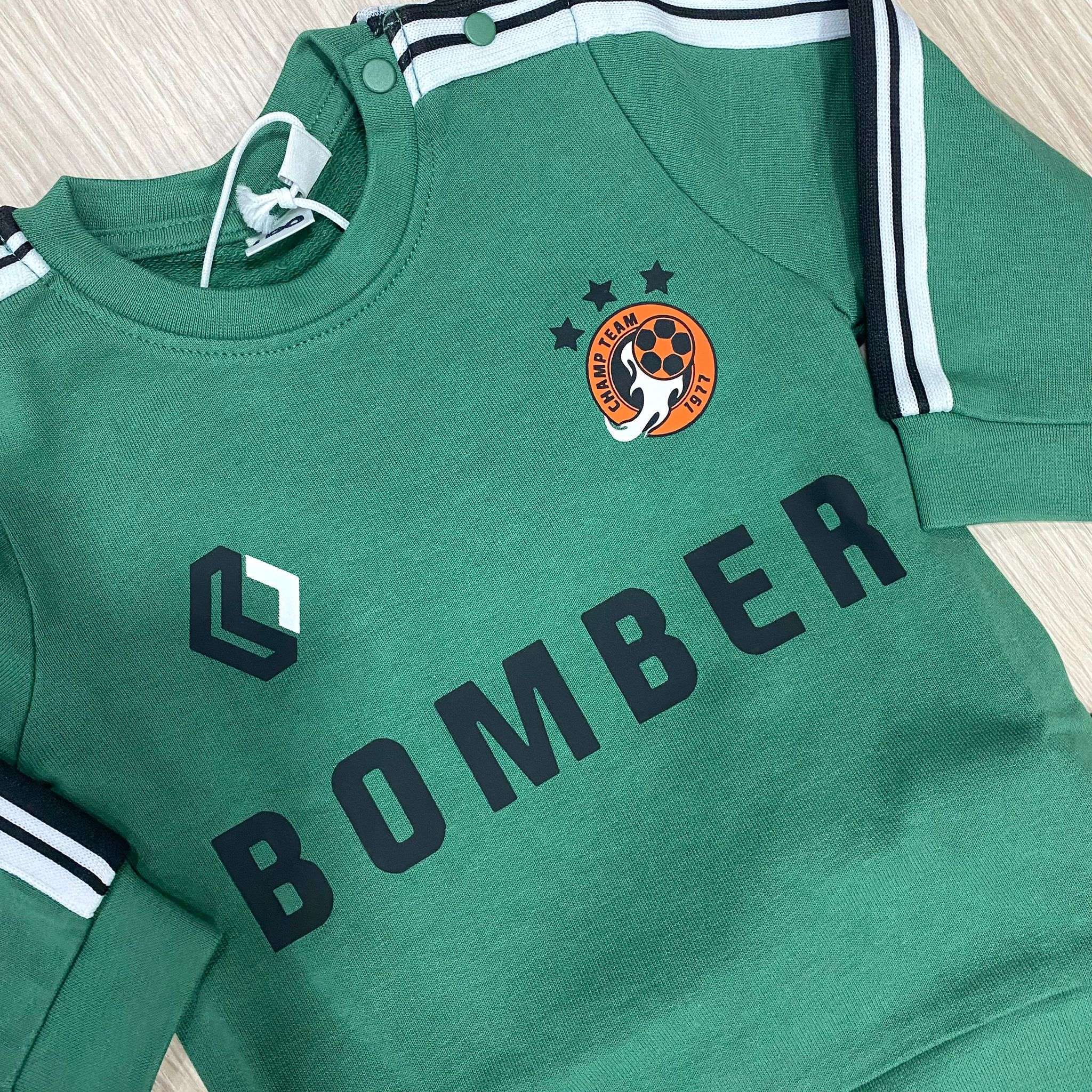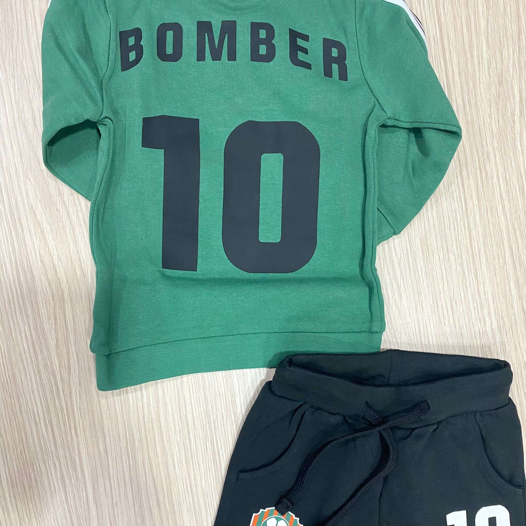 Tuta due pezzi bambino in cotone, di colore verde e nero, con stampa di vari colori. Tuta con polsini.