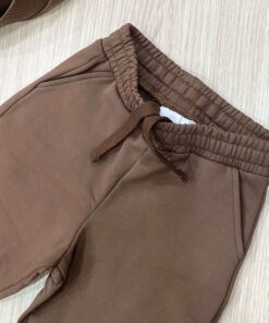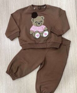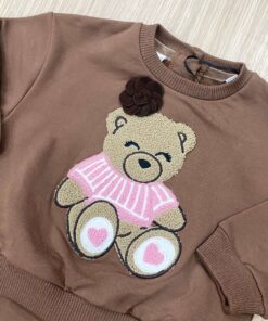 Tuta due pezzi bambina in cotone felpato, di colore marrone, con disegno teddy in rilievo e di vari colori e applicazione di fiorellino in velluto. Pantalone con laccetto regolabile.