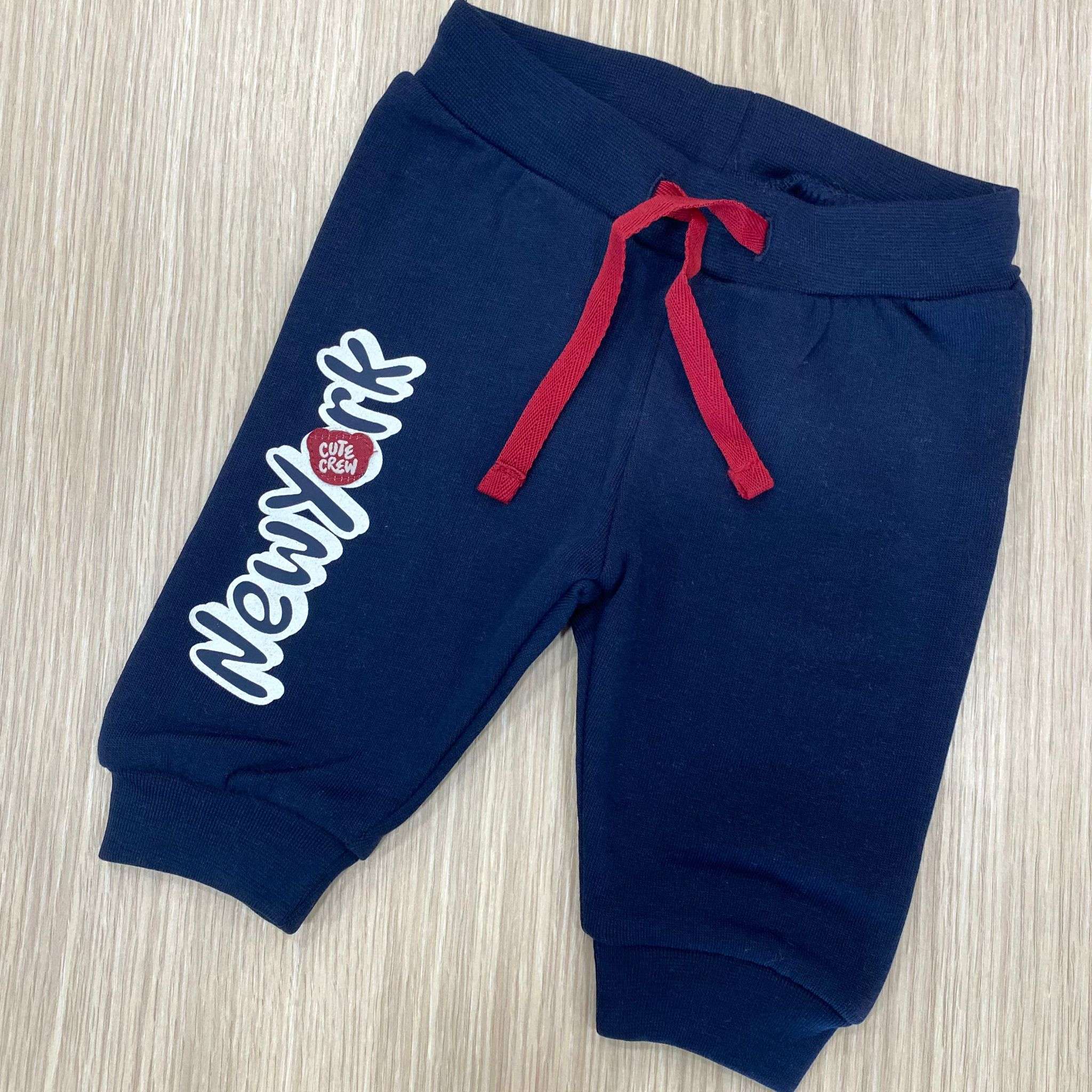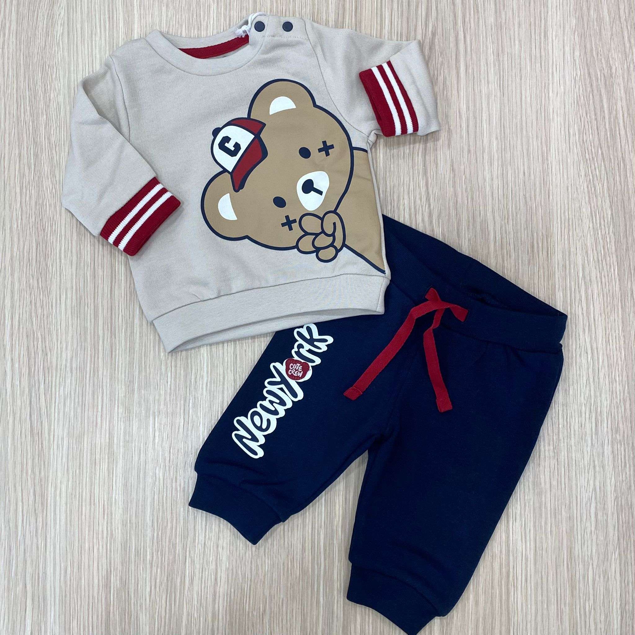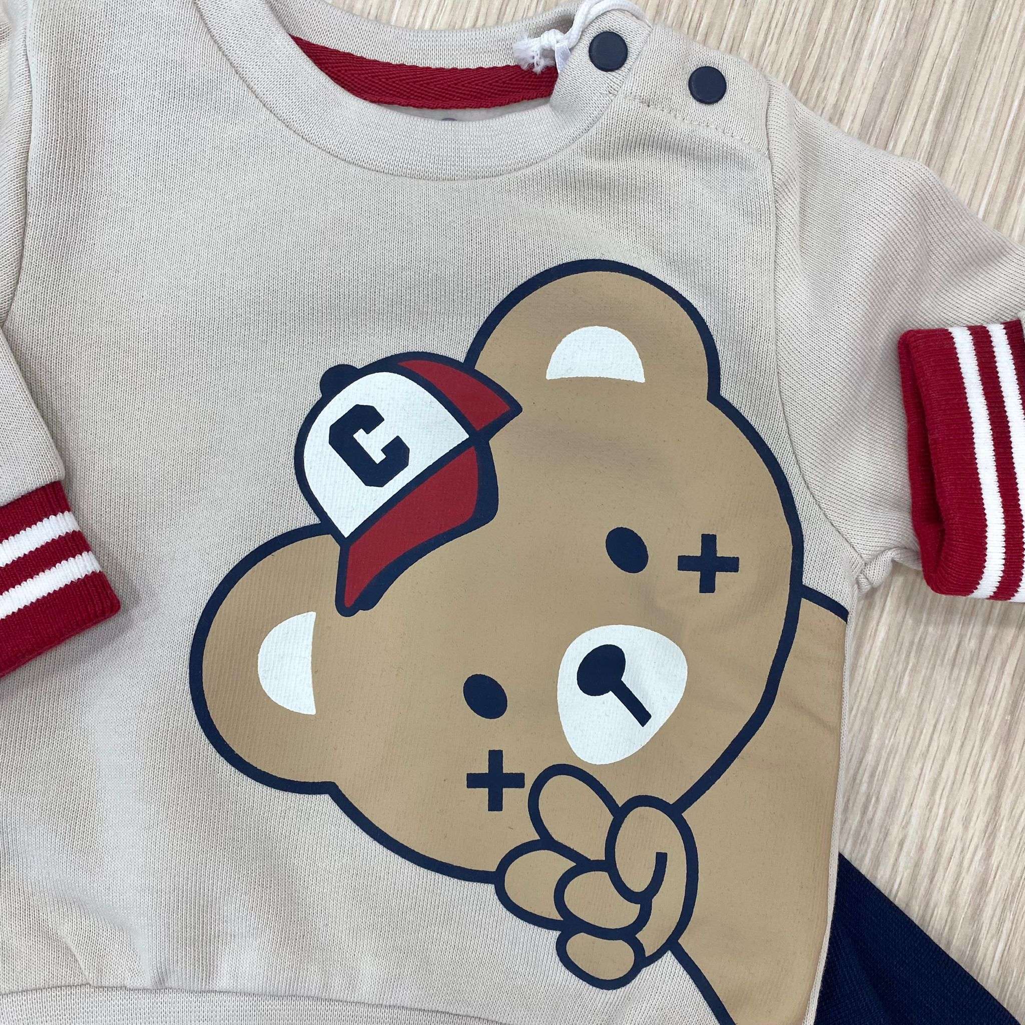 Tuta due pezzi neonato/bambino in cotone felpato, di colore ecrù, blu e rosso, con stampe di vari colori.