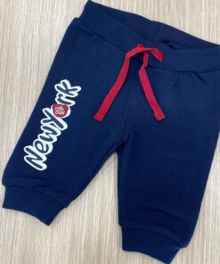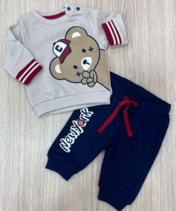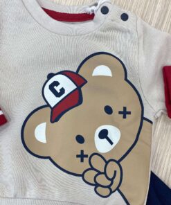 Tuta due pezzi neonato/bambino in cotone felpato, di colore ecrù, blu e rosso, con stampe di vari colori.