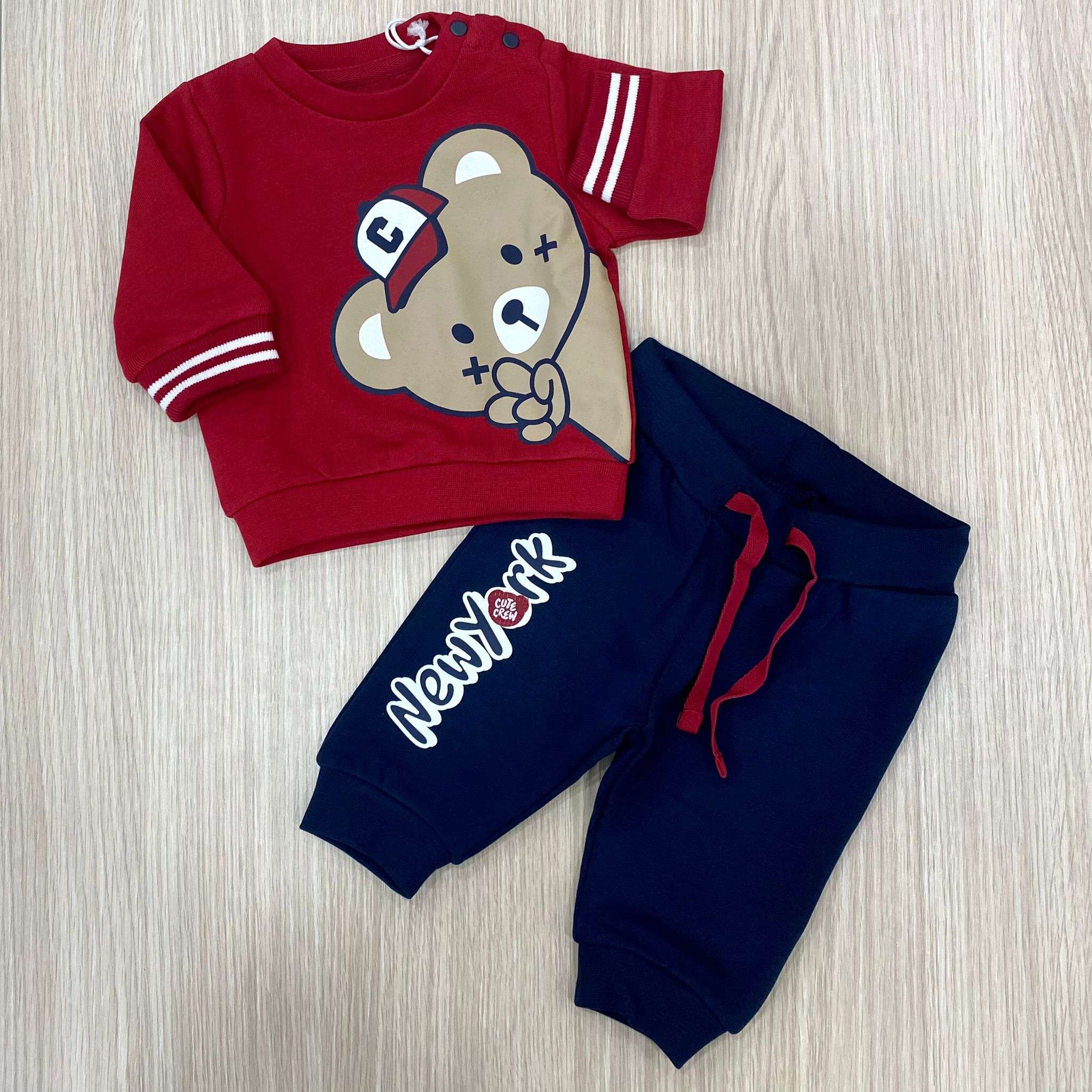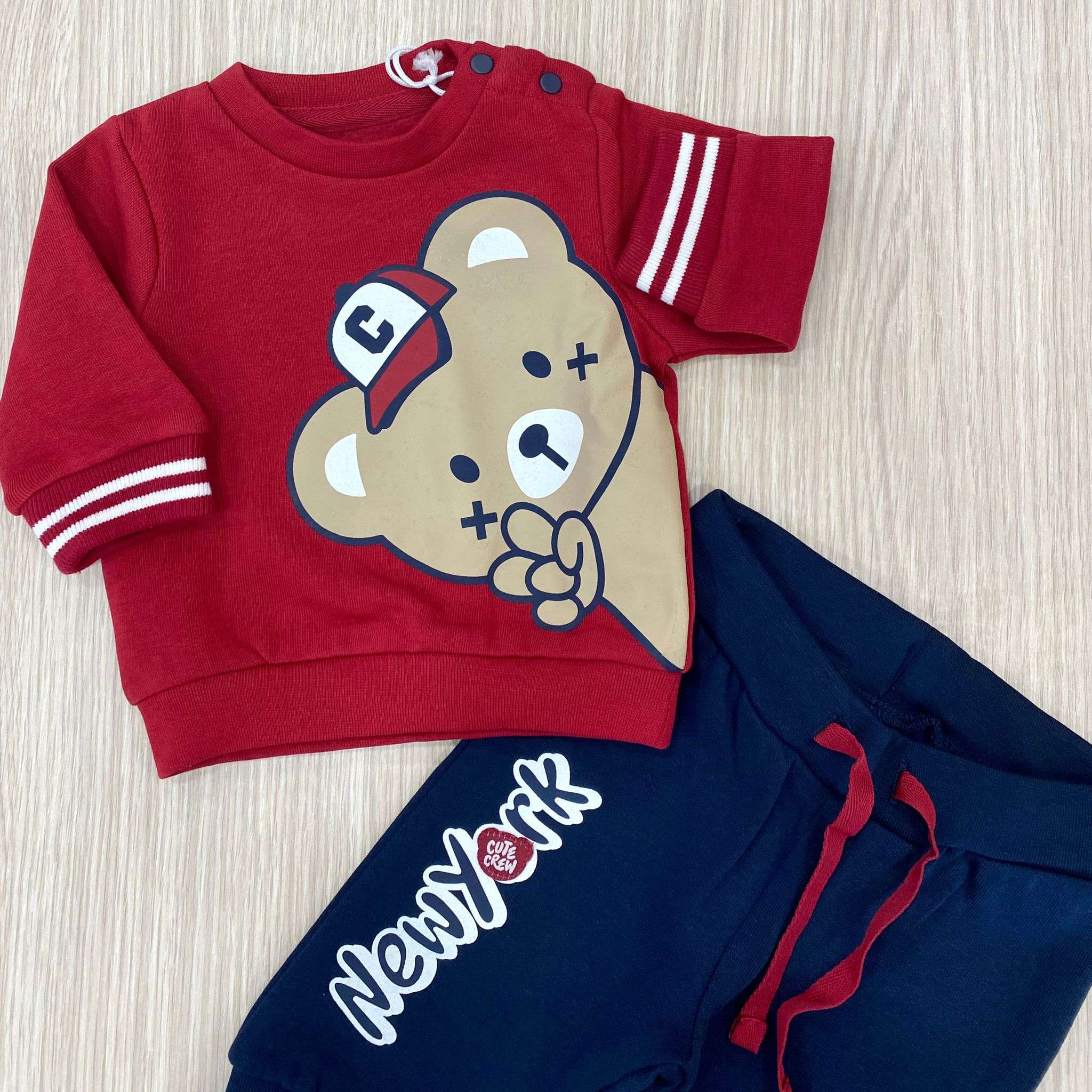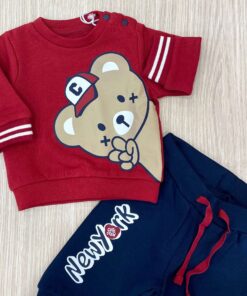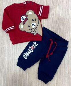 Tuta due pezzi neonato/bambino in cotone felpato, di colore blu e rosso, con stampe di vari colori.