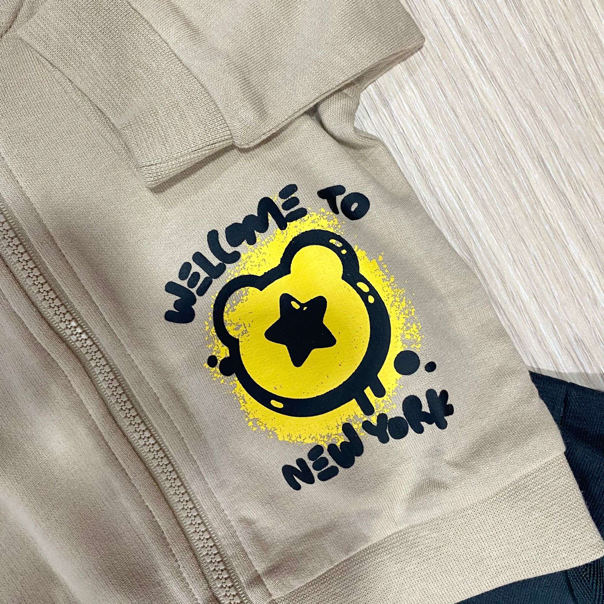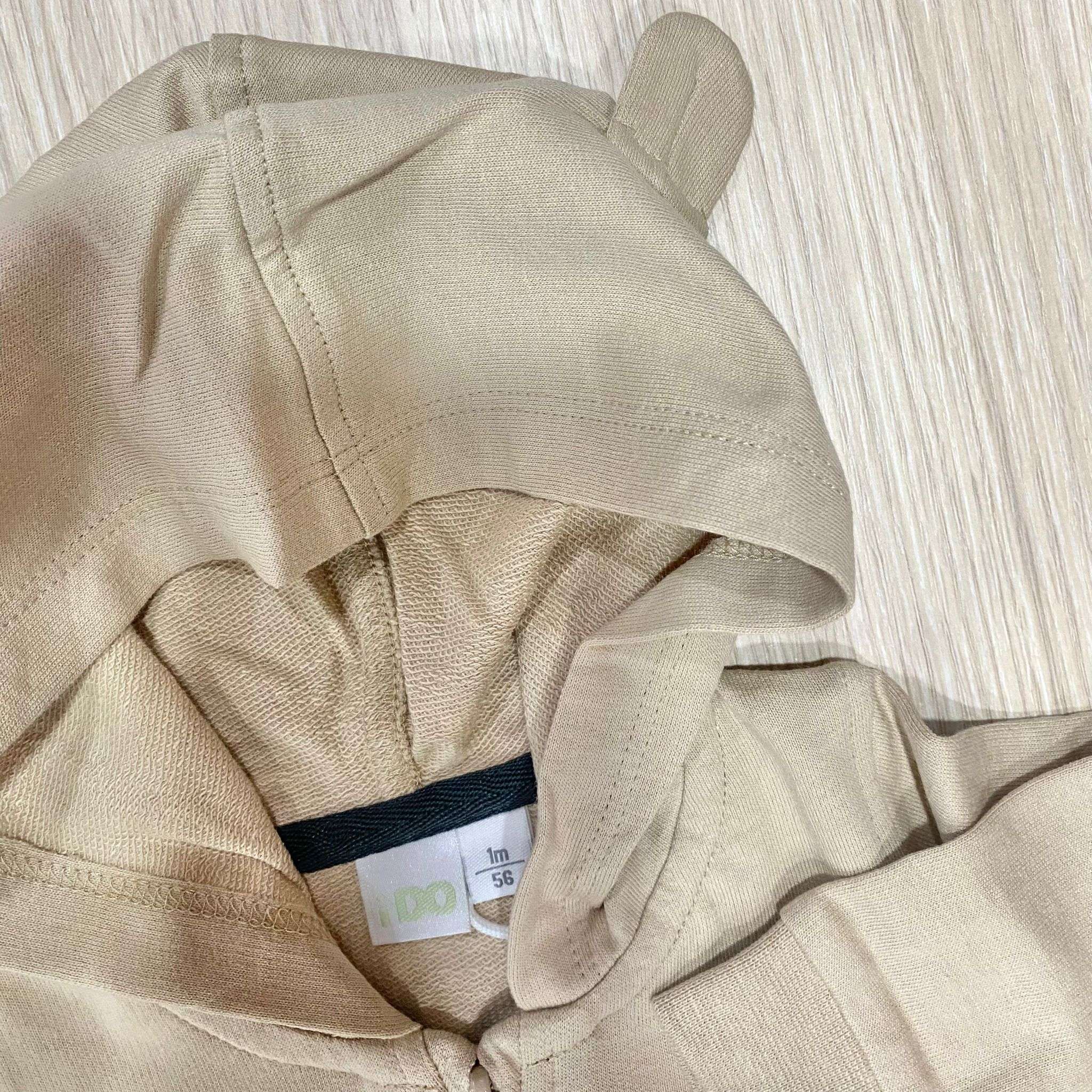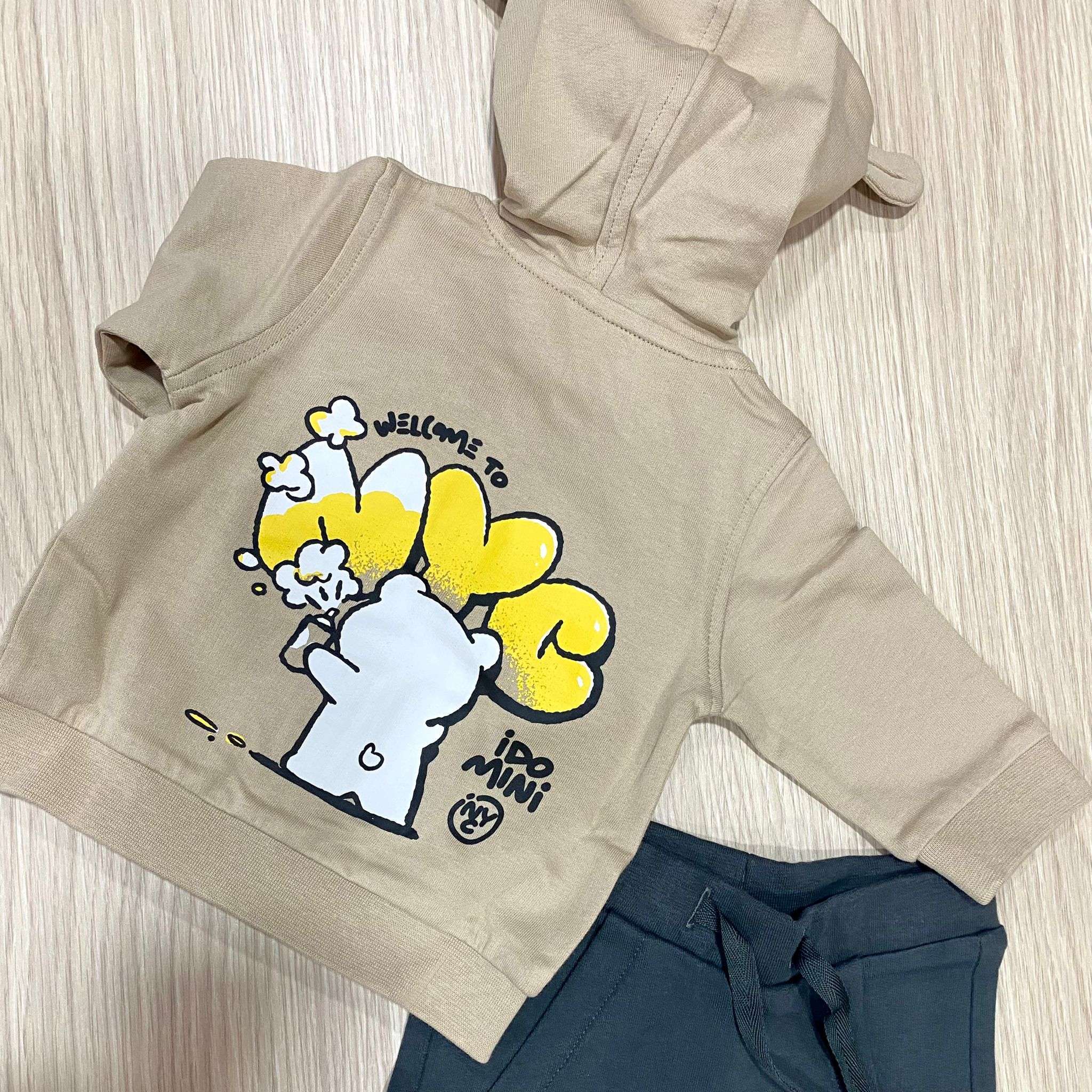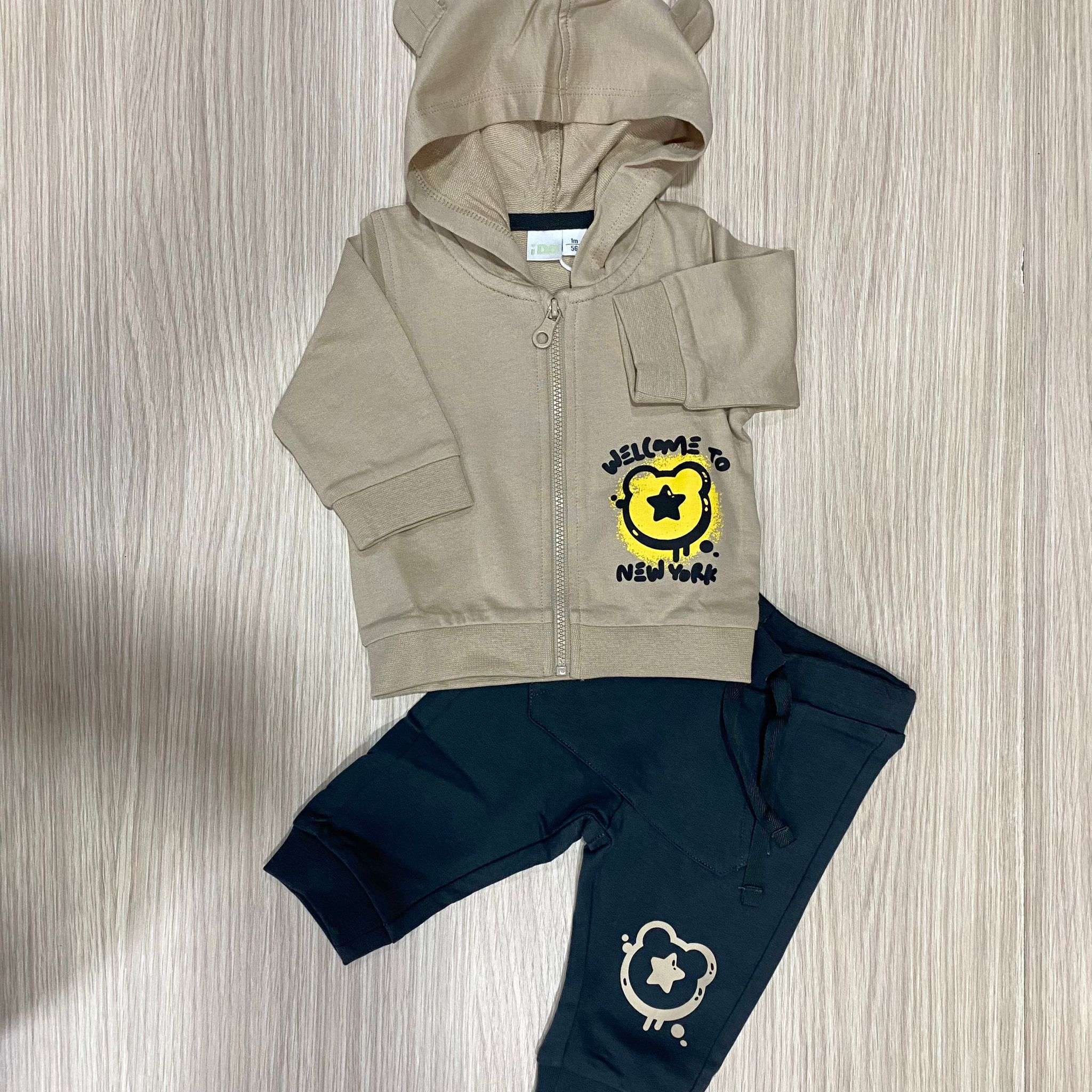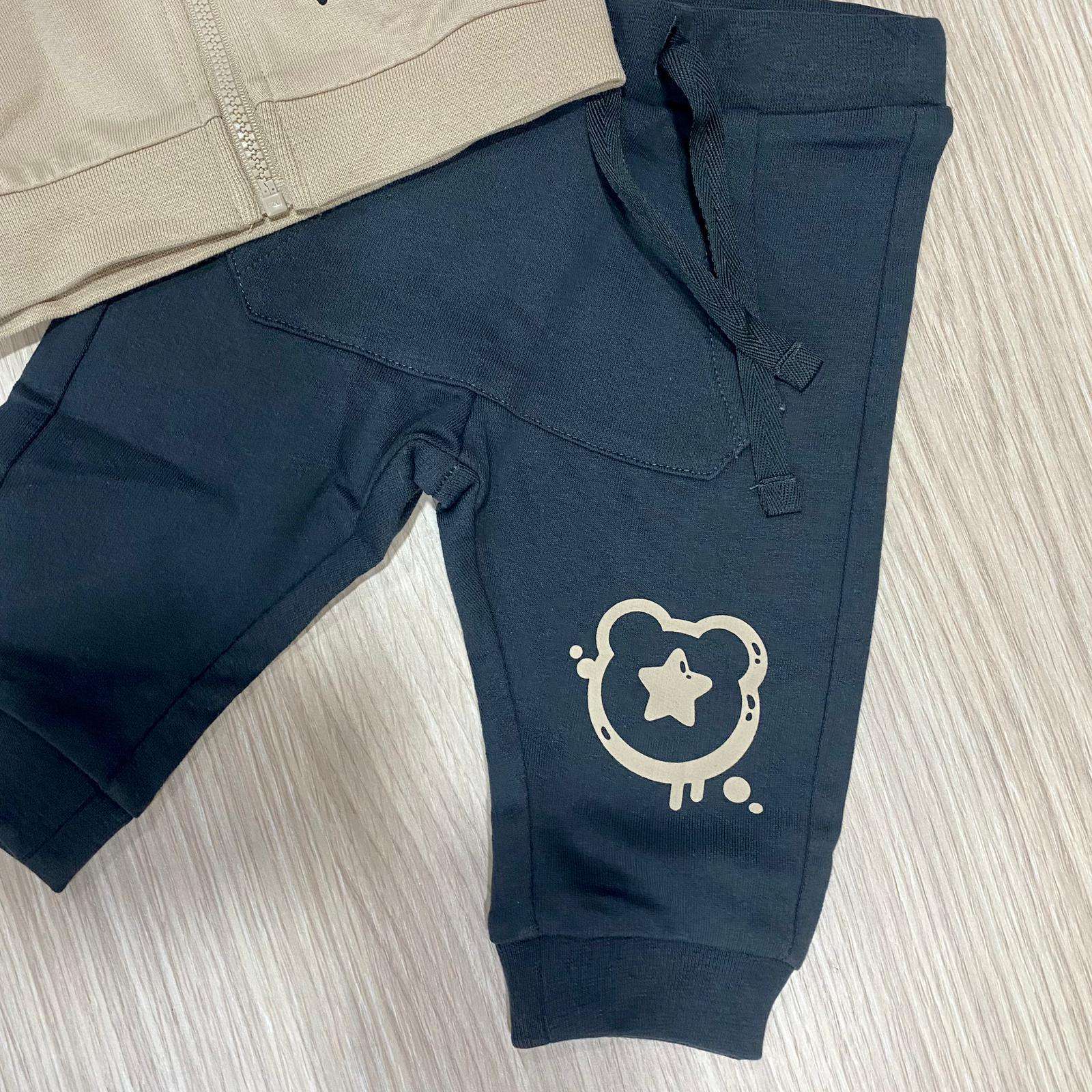 Tuta due pezzi neonato/bambino in cotone, di colore beige e nero, con stampe di vari colori. Tuta con polsini, cappuccio e cerniera.