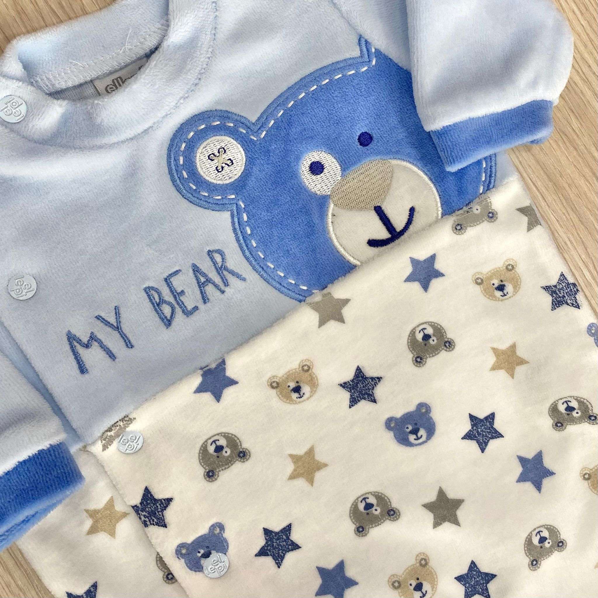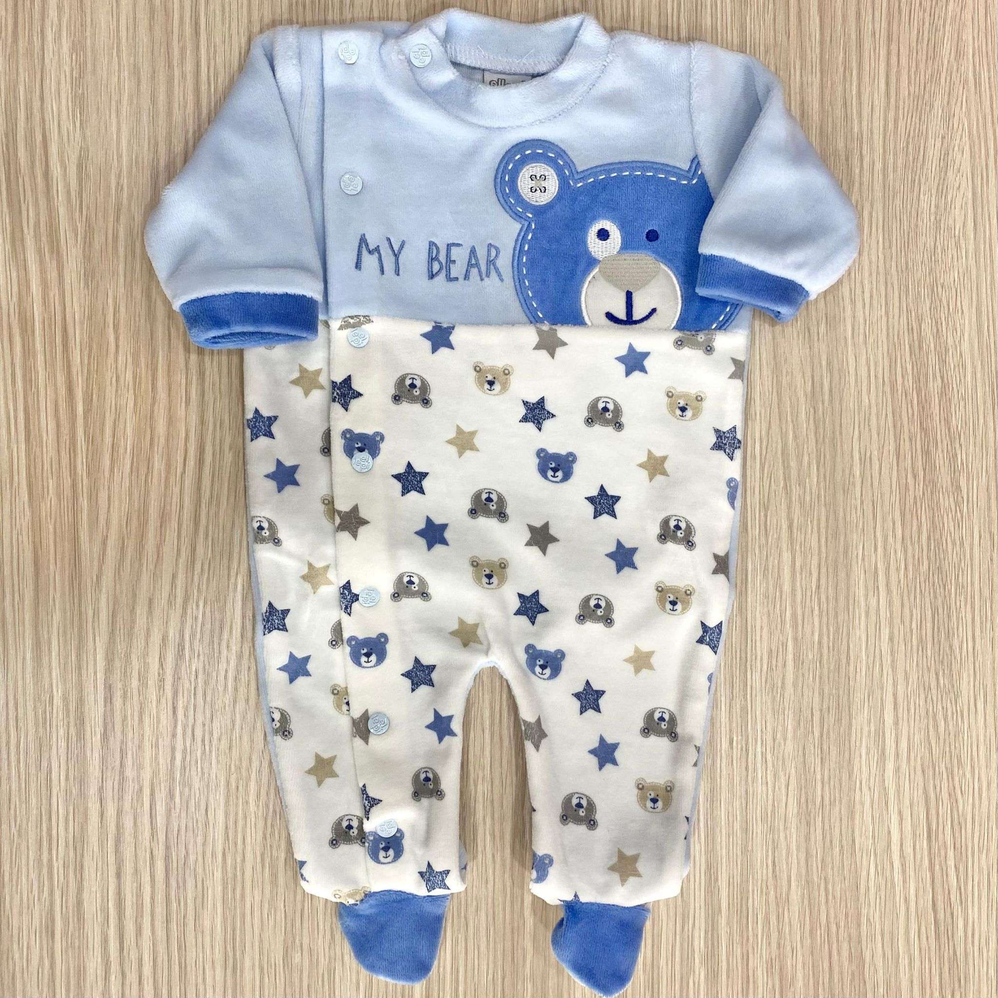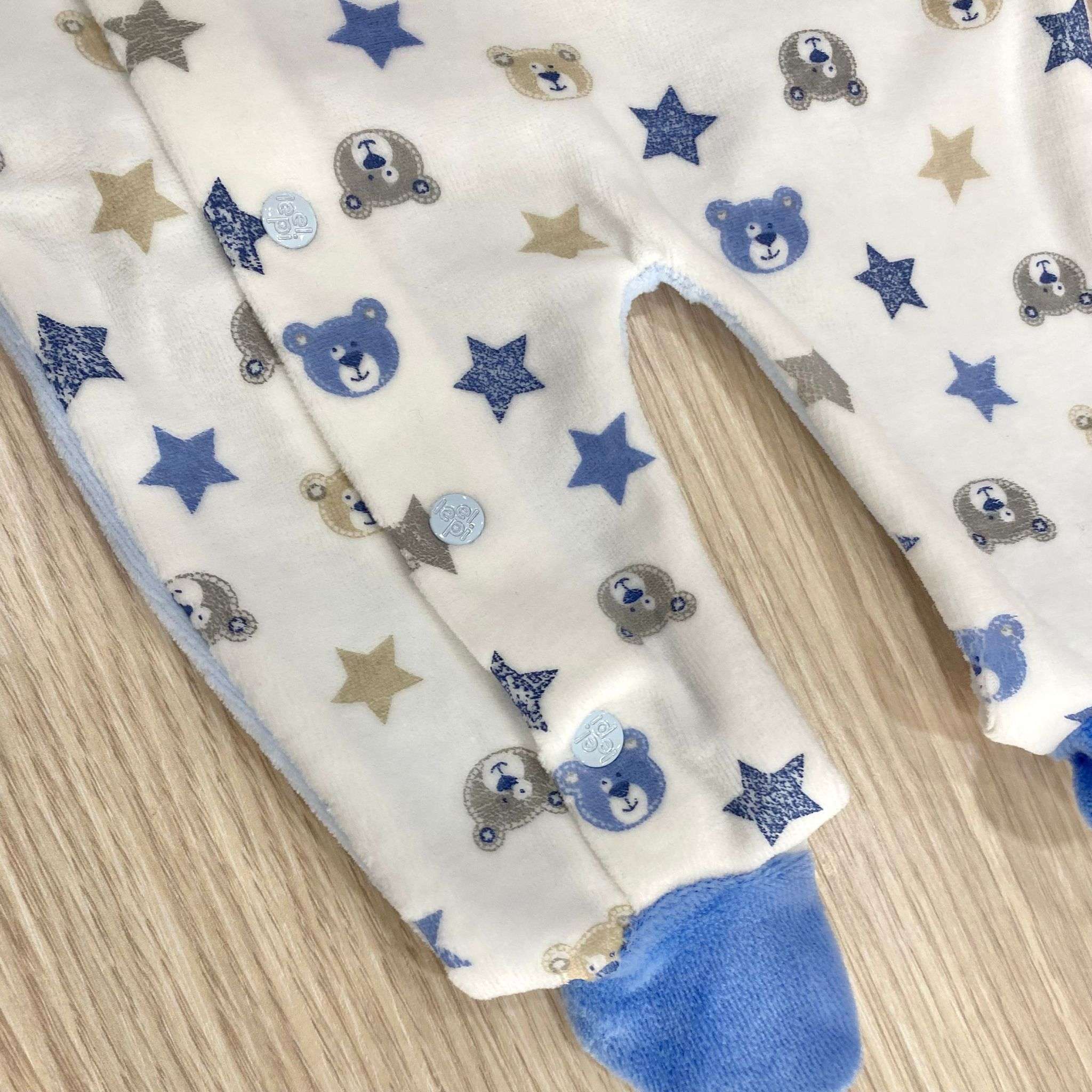 Tutina intera neonato in ciniglia, di colore biancio e celeste, con disegno ricamato.