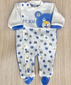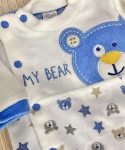 Tutina intera neonato in ciniglia, di colore biancio e avio, con disegno ricamato.