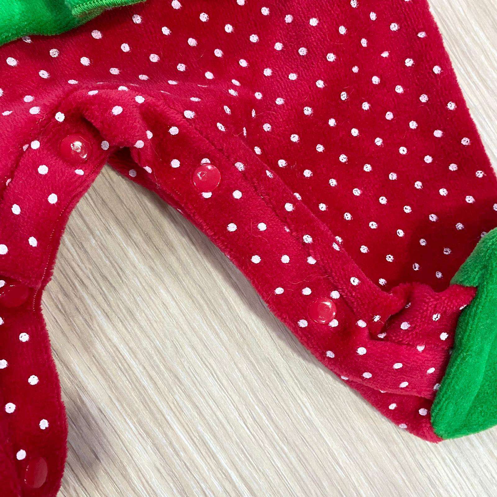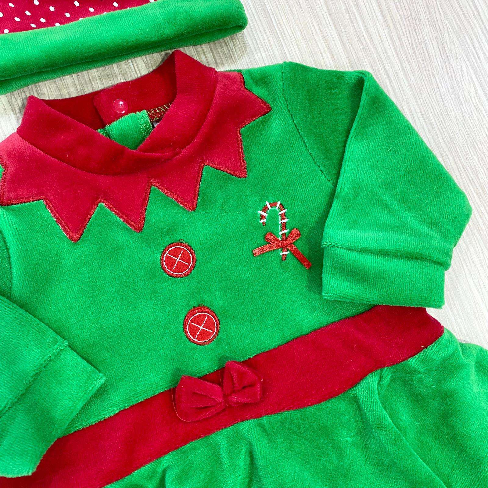 Vestito/tutina intera con cappellino da Elfo neonata/bambina in ciniglia, di colore verde e rosso e bianco.