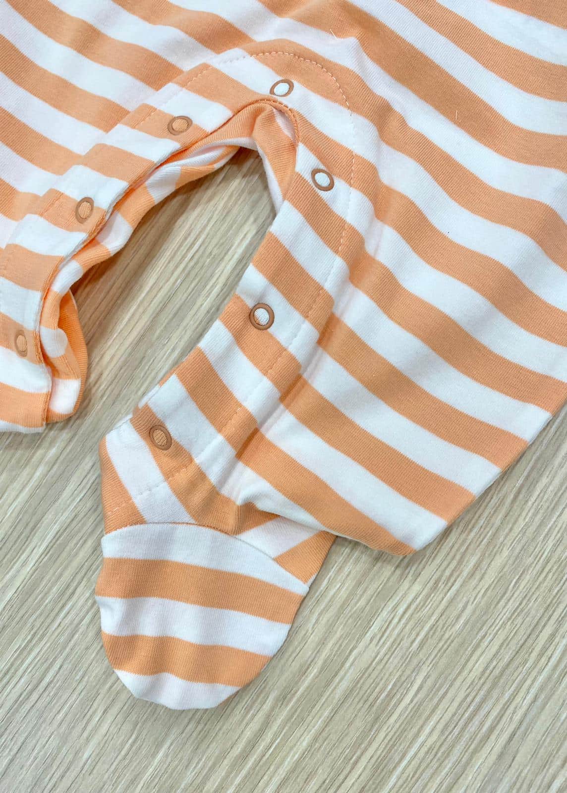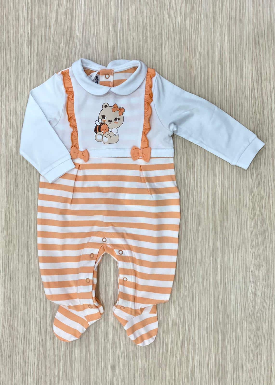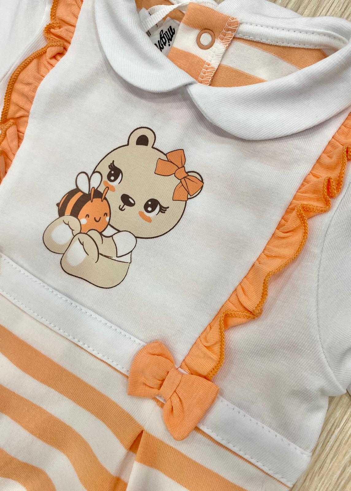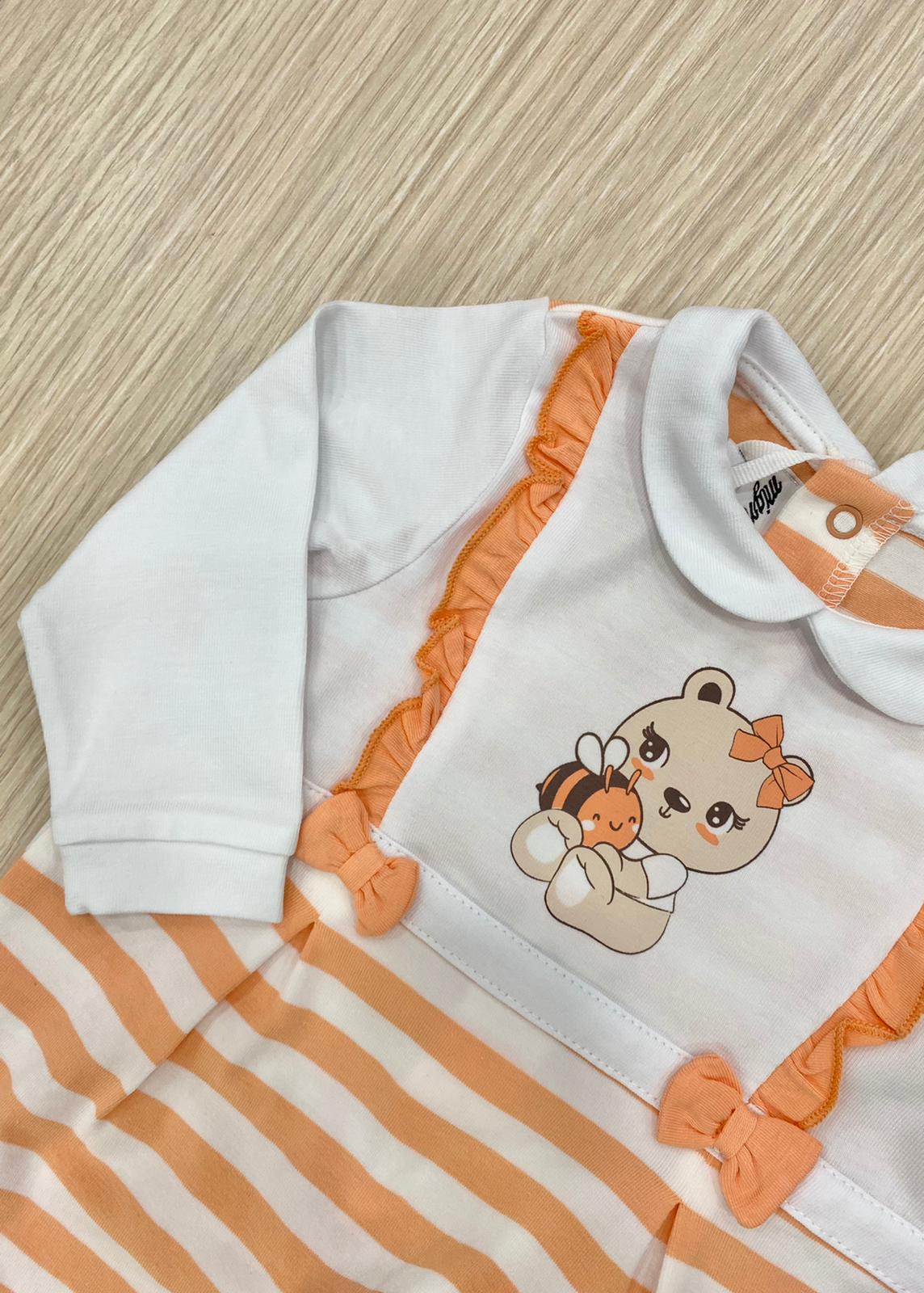 Tutina intera neonata/bambina in cotone, di colore arancione e bianco con stampa e applicazione di fiocchetti in tessuto.