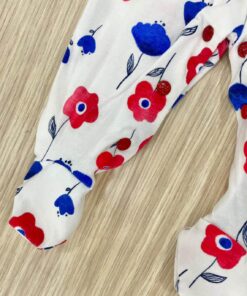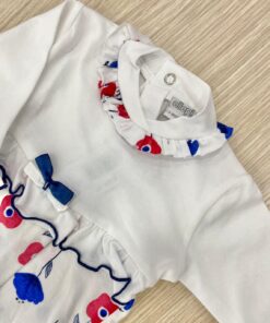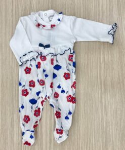 Tutina intera neonata in cotone, di colore bianco, blu e rosso con applicazione di fiocchettino.