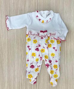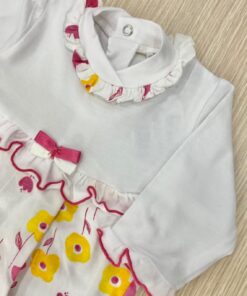 Tutina intera neonata in cotone, di colore bianco, fucsia e giallo con applicazione di fiocchettino.