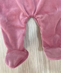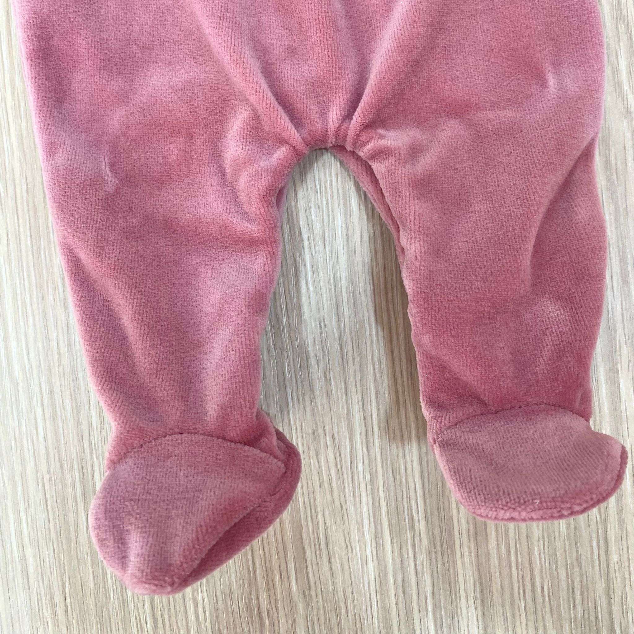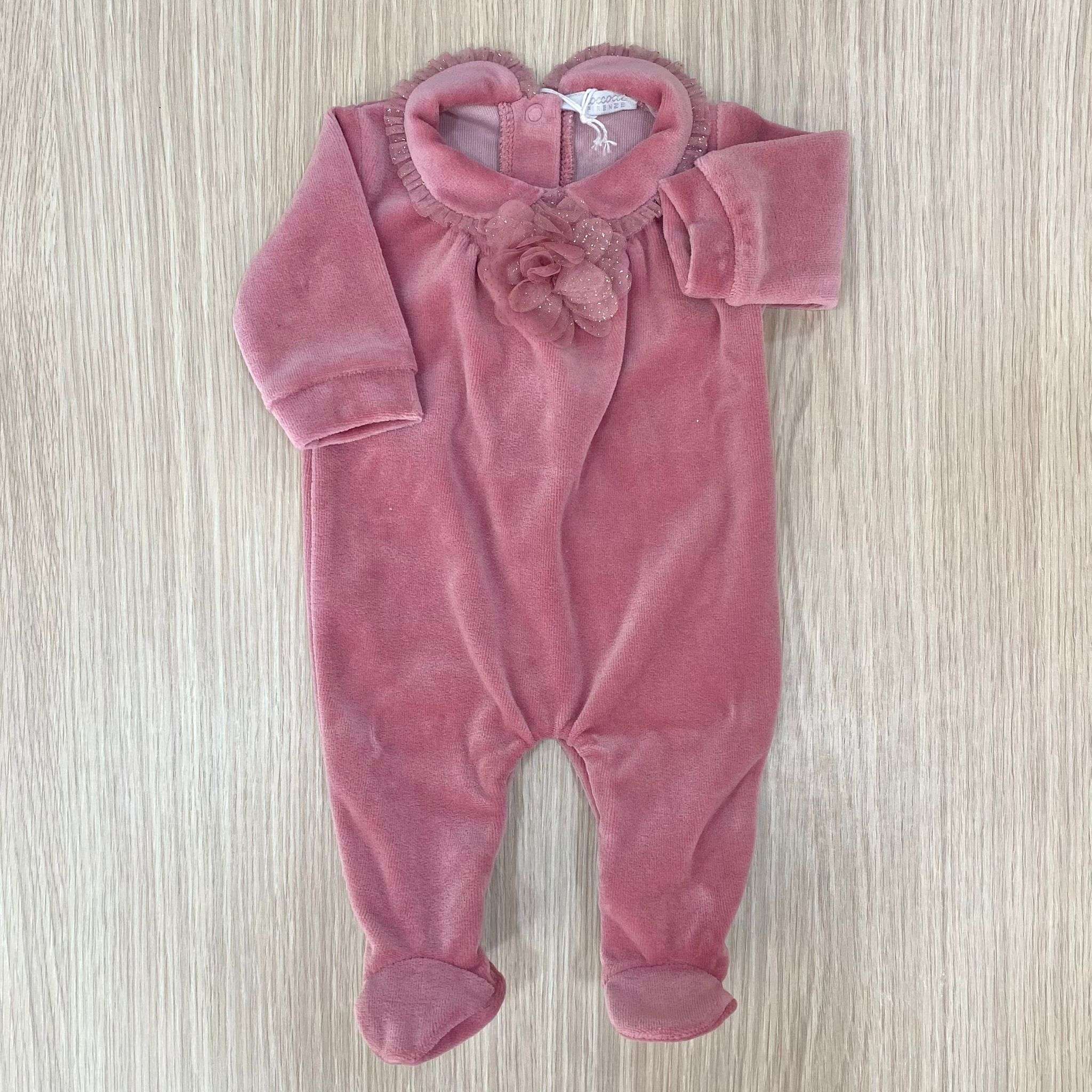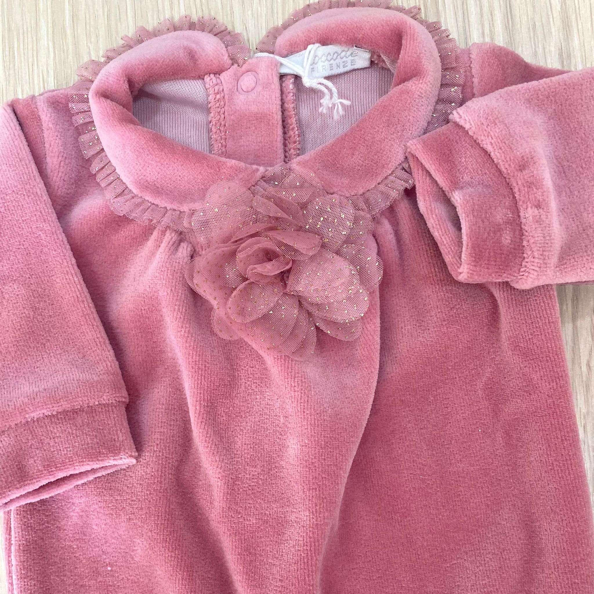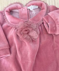 Tutina intera neonata in ciniglia, di colore ortensia, con applicazione in organza e dettagli glitterati.