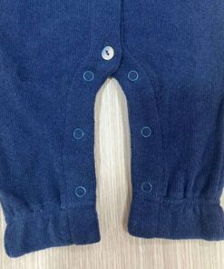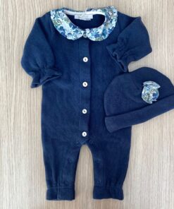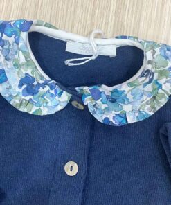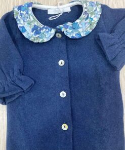 Tutina intera neonata in caldo cotone, di colore avio, con colletto fantasia floreale di vari colori. Tutina con dettaglio di bottoncini.
