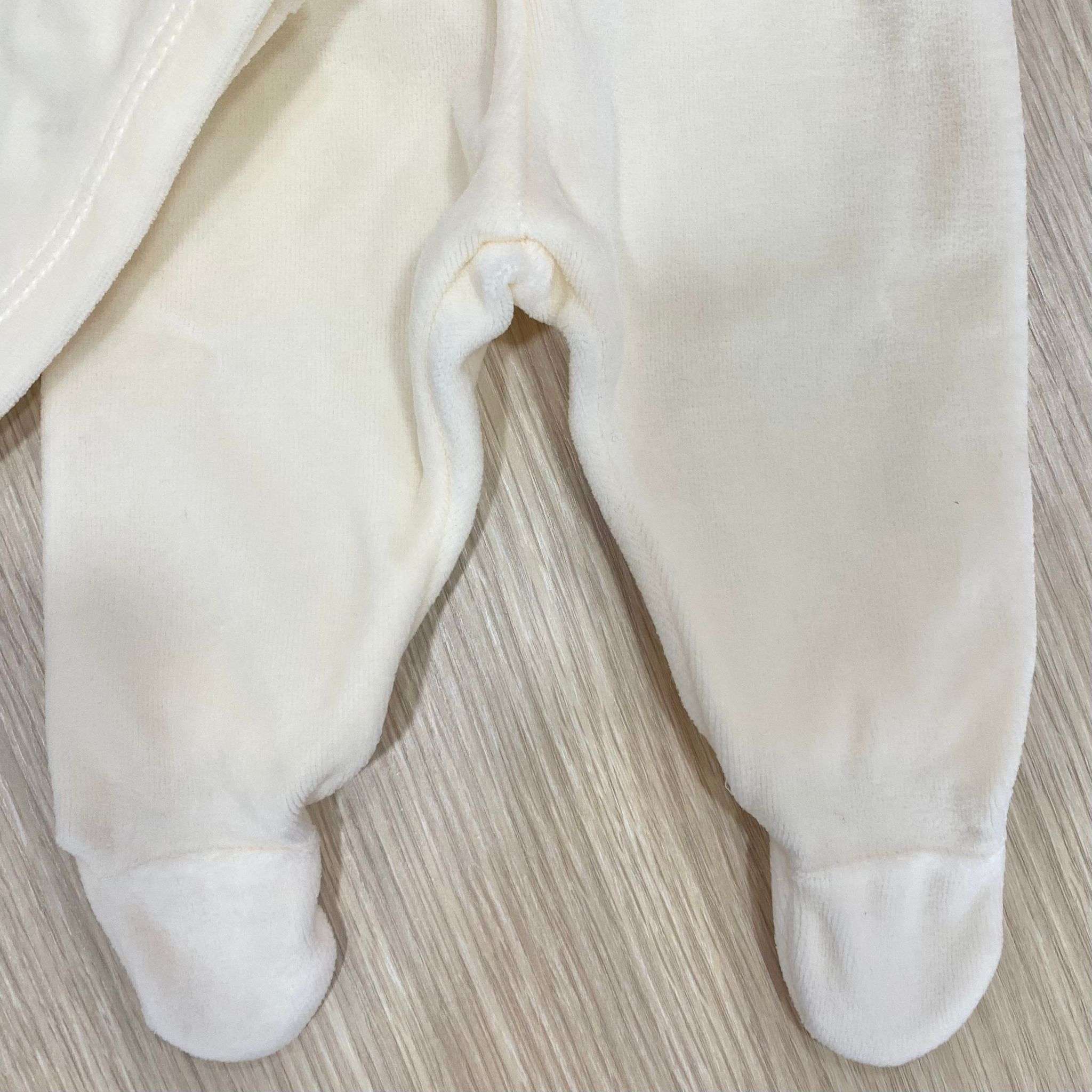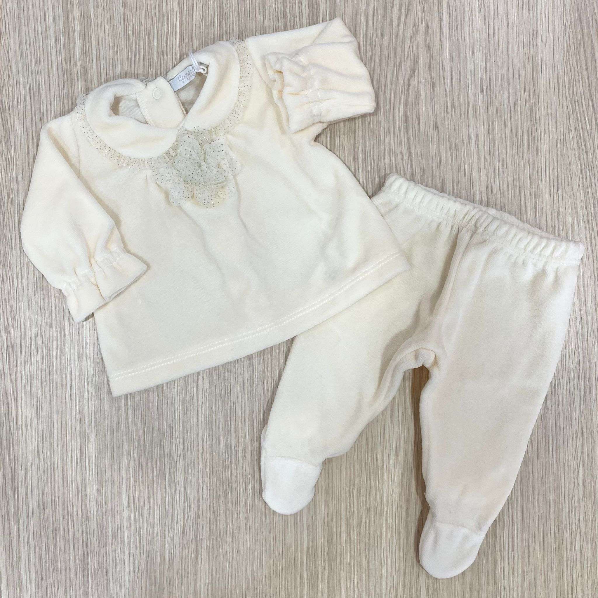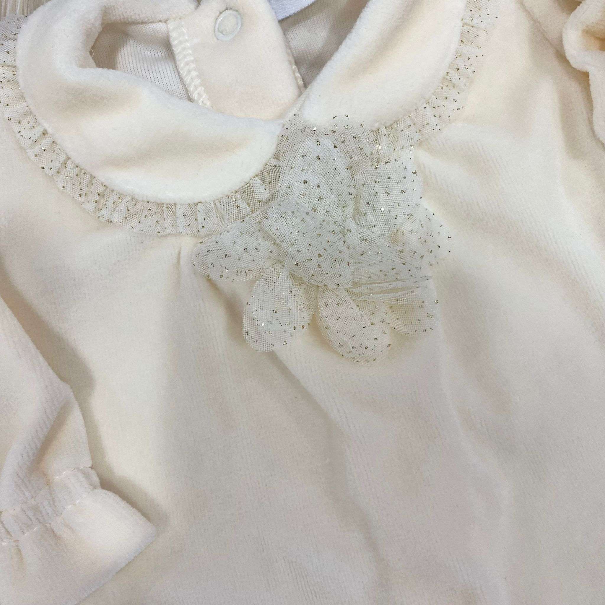 Vestina due pezzi neonata in ciniglia, di colore burro e oro, con applicazione in organza.
