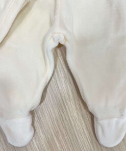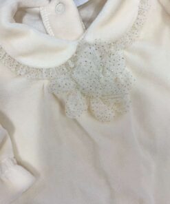 Vestina due pezzi neonata in ciniglia, di colore burro e oro, con applicazione in organza.