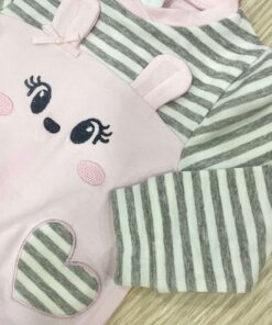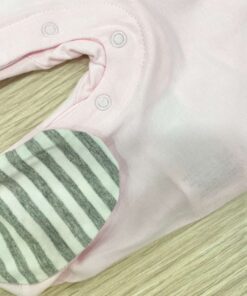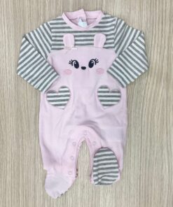 Tutina intera neonata in cotone, di colore rosa, panna e grigio, con dettaglio in rilievo.