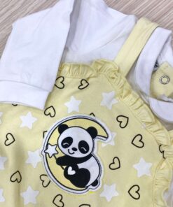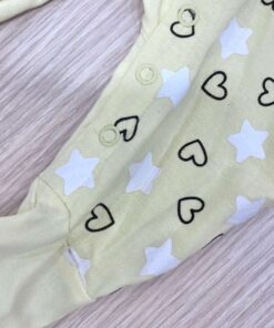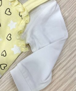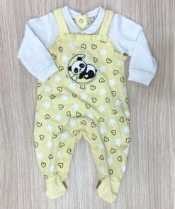Tutina intera neonata in cotone, di colore giallo e bianco, con disegni di colore bianco e nero.