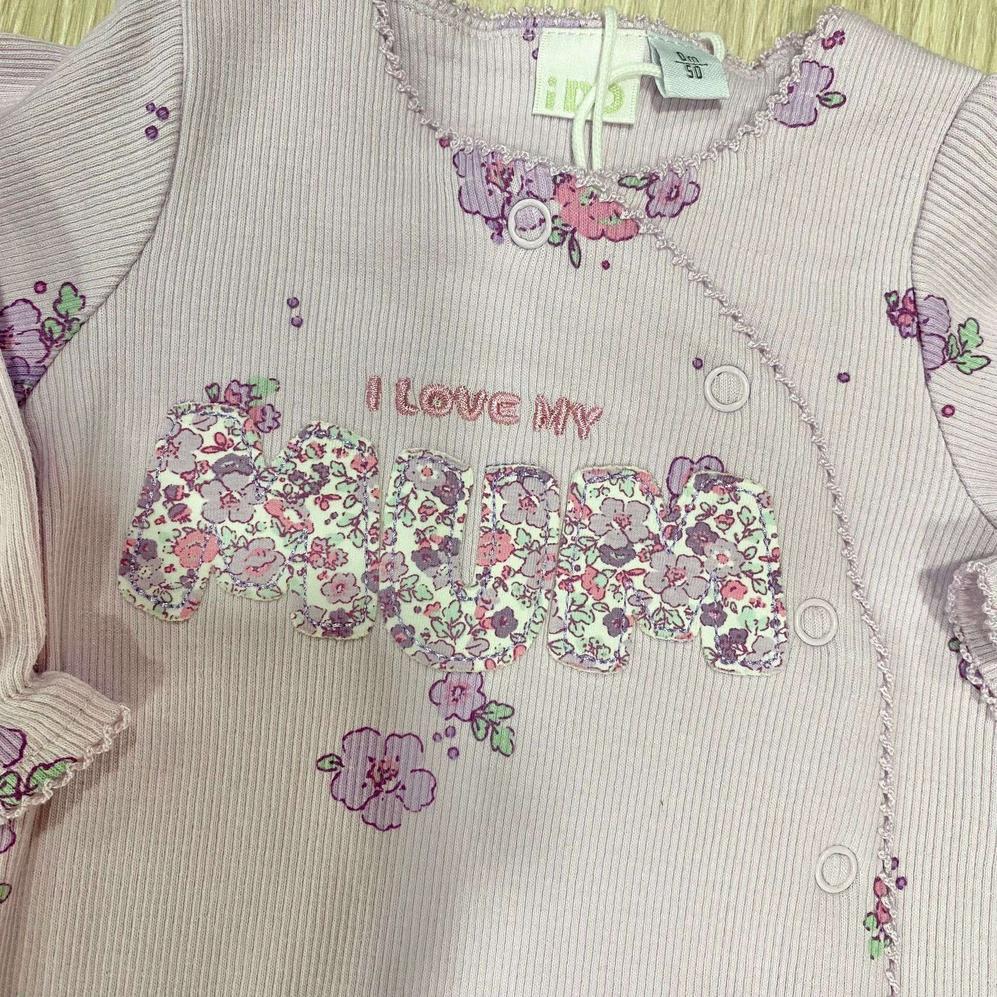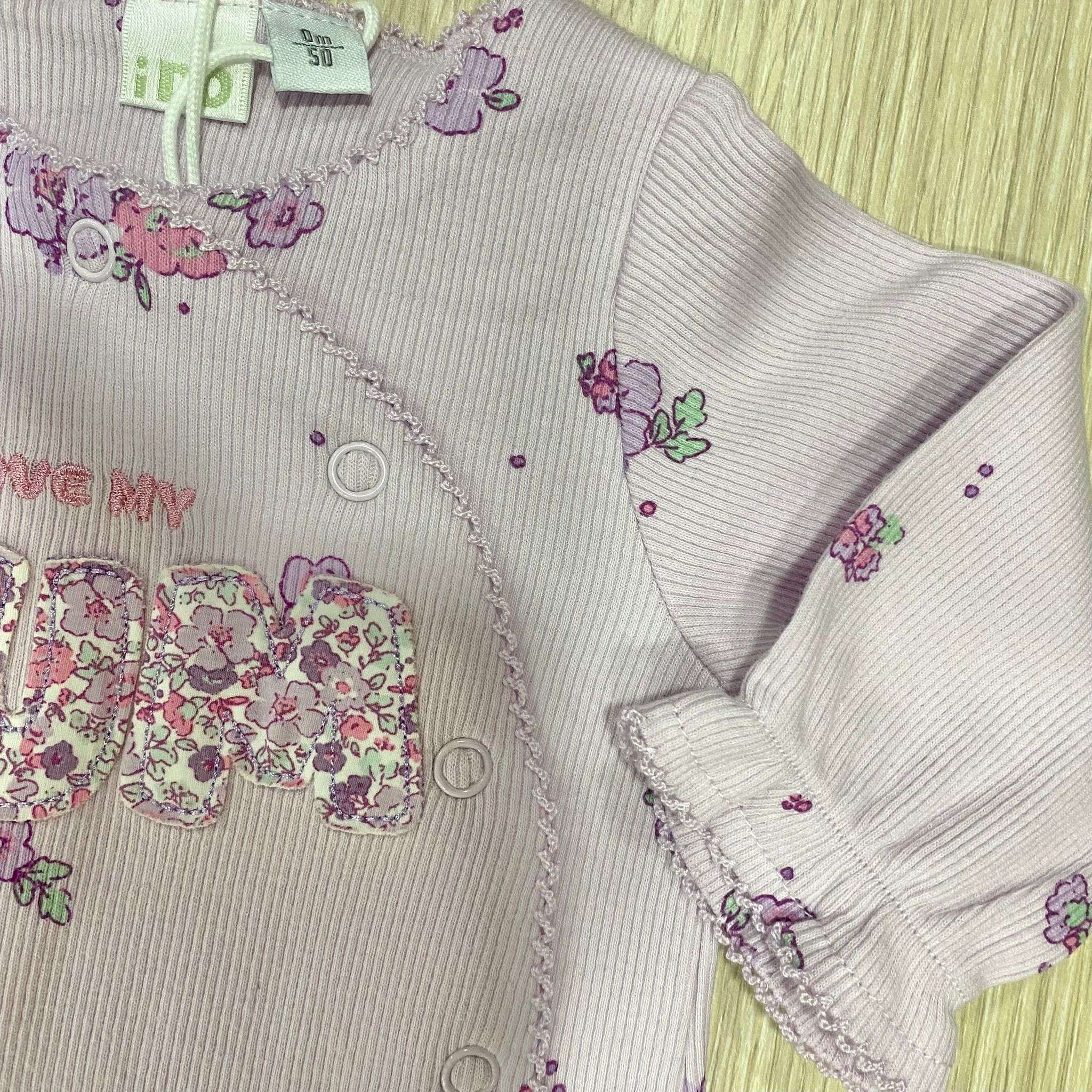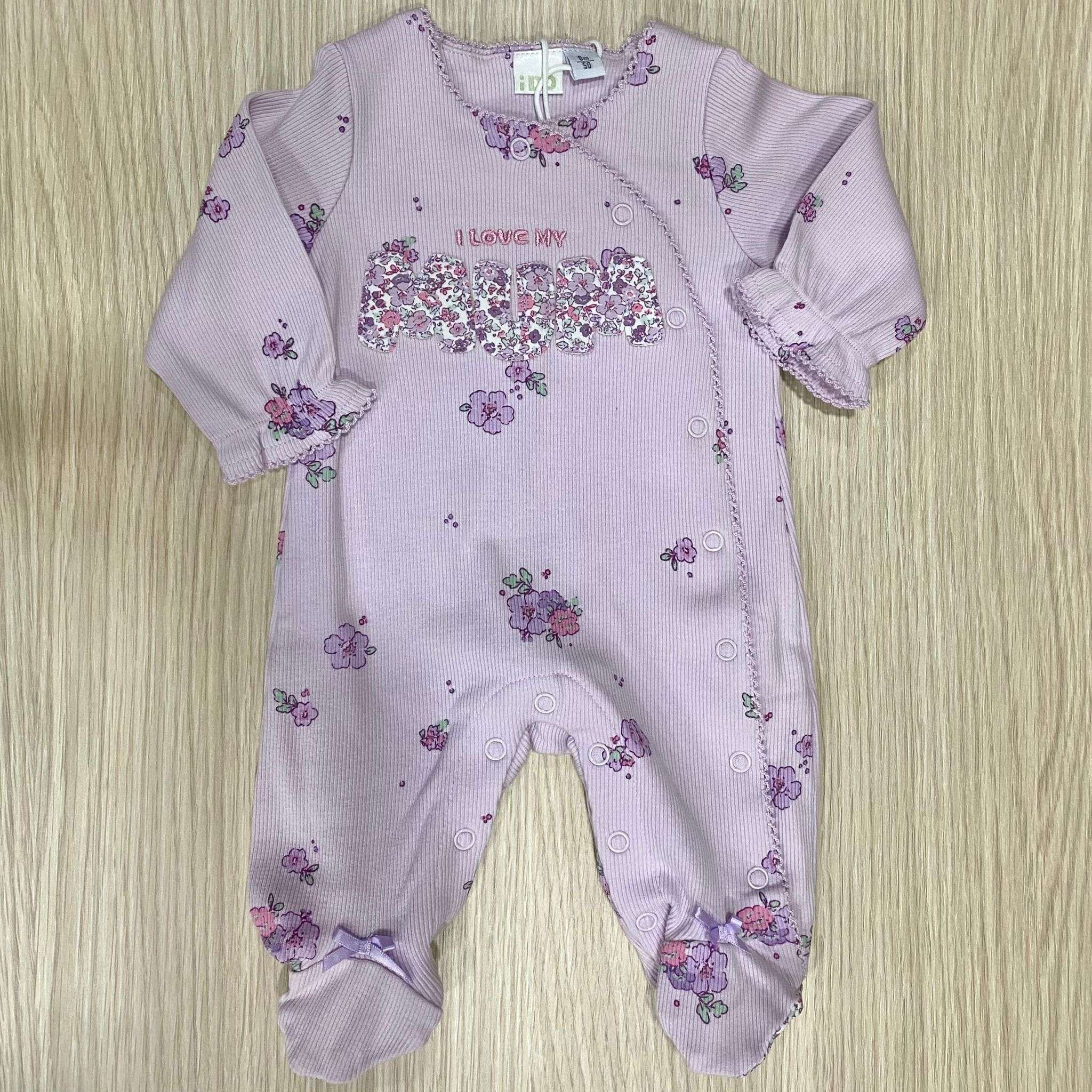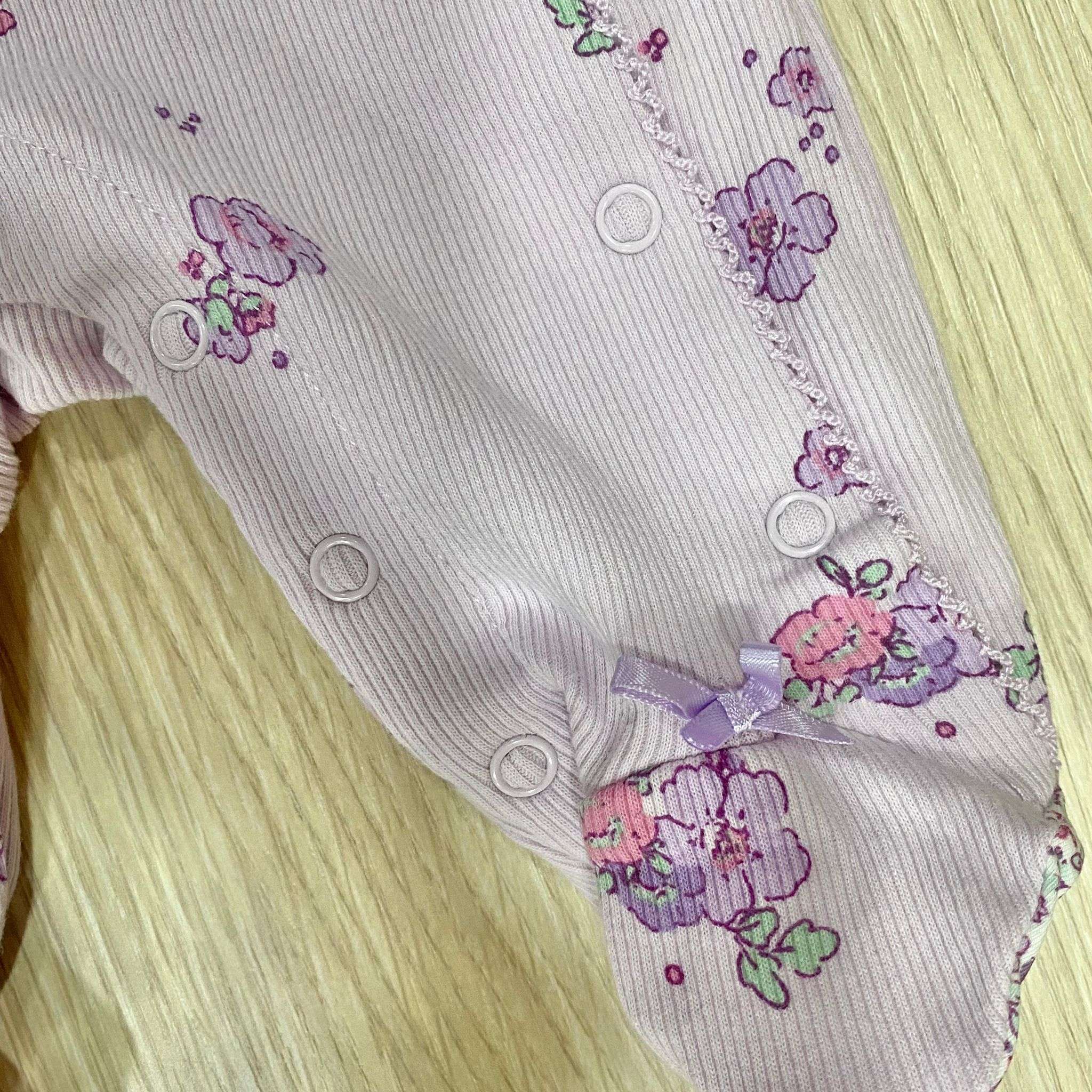 Tutina intera neonata in cotone a costine, di colore lilla e bianco, disegni floreali di vari colori. Tutina con apertura di bottoncini sul davanti.