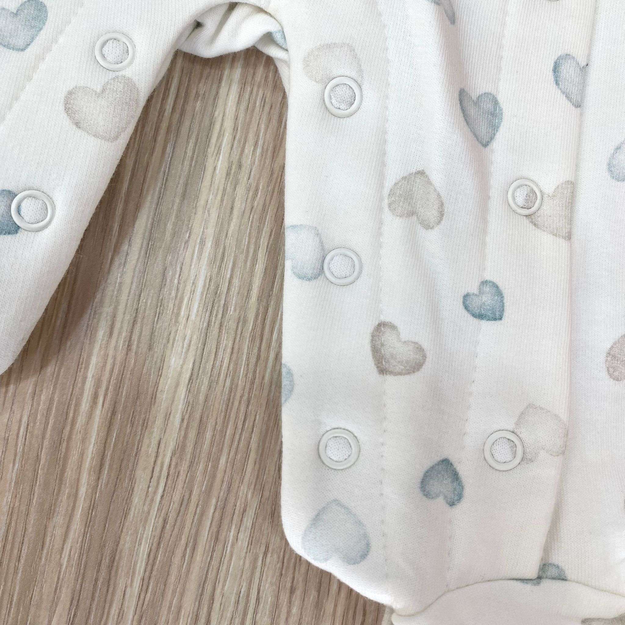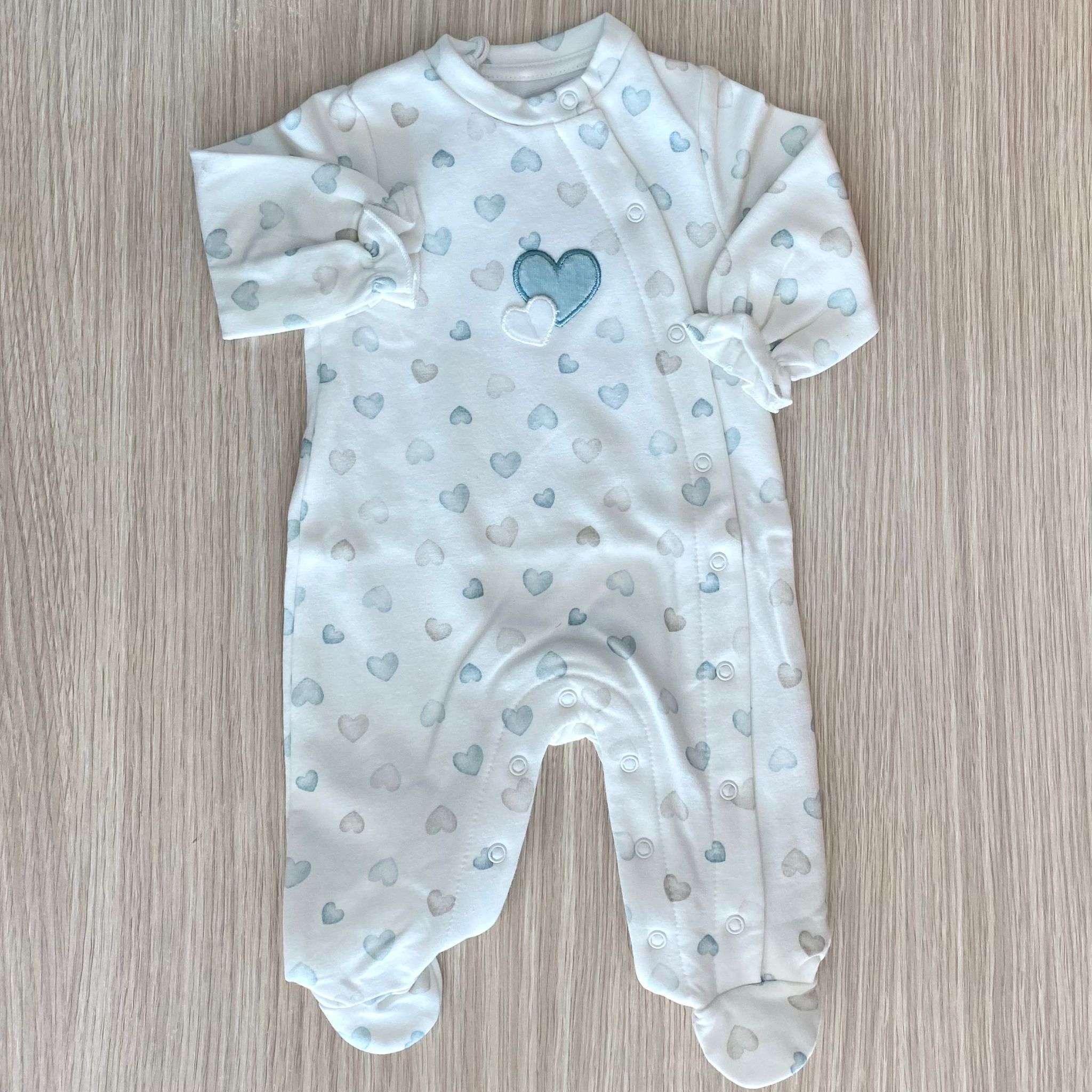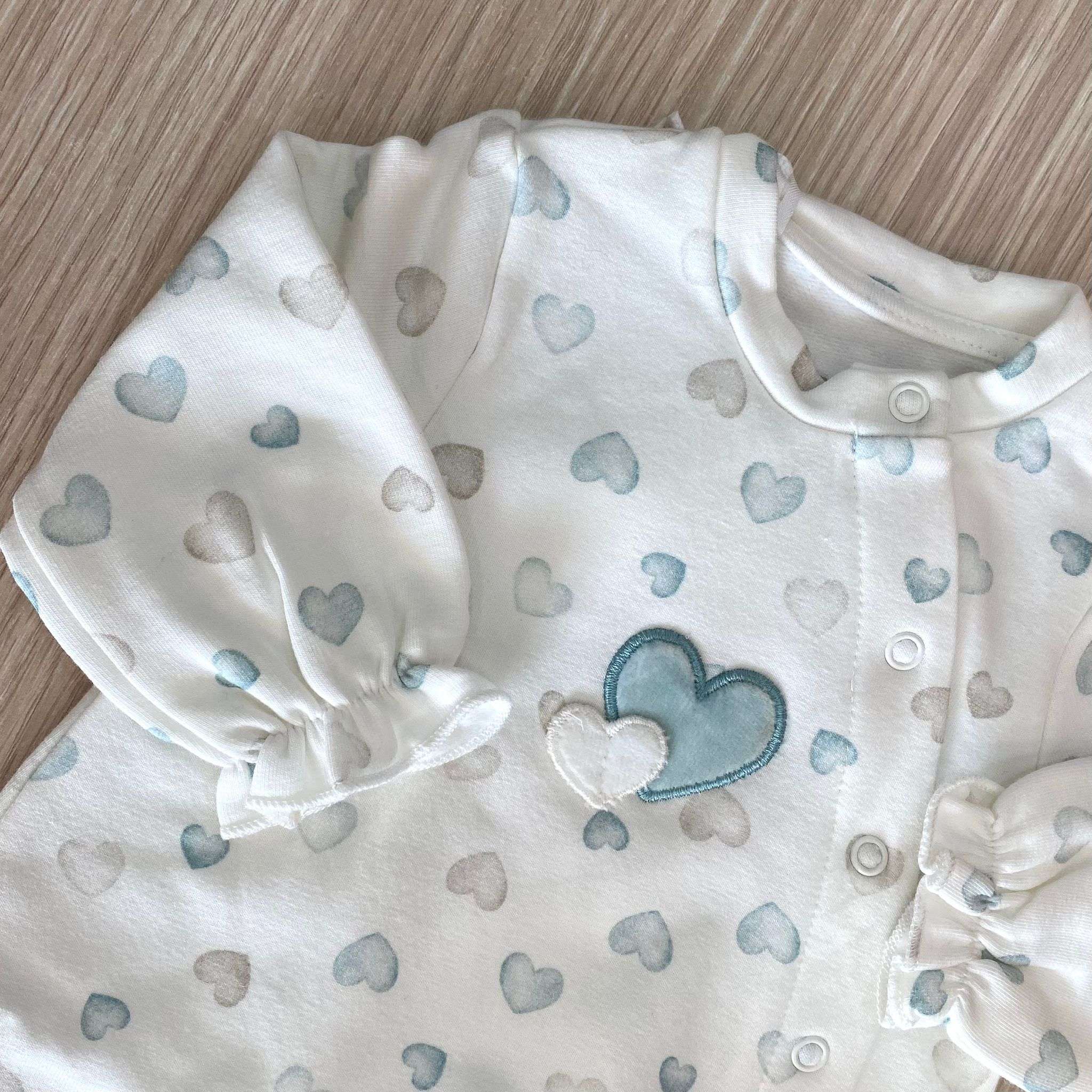 Tutina intera neonata in cotone felpato, di colore panna e verde acqua e beige, con apertura antipanico.