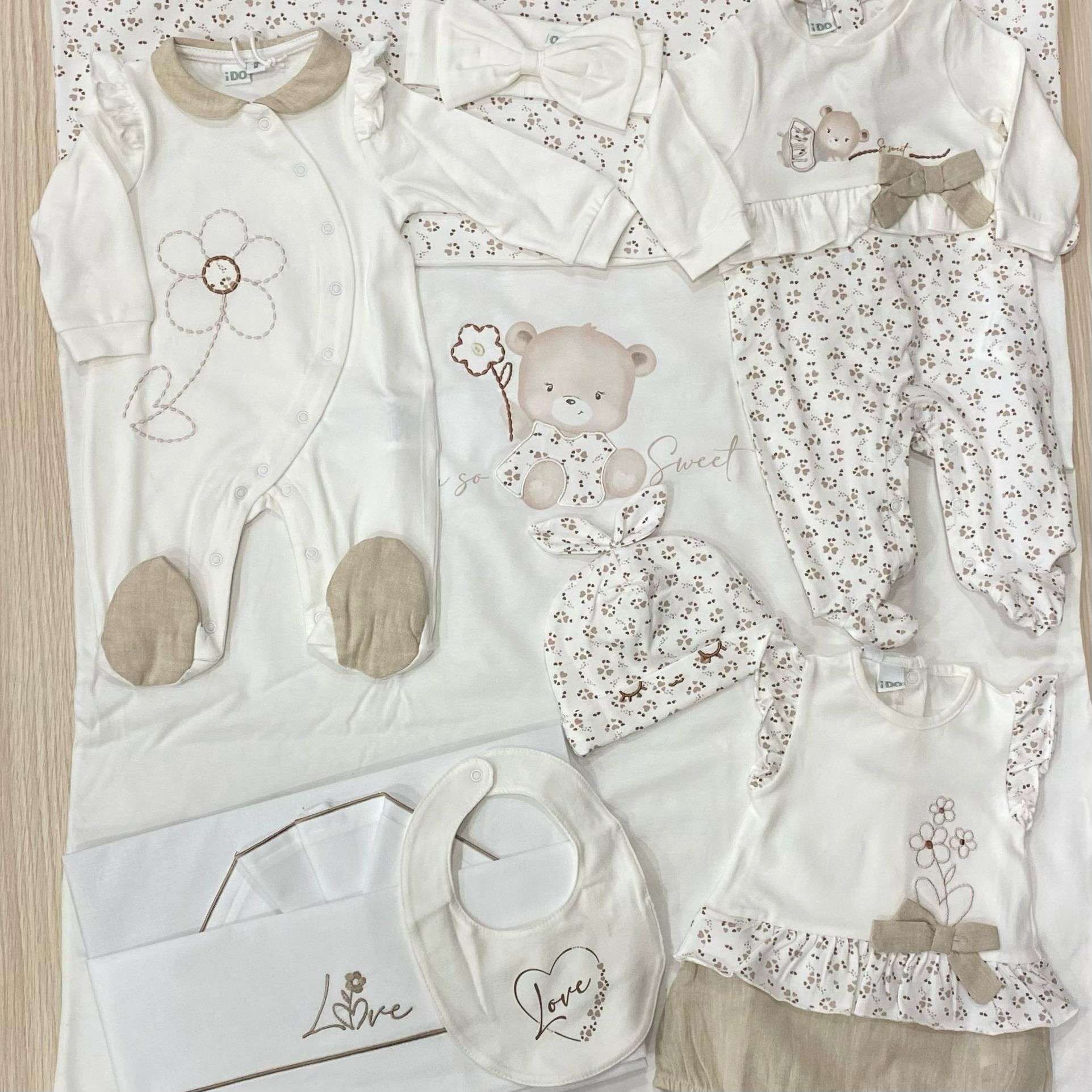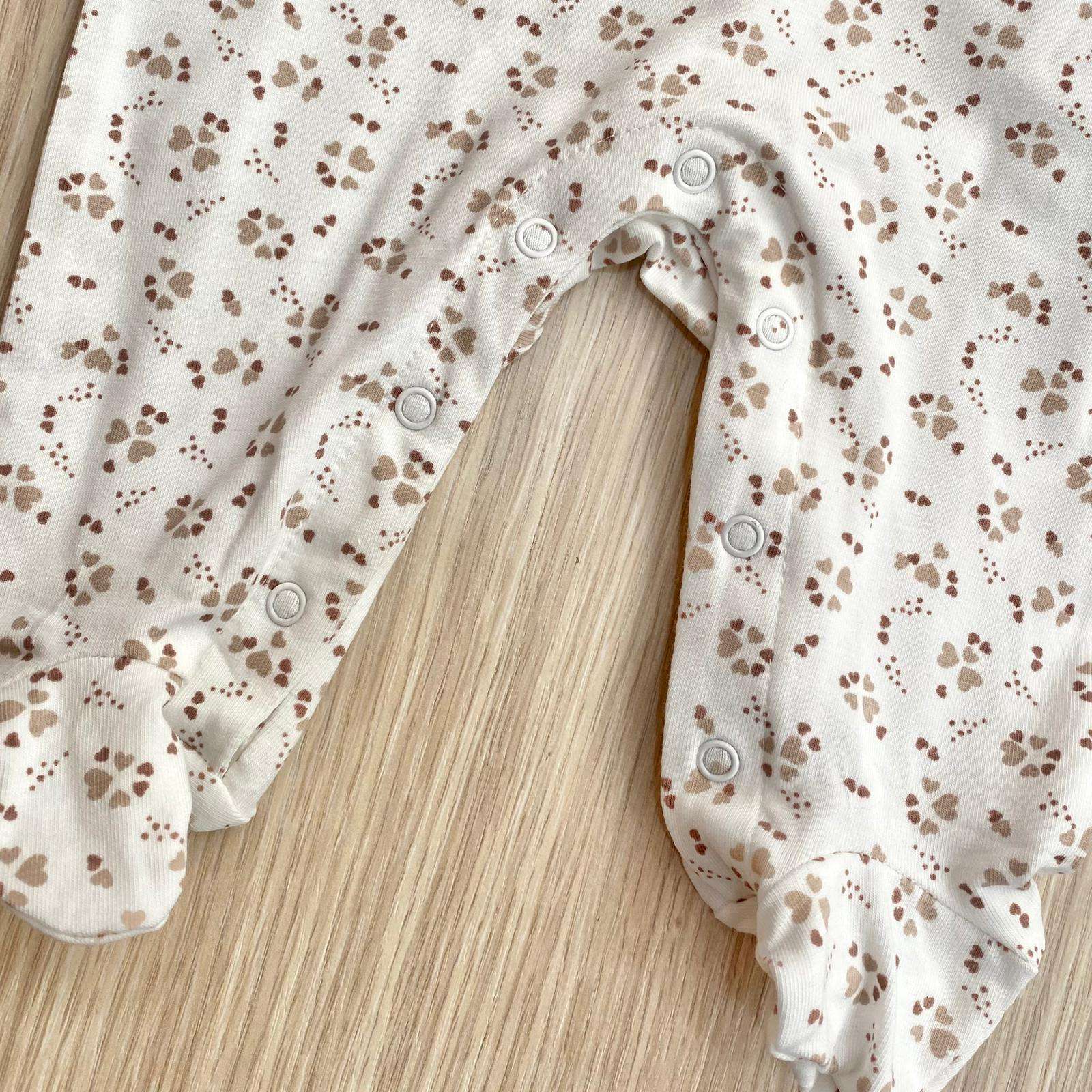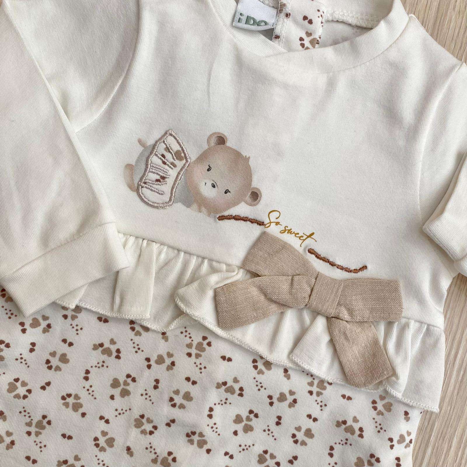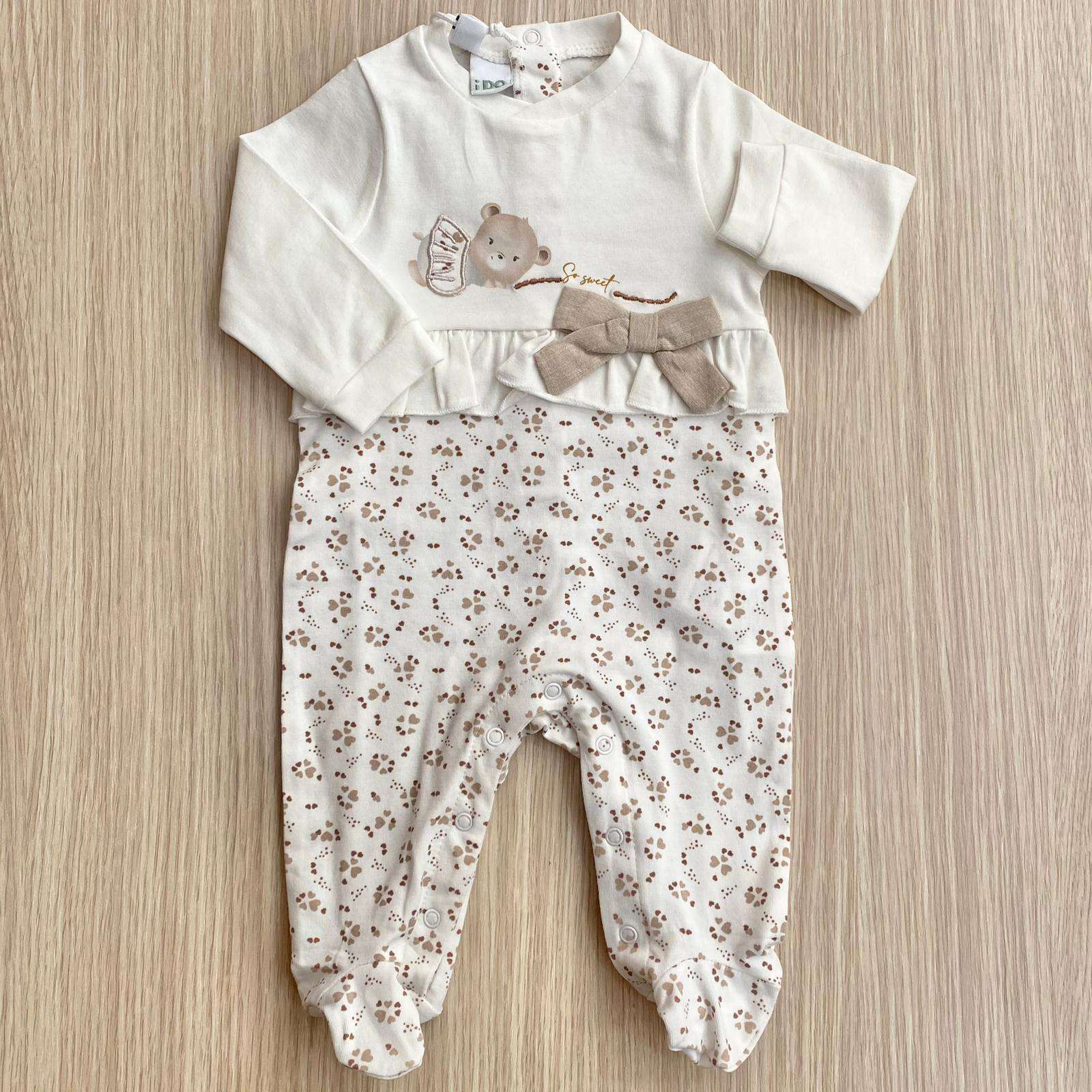 Tutina intera neonata in cotone, di colore panna e beige, con dettagli ricamati e applicazione di fiocchetto in tessuto.