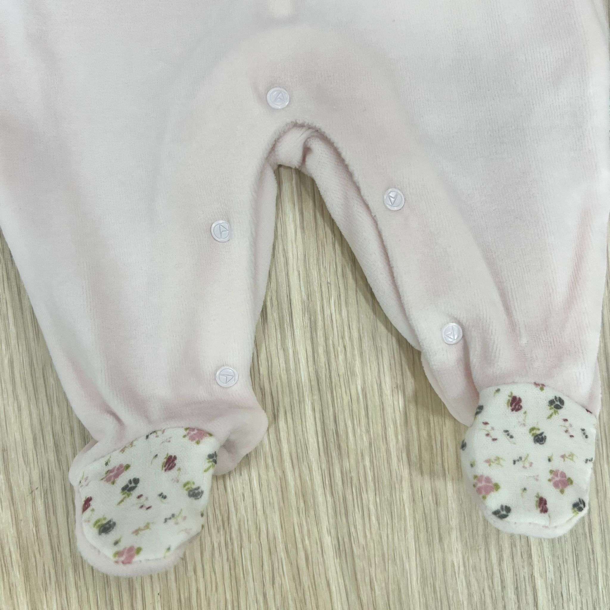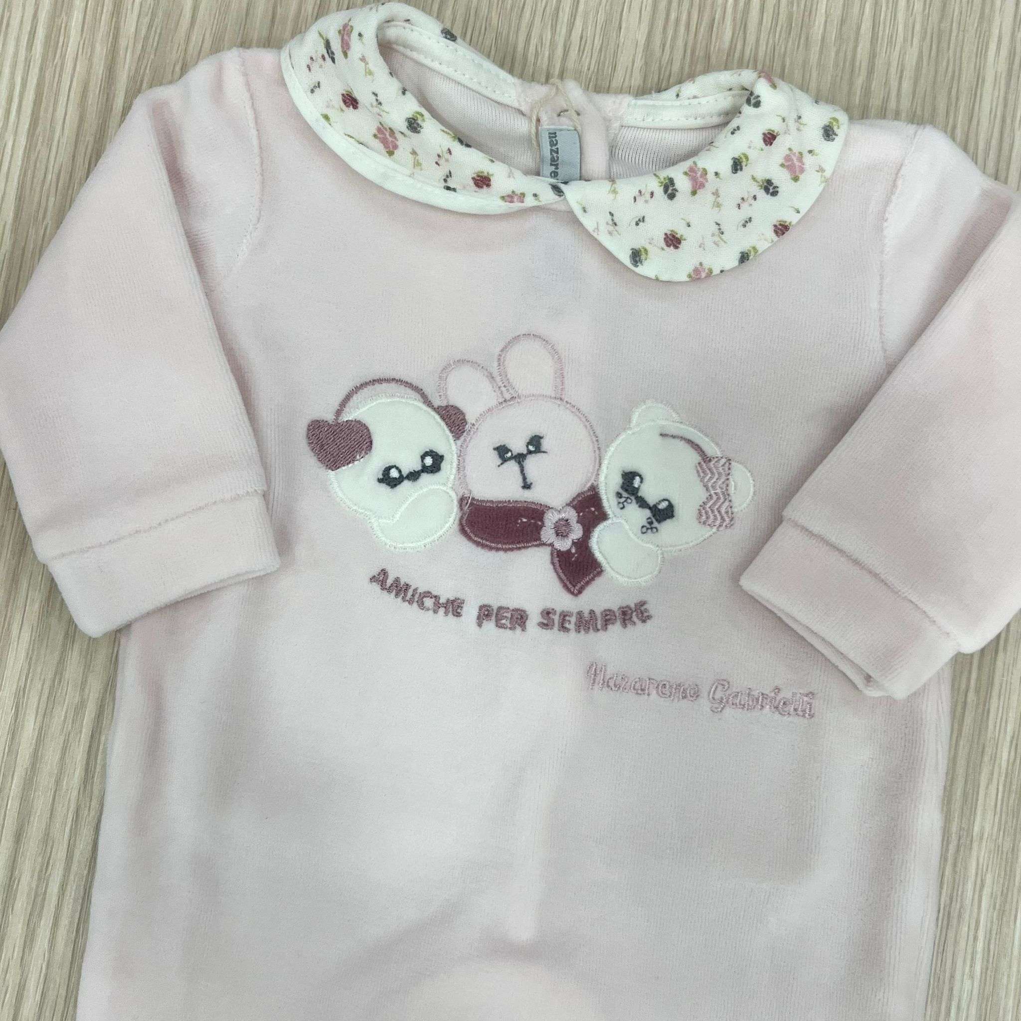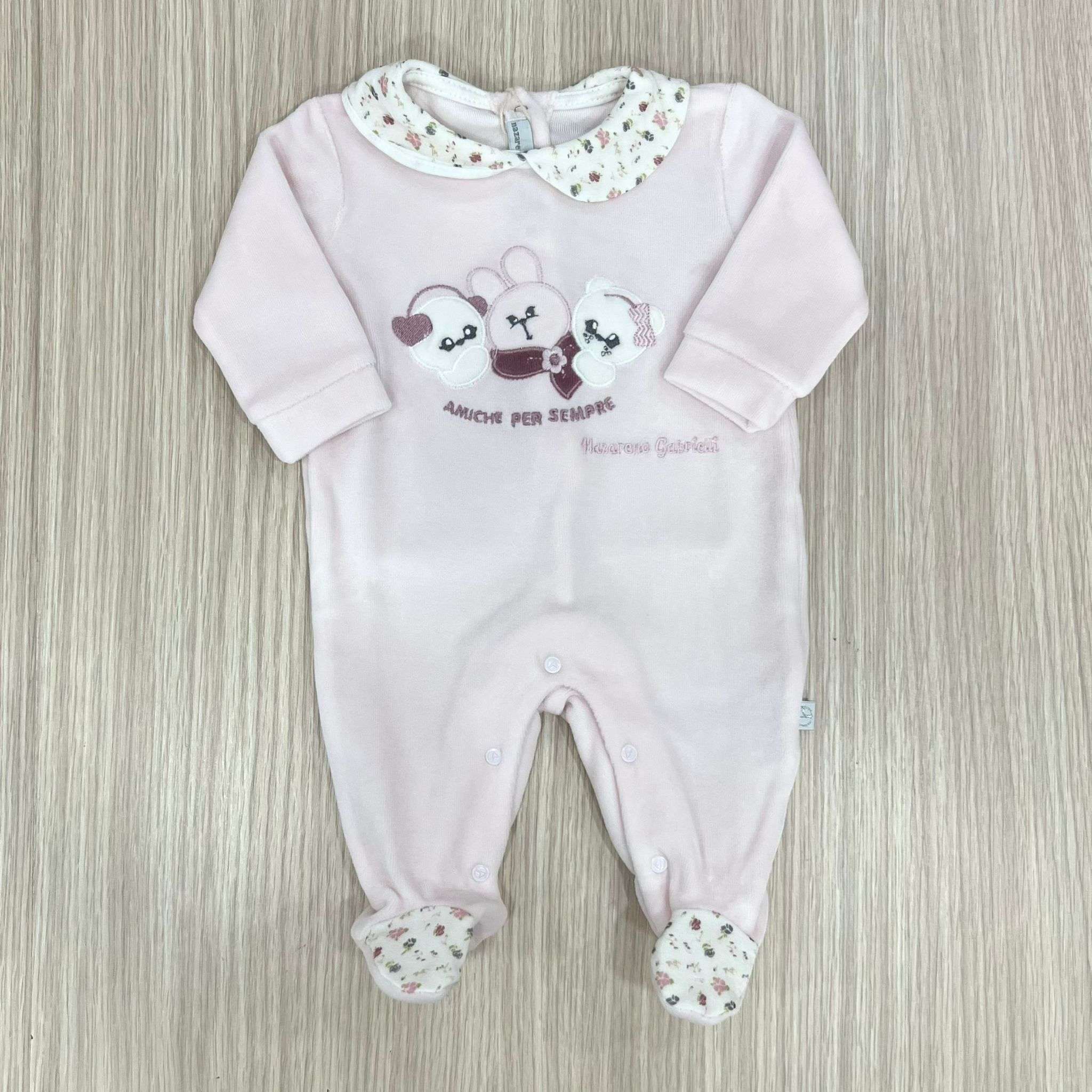 Tutina intera neonata in ciniglia di colore rosa e panna, con disegno e scritta ricamata e dettagli floreali di vari colori.