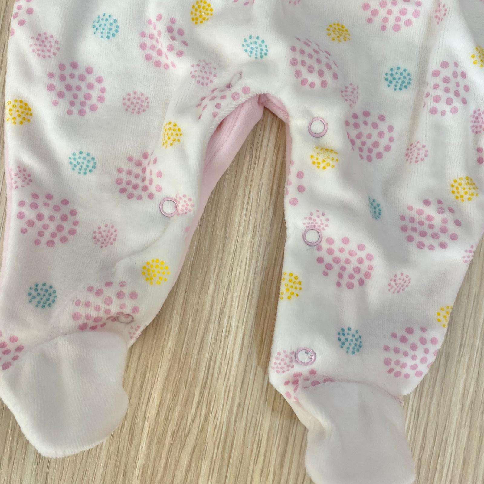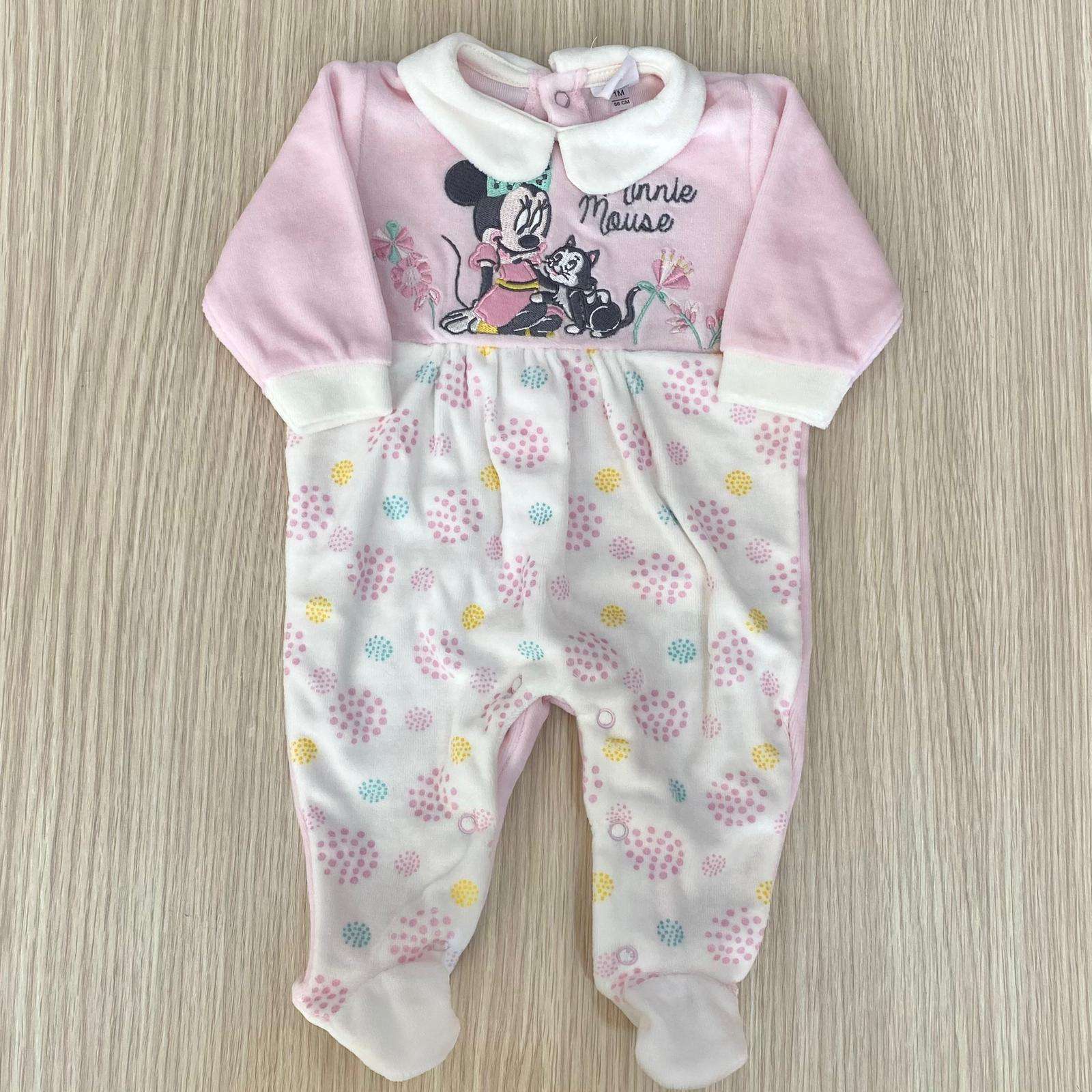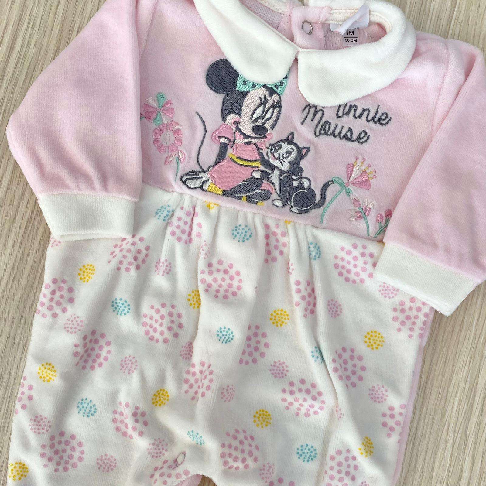 Tutina intera neonata in ciniglia, di colore panna e rosa, con disegno Minnie ricamato e dettagli di vari colori.
