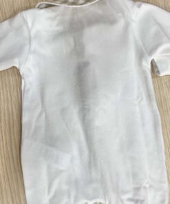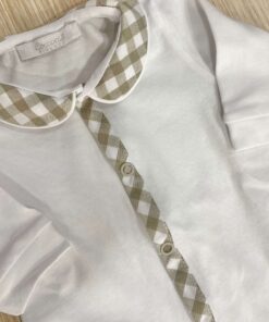 Tutina intera neonato in cotone bio, di colore bianco e sabbia.