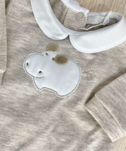 Tutina intera neonato in cotone bio, di colore sabbia e bianco, con disegno ricamato.