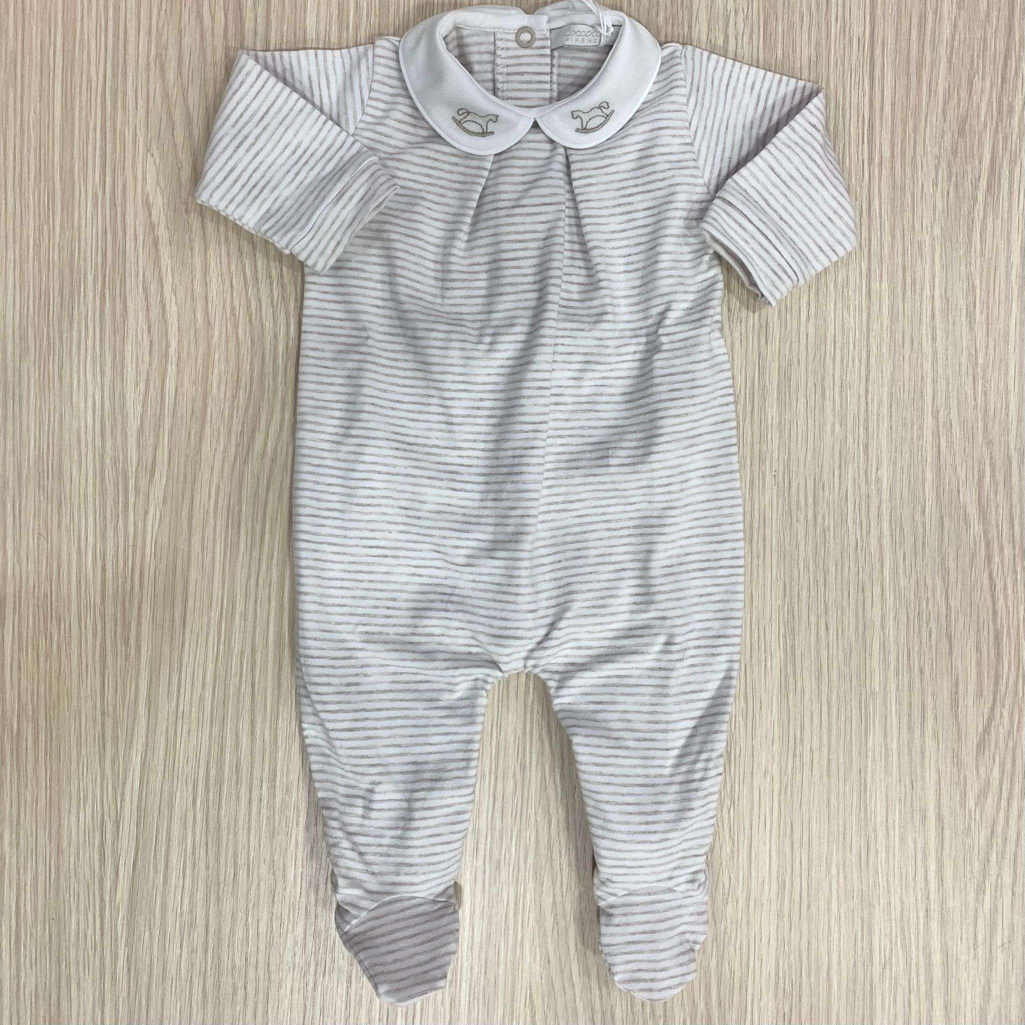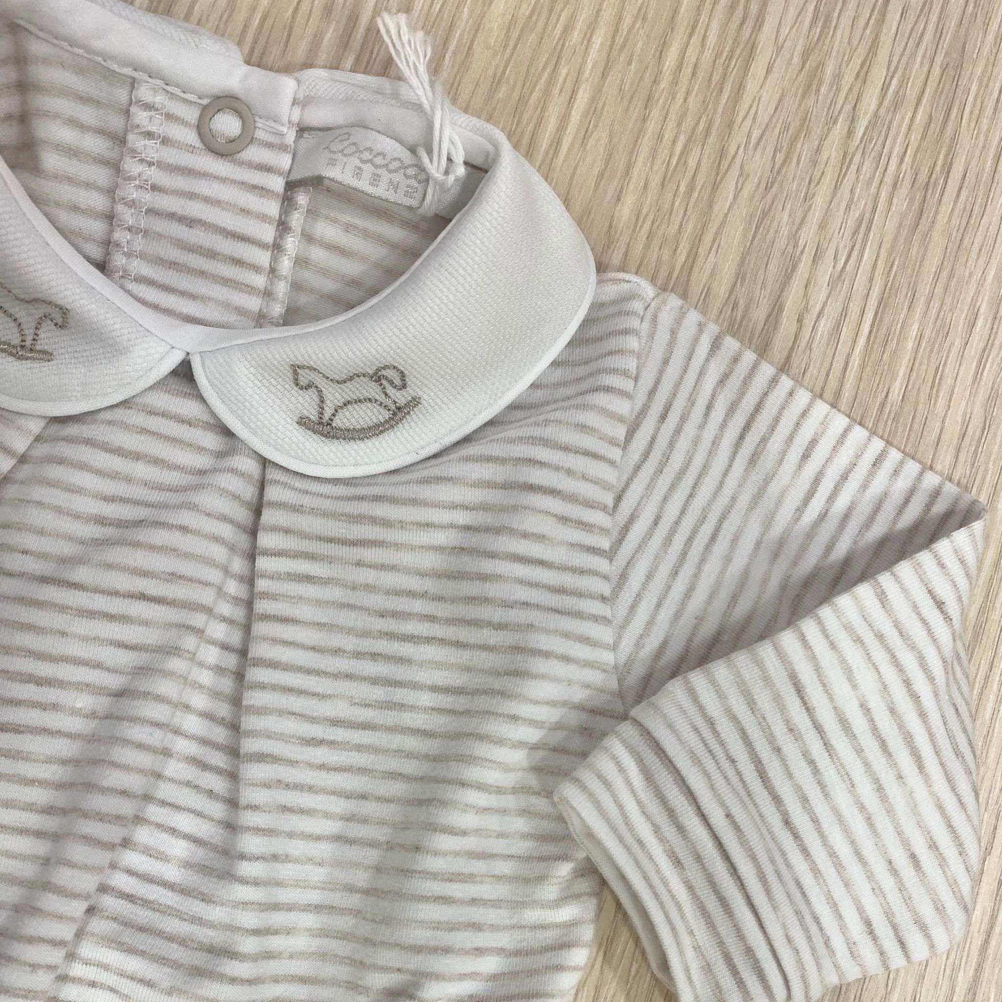 Tutina intera neonato in cotone bio, di colore sabbia e bianco, con disegno ricamato sul colletto.