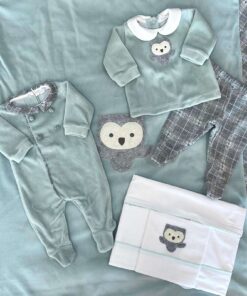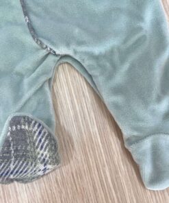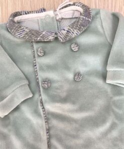 Tutina intera neonato in ciniglia, con tessuto tartan in caldo cotone, di colore salvia e grigio, con applicazione di bottoncini.