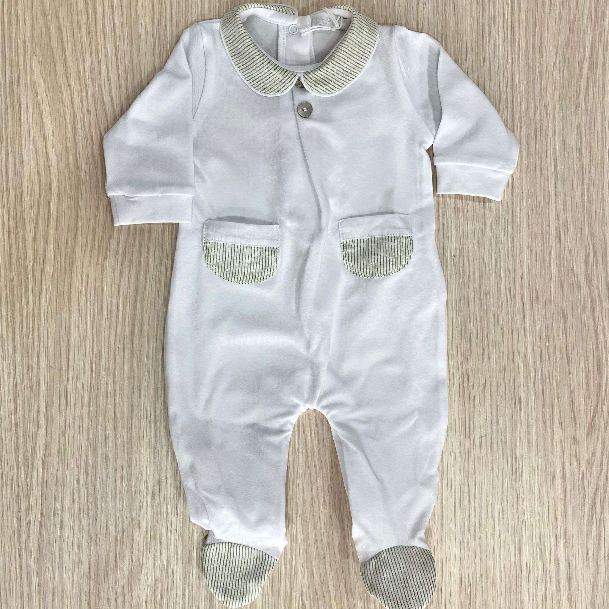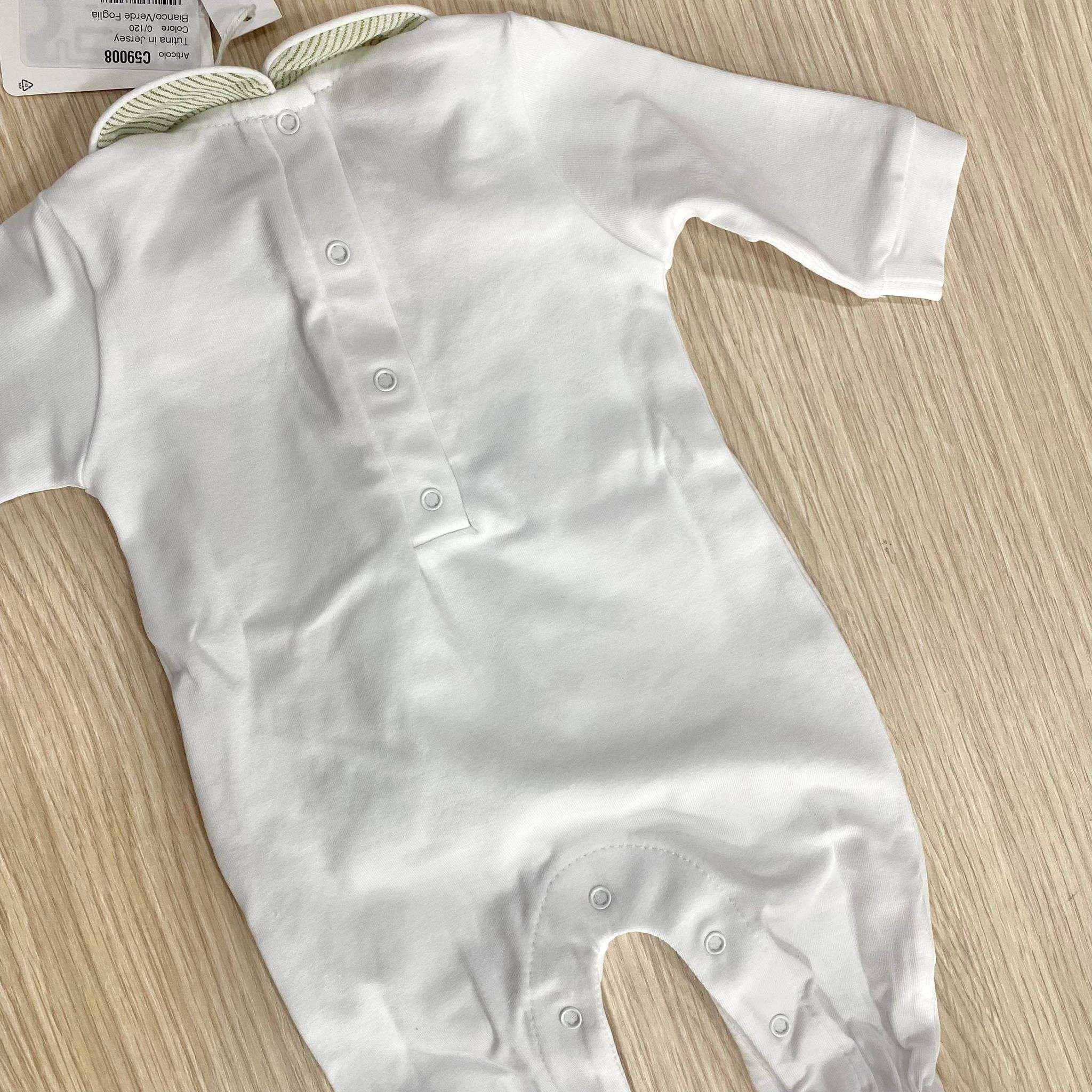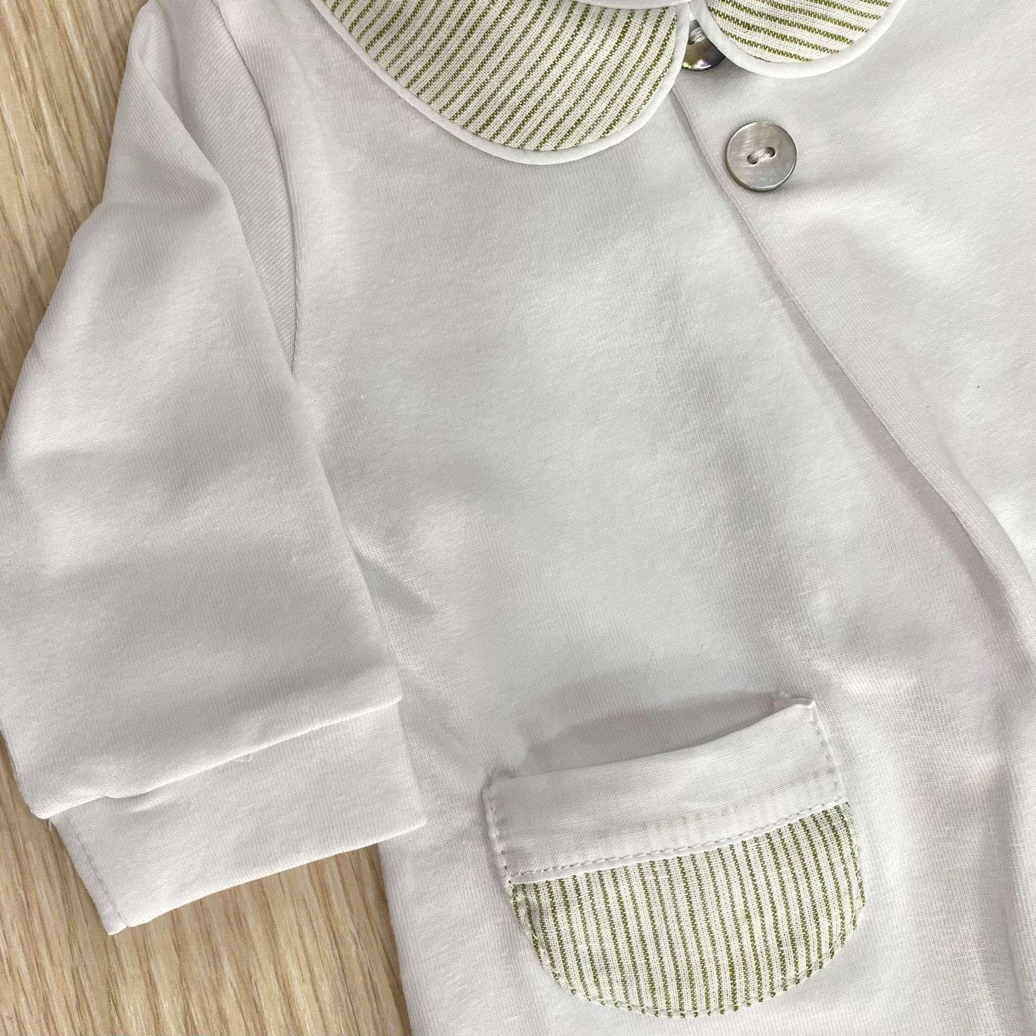 Tutina intera neonato in cotone bio, di colore bianco e verde, con dettaglio di tasche e applicazione di bottoncini.