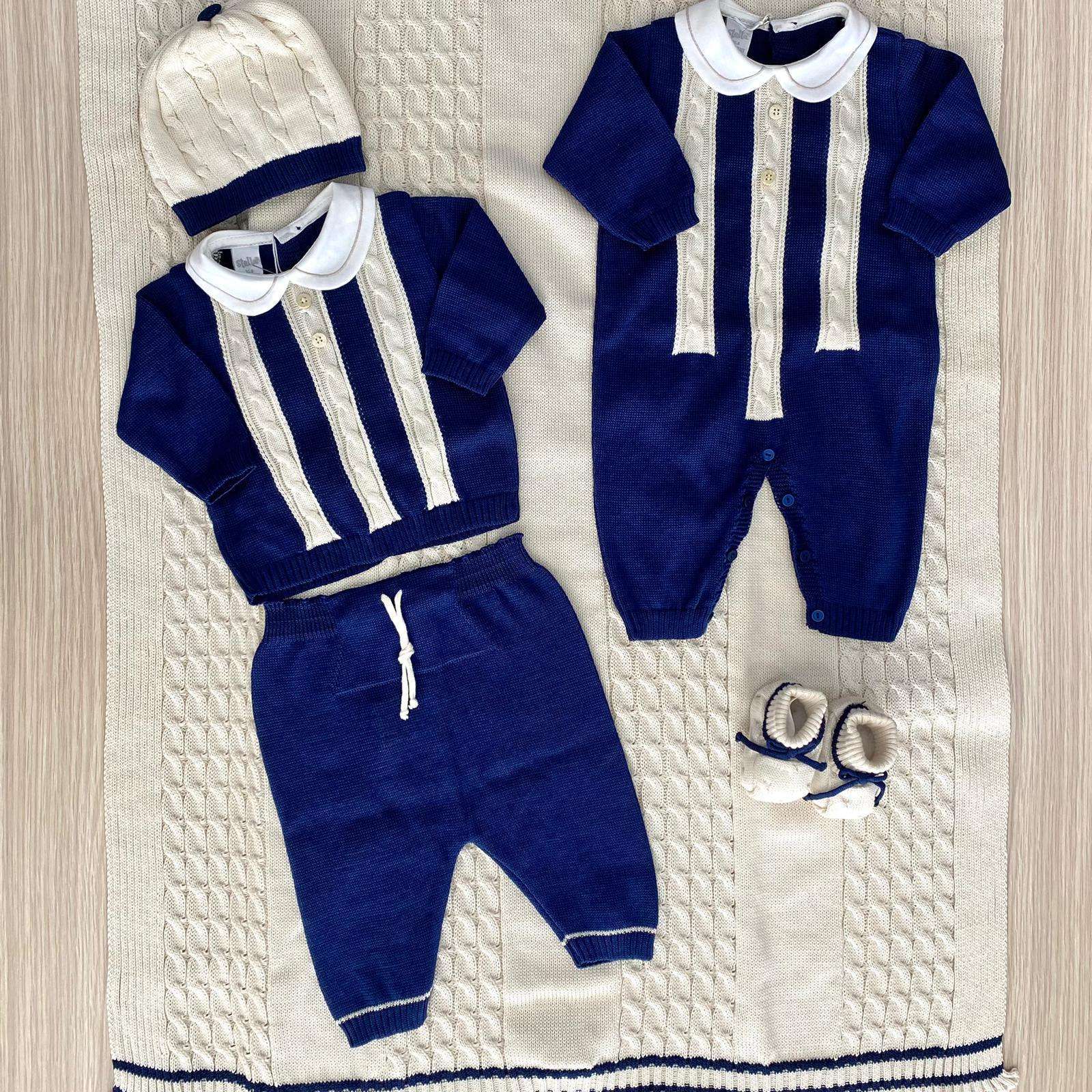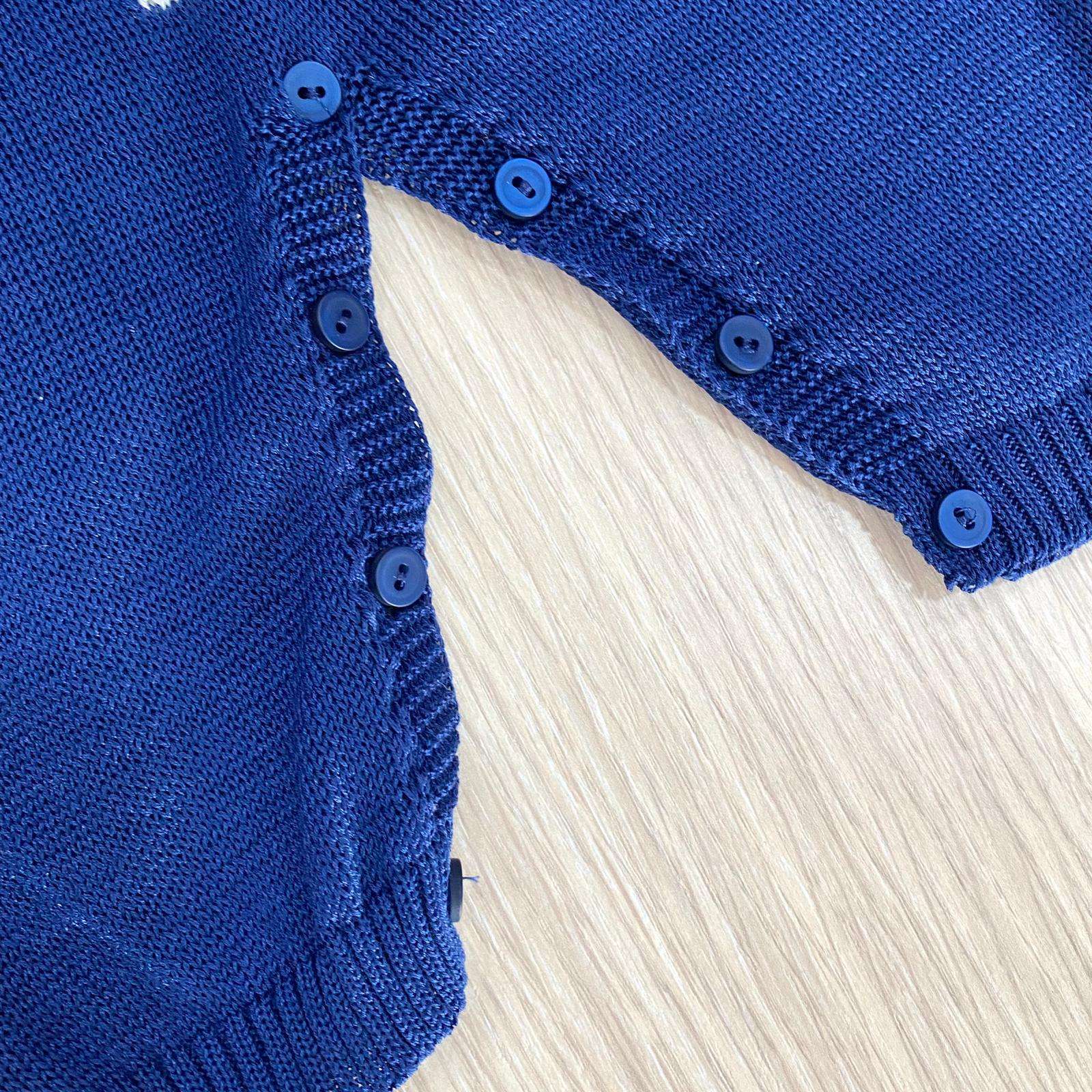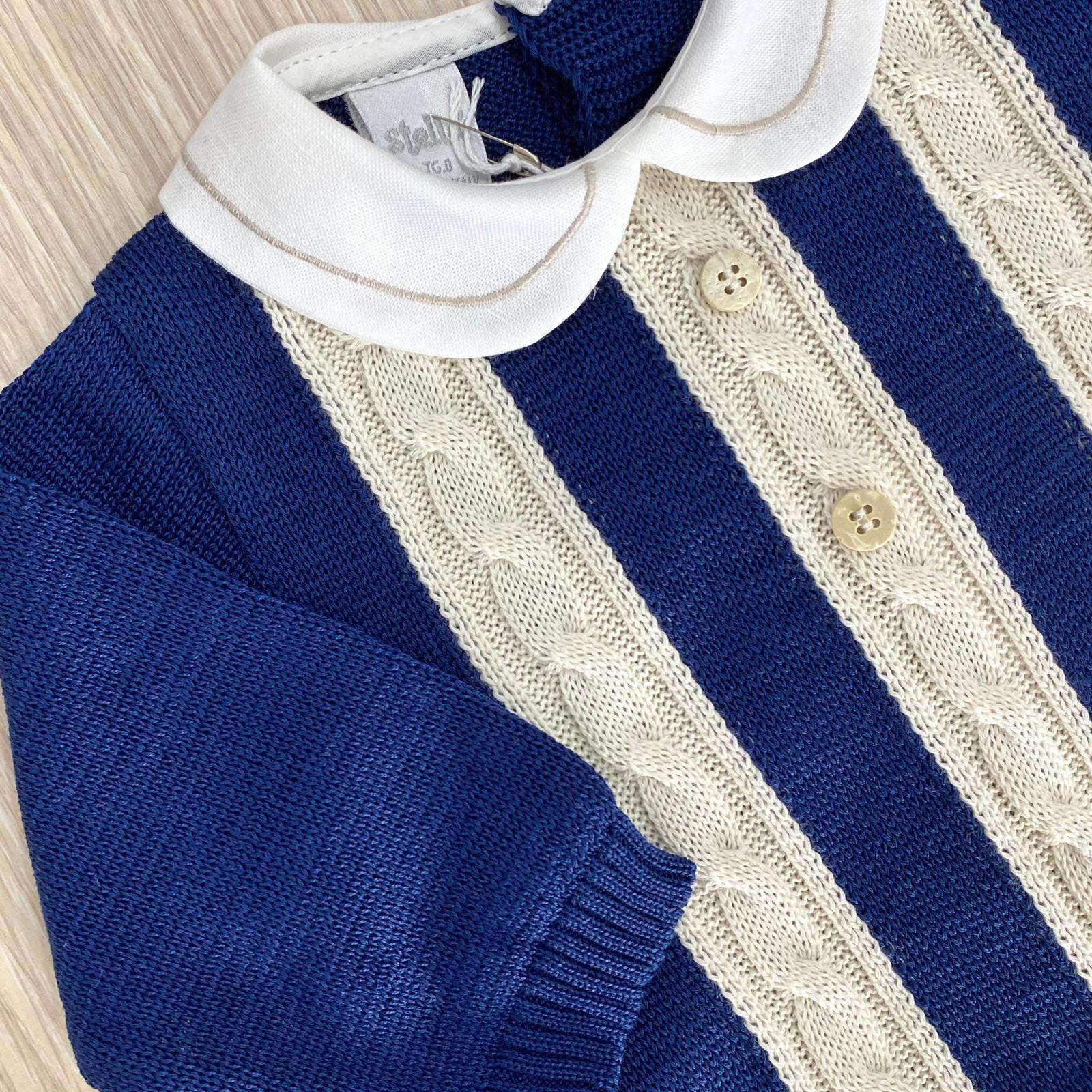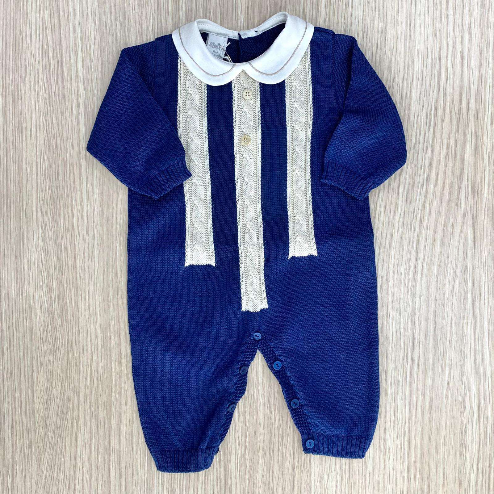 Tutina intera neonato in filo, di colore blu e beige, con colletto in cotone di colore panna. Completo con applicazione di bottoncini.