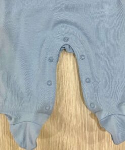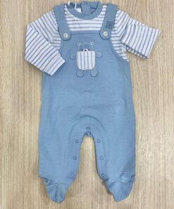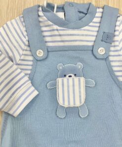 Tutina intera neonato in cotone, di colore celeste e bianco, applicazione di disegni in rilievo. Tutina con dettaglio di finta salopette.