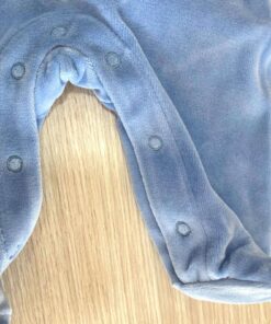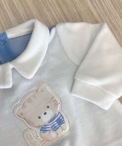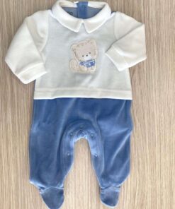 Tutina intera neonato in ciniglia, di colore azzurro e panna.Tutina con disegno ricamato e apertura con bottoncini.