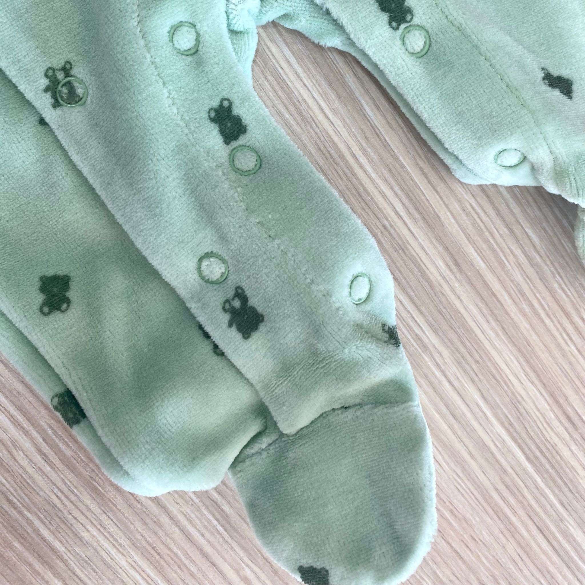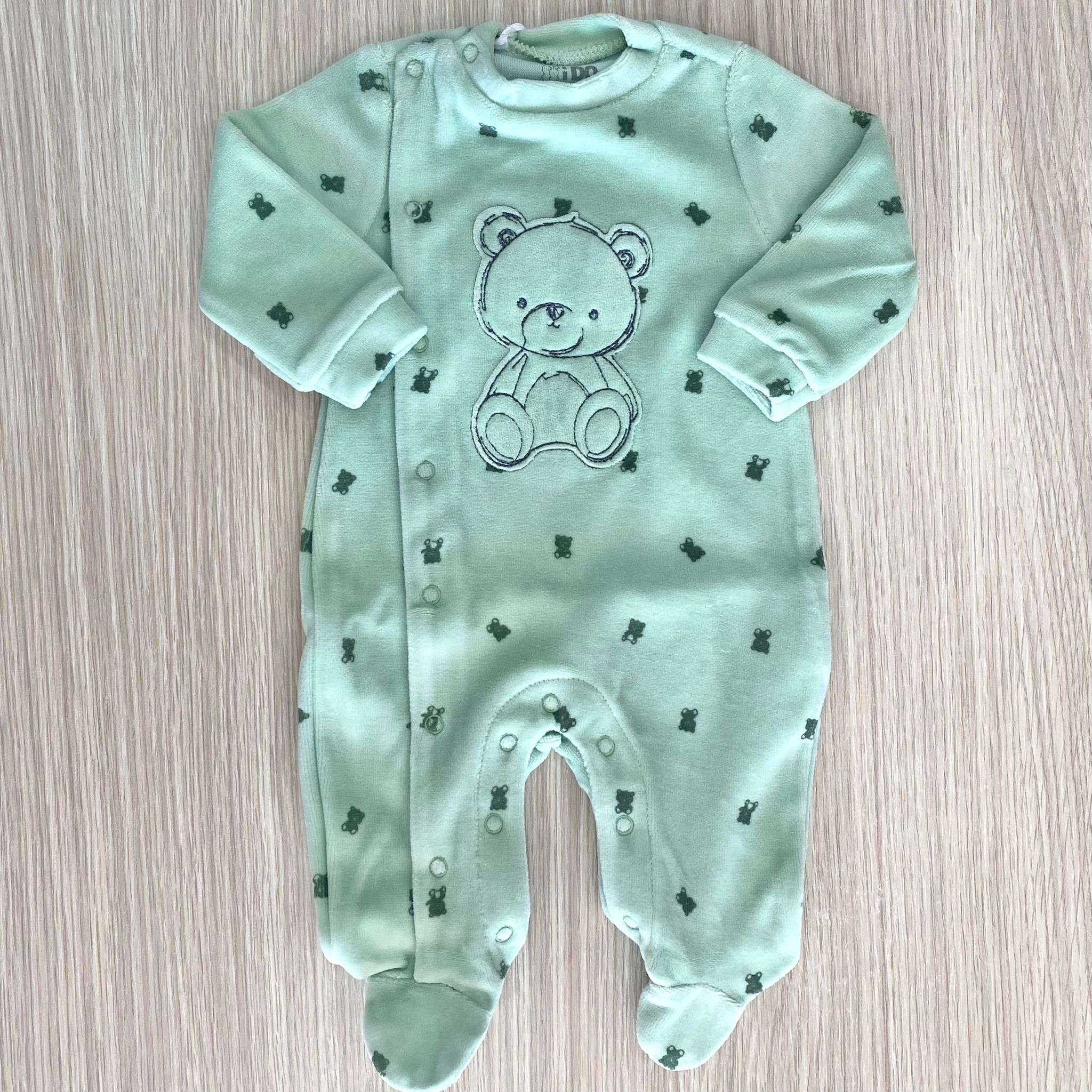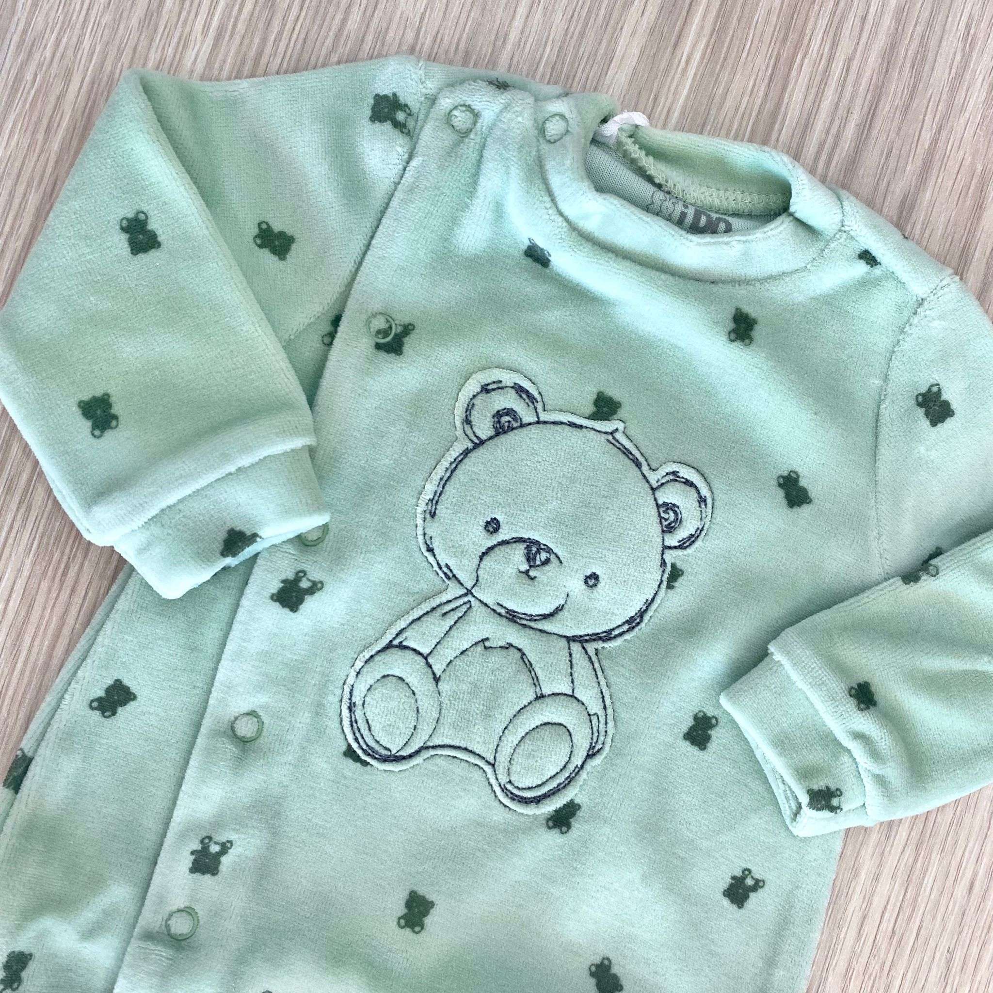 Tutina intera neonato in ciniglia, di colore verde. Tutina con disegno ricamato e apertura con bottoncini.