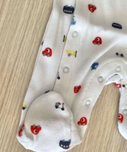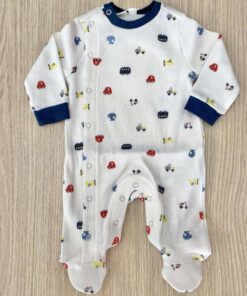 Tutina intera neonato in cotone a nido d’ape, di colore bianco e blu, disegni di vari colori. Tutina con apertura di bottoncini sul davanti.