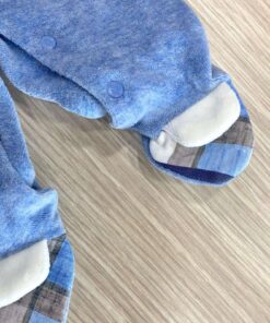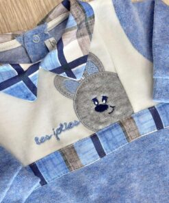 Tutina intera neonato in ciniglia di colore panna, grigio e azzurro scuro, con disegno ricamato.