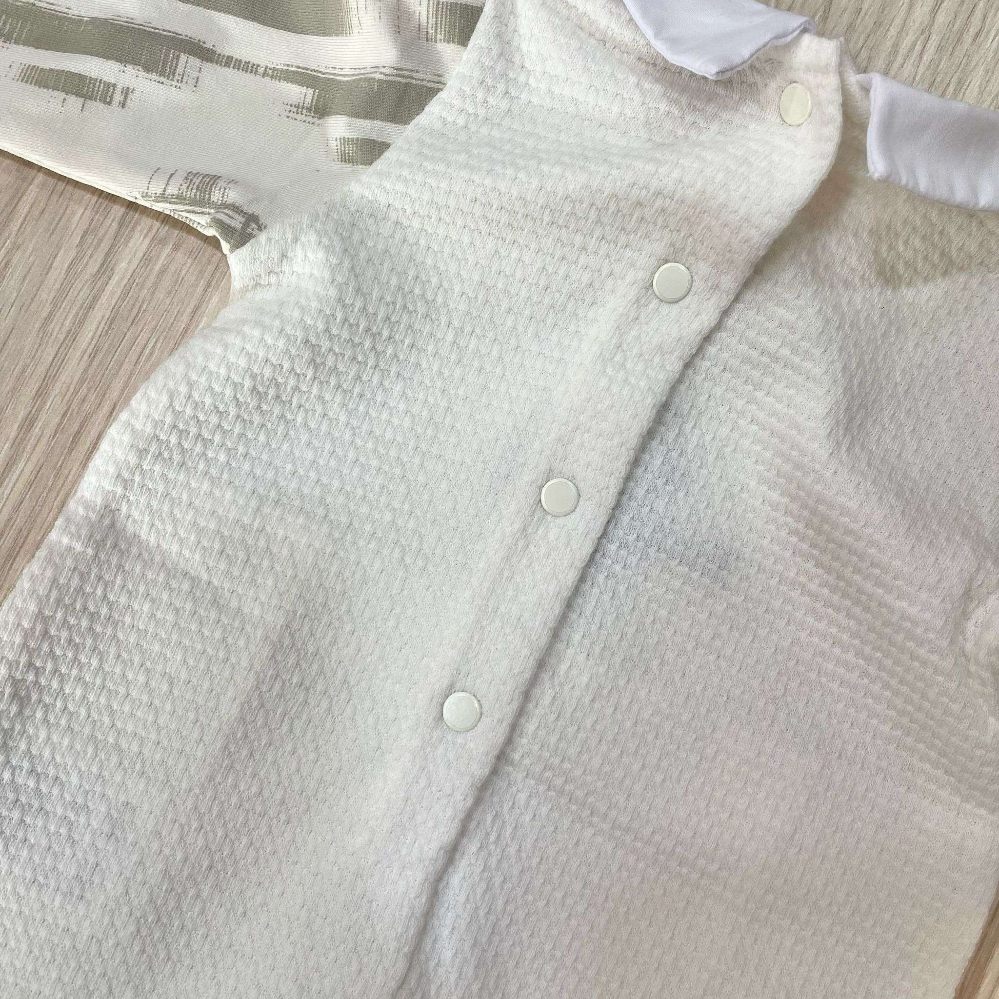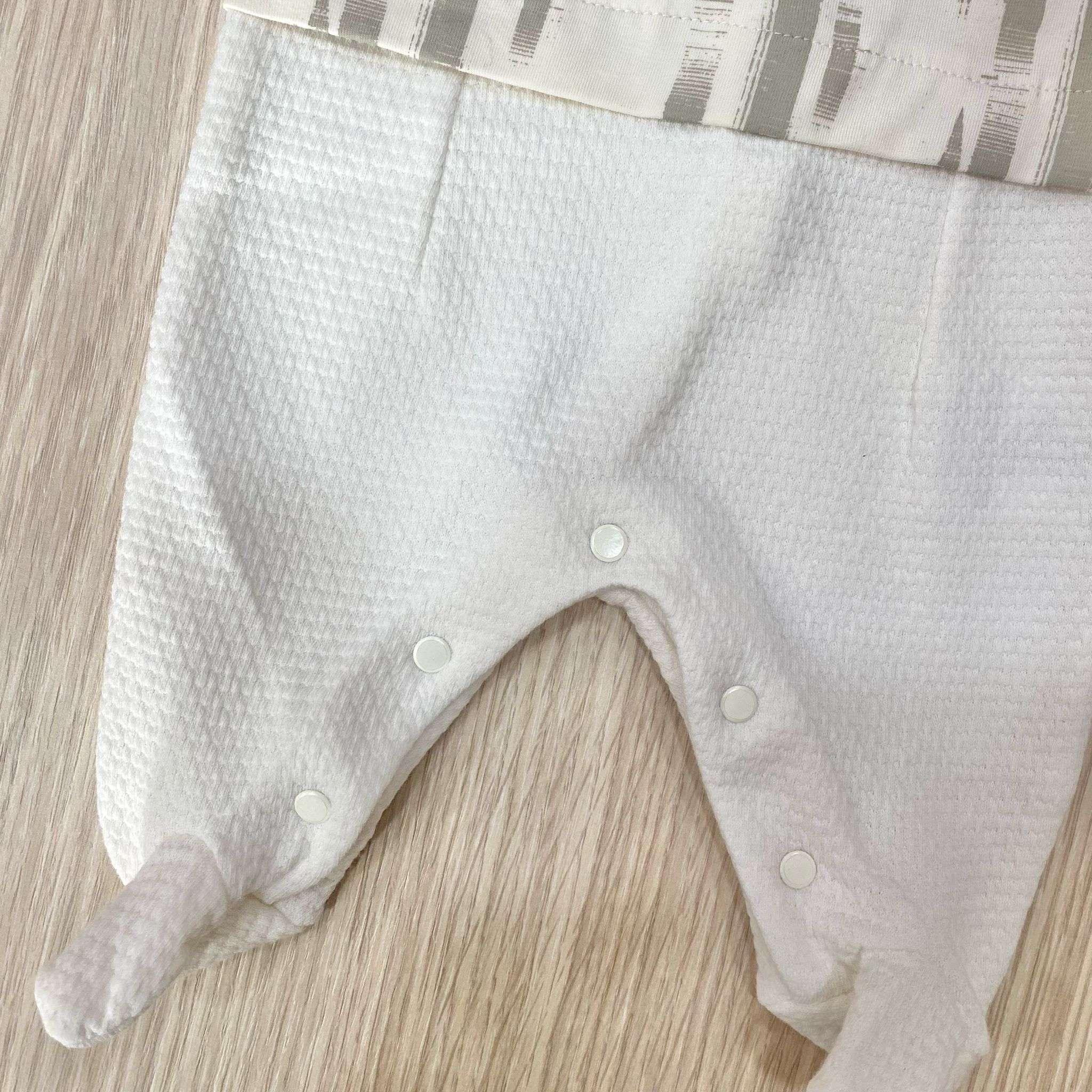 Tutina intera neonato in cotone a nido d’api, di colore beige, con applicazione di bottoncini.