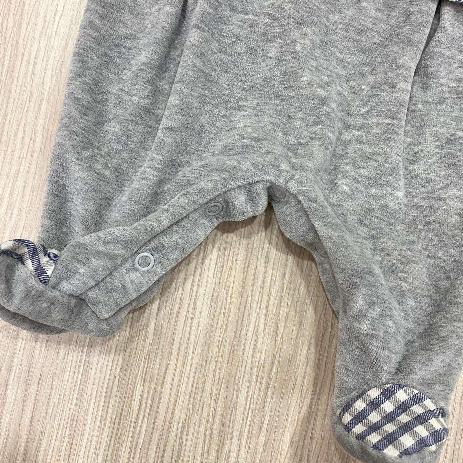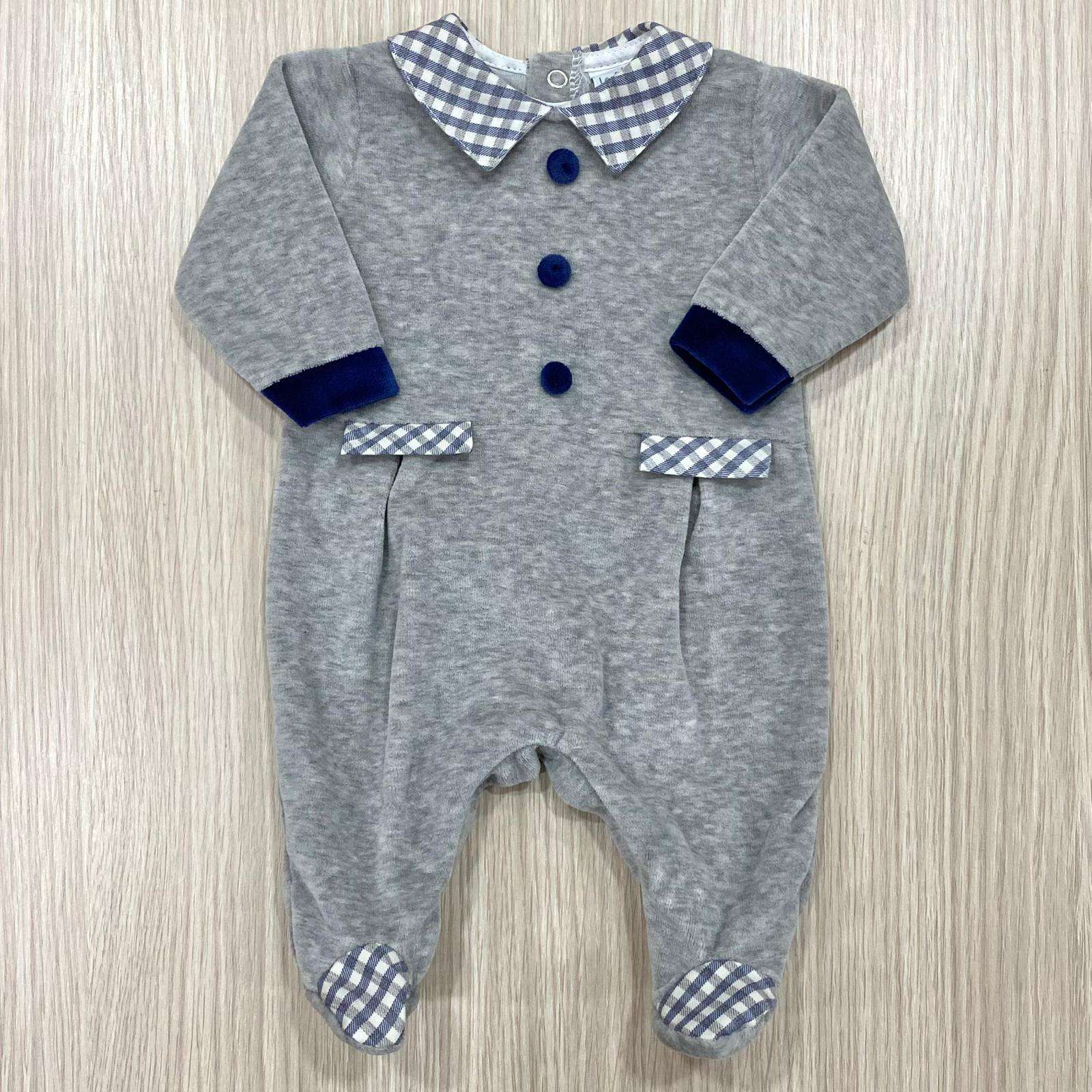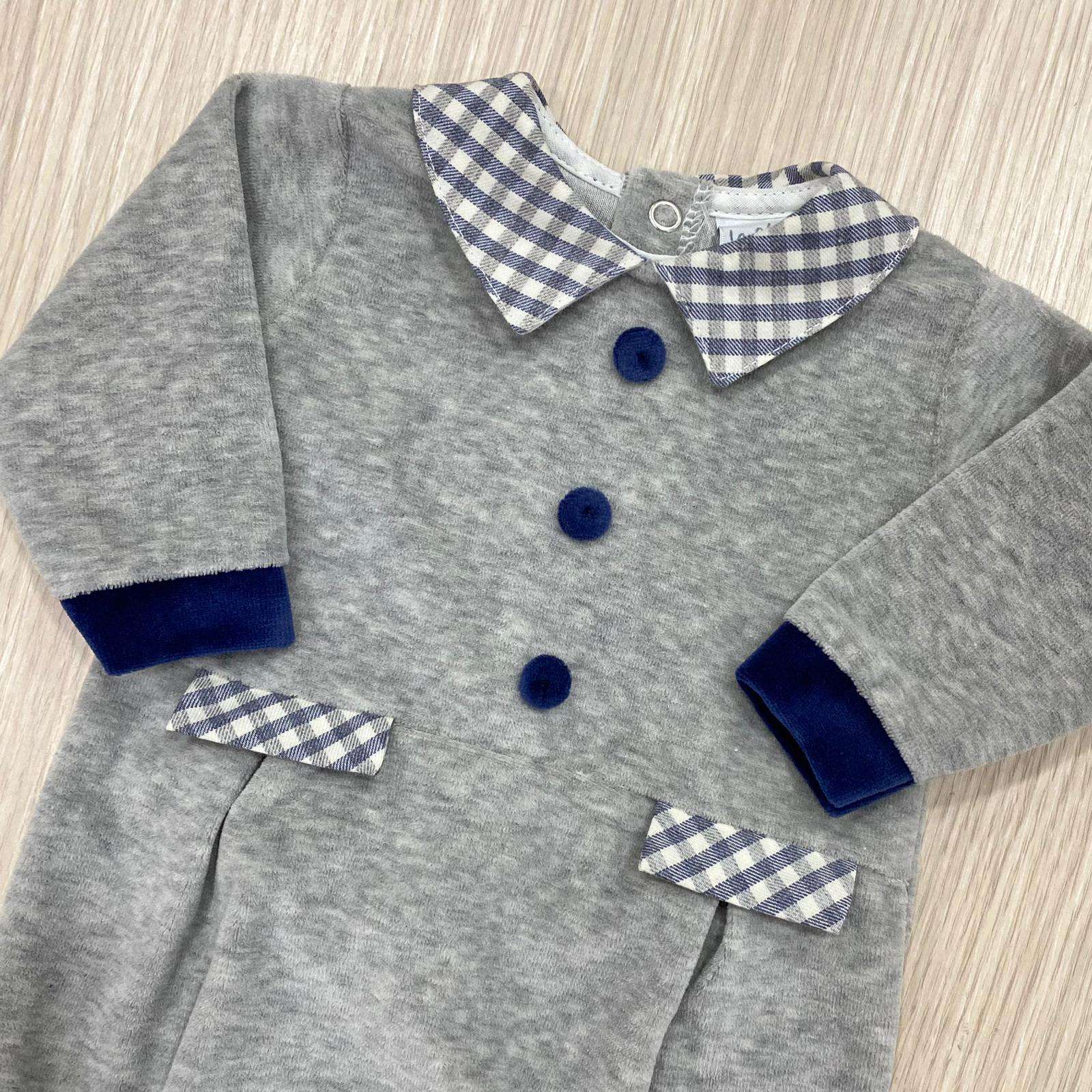 Tutina intera neonato in ciniglia, di colore grigio e blu con applicazione di bottoncini.