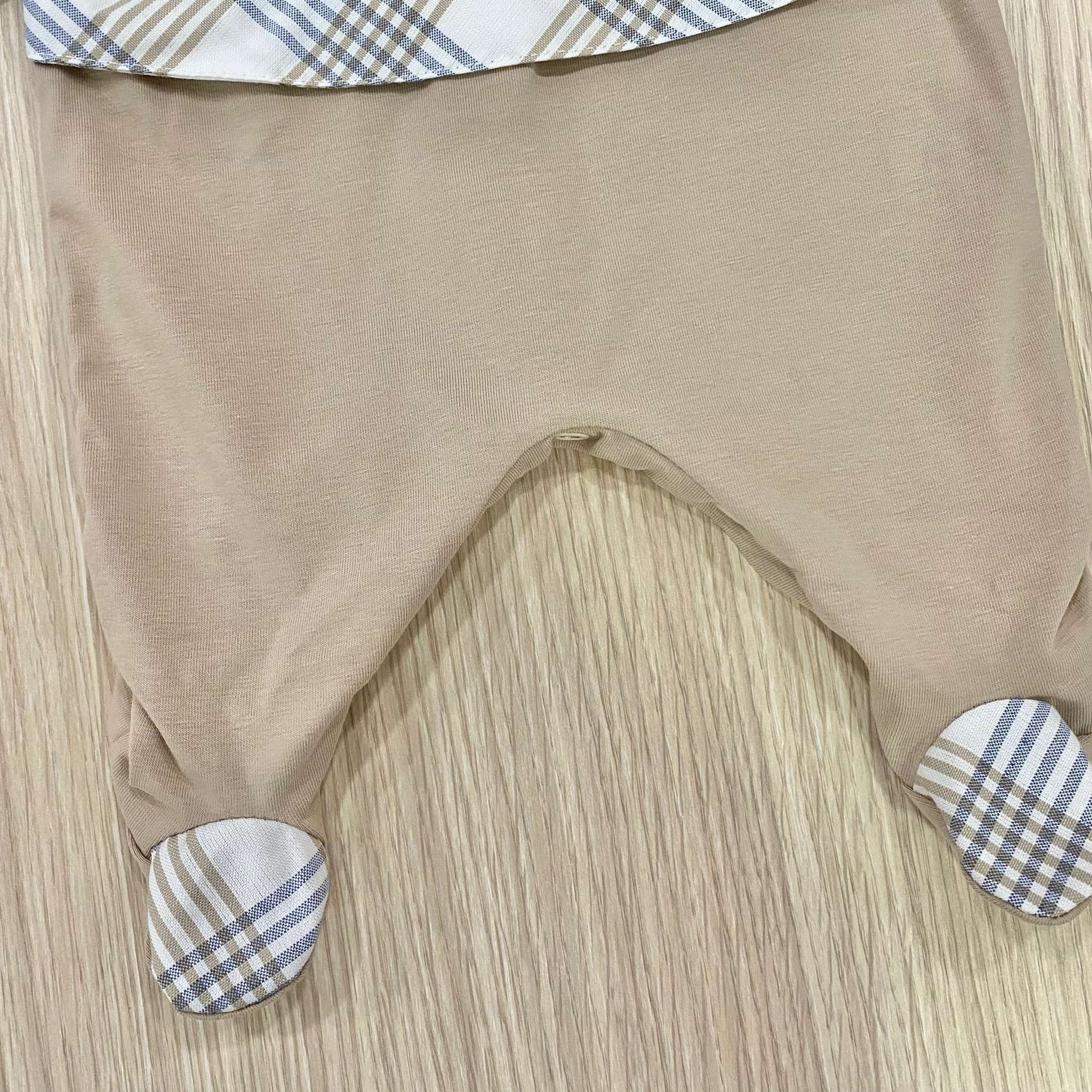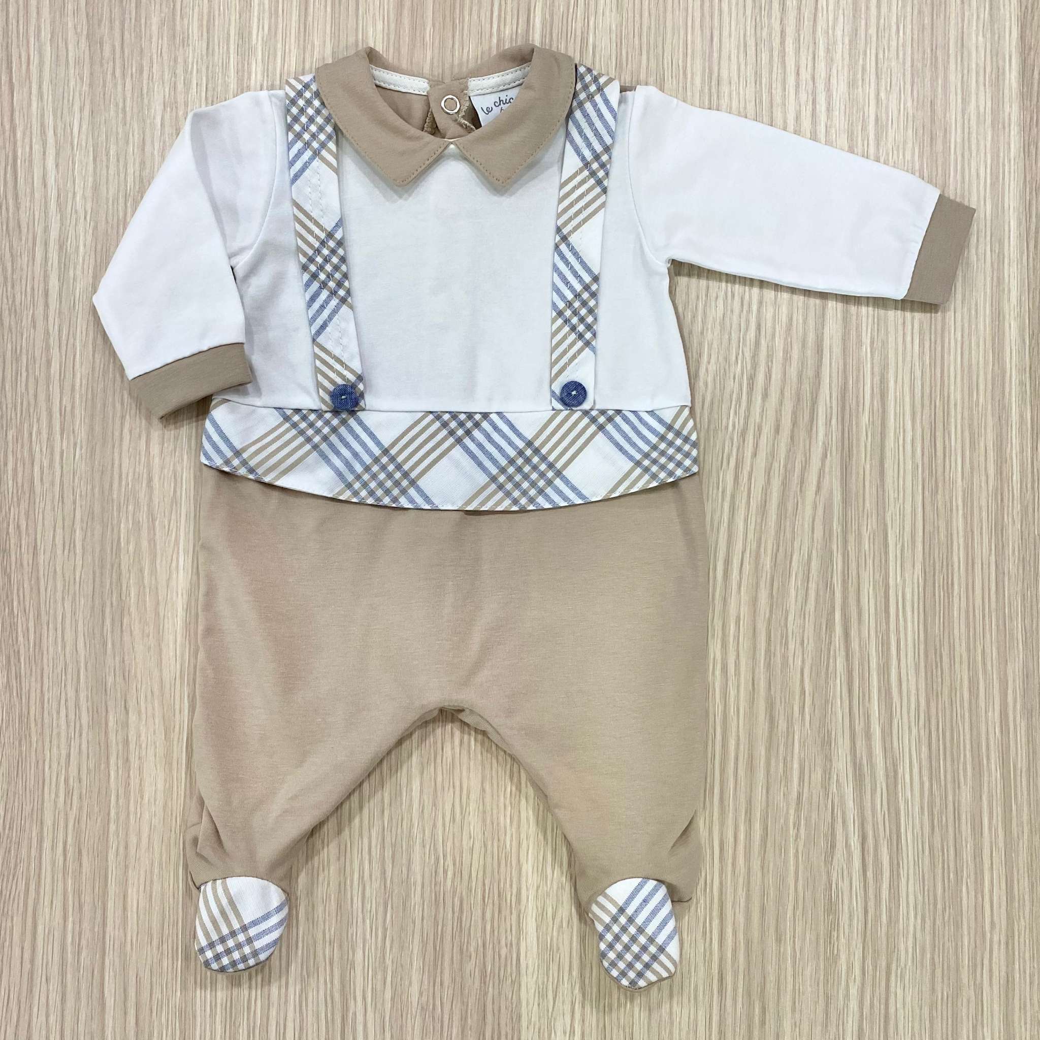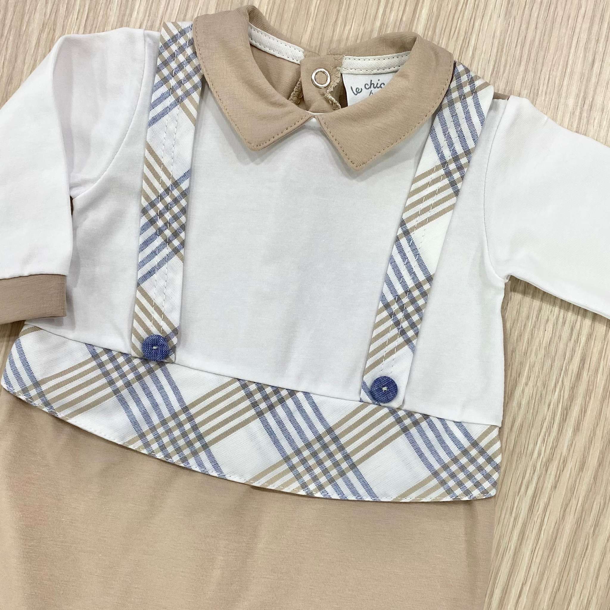 Tutina intera neonato in cotone, di colore bianco, nocciola e blu, con dettaglio di finte bretelle.
