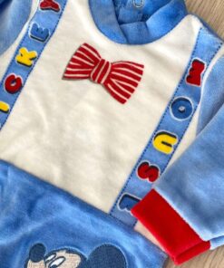 Tutina intera neonato in ciniglia, di colore bianco e bluette, con dettagli di vari colori, con disegno Mickey Mouse ricamato.
