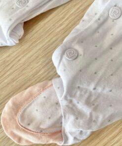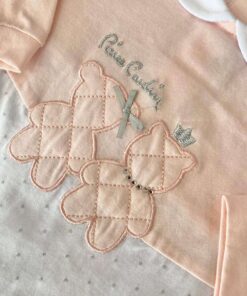 Tutina intera neonata/bambina in cotone, di colore rosa perla e bianco, con applicazione di dettagli glitterati.