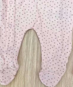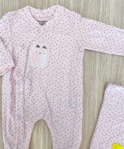 Tutina intera/pigiamino in cotone, di colore rosa con dettagli di vari colori e disegno ricamato.