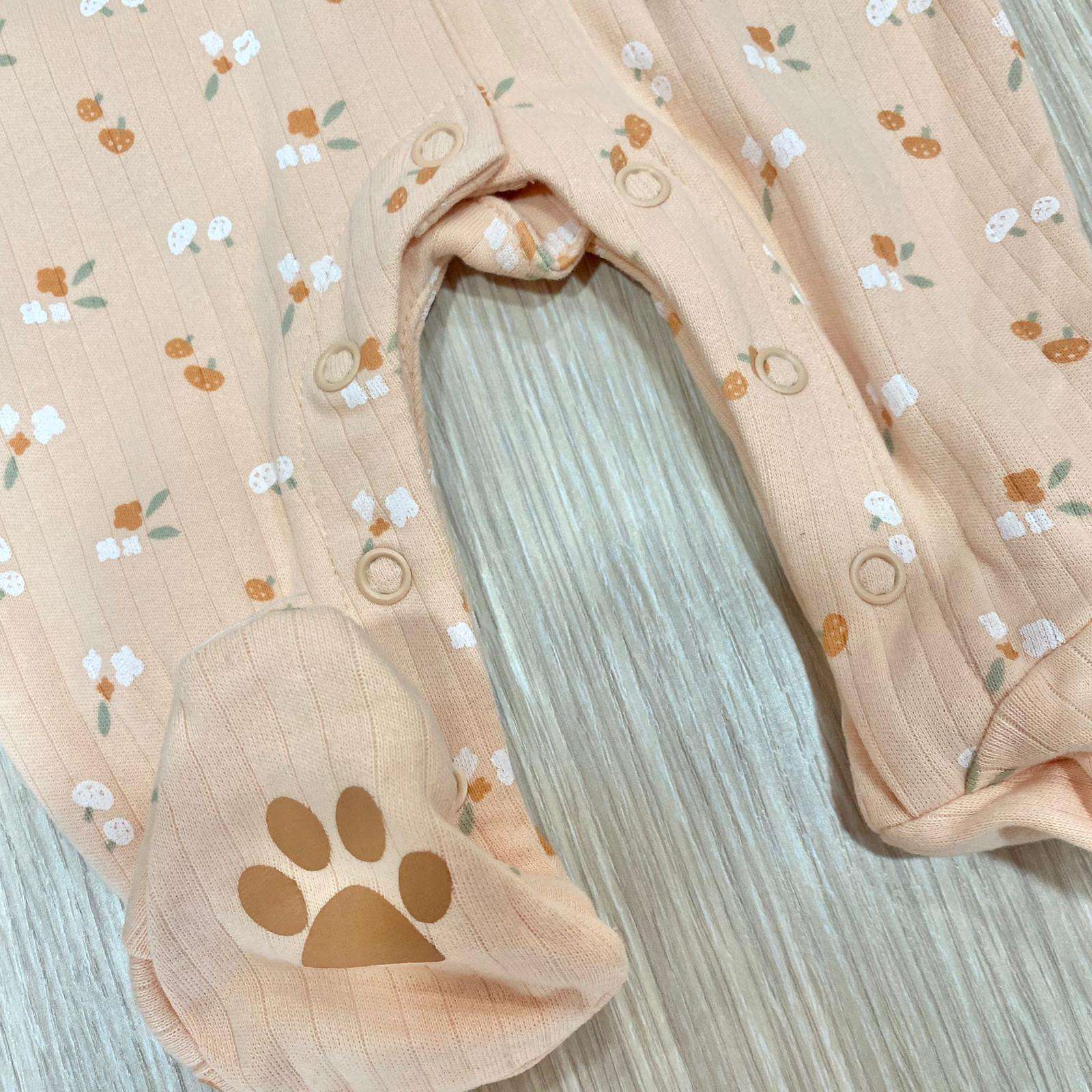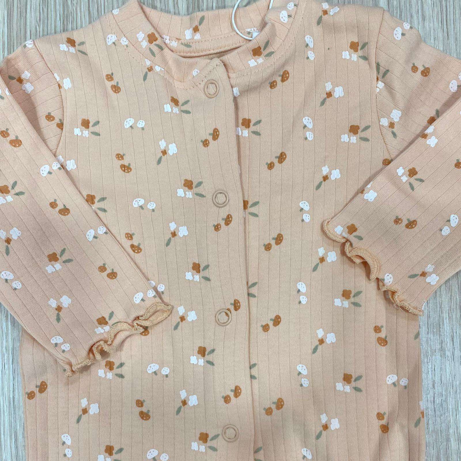 Tutina intera/pigiamino neonata in caldo cotone, di colore salmone e dettagli di vari colori, con apertura con bottoncini.