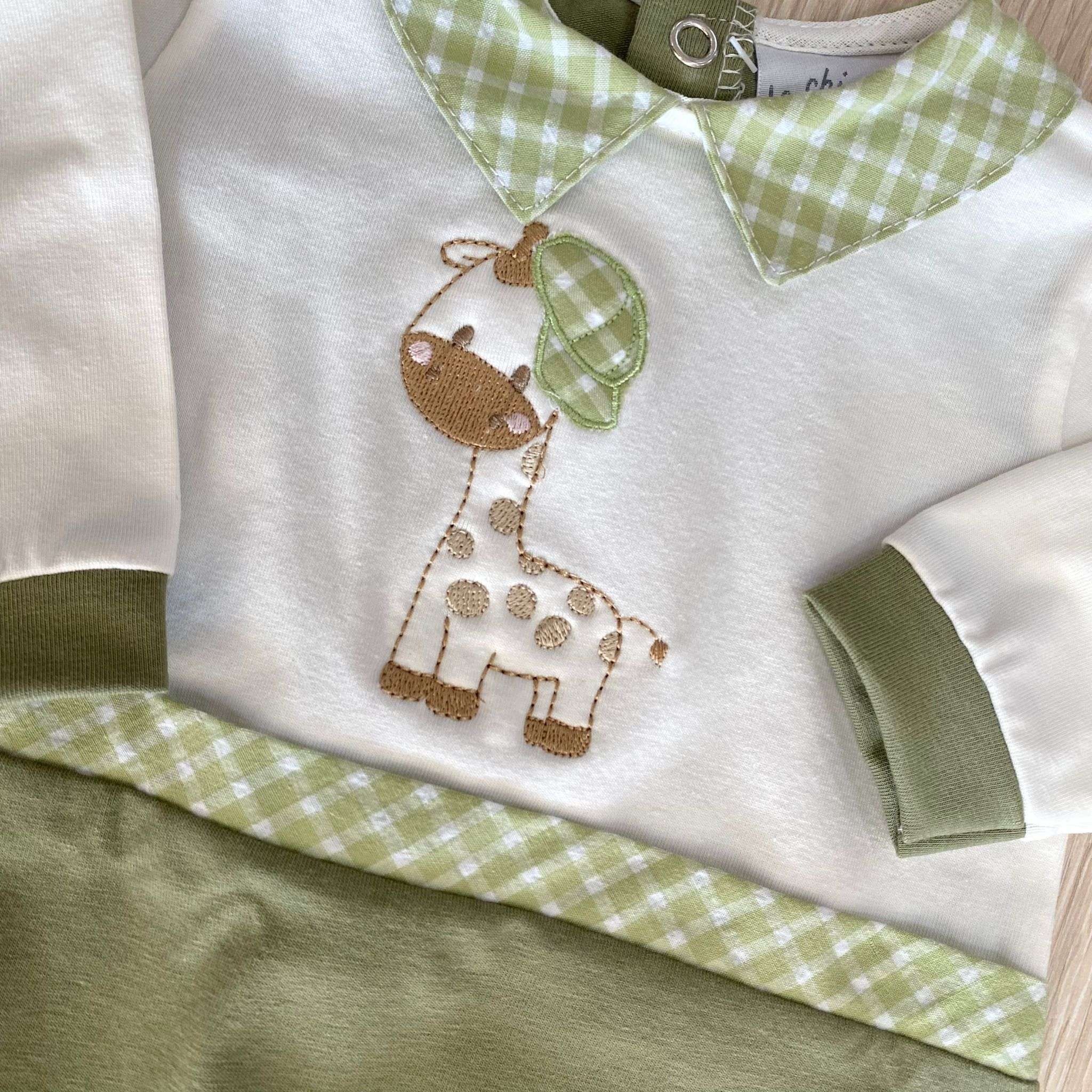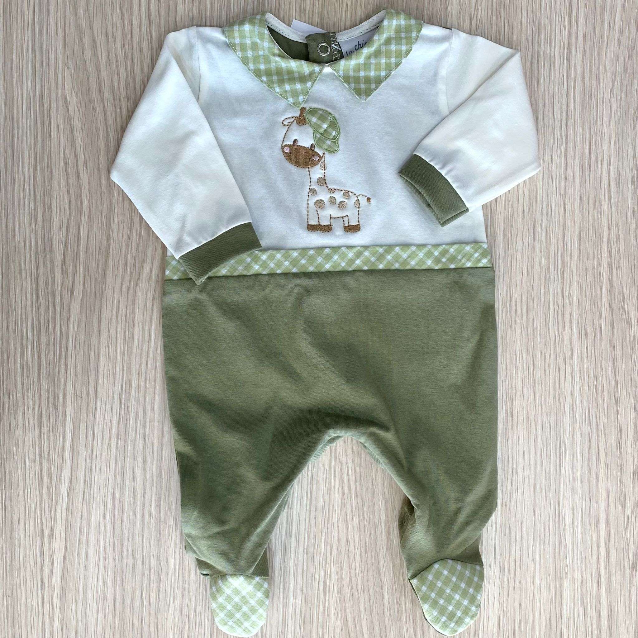 Tutina intera neonato in cotone, di colore panna e verde, con disegni tema safari di vari colori.