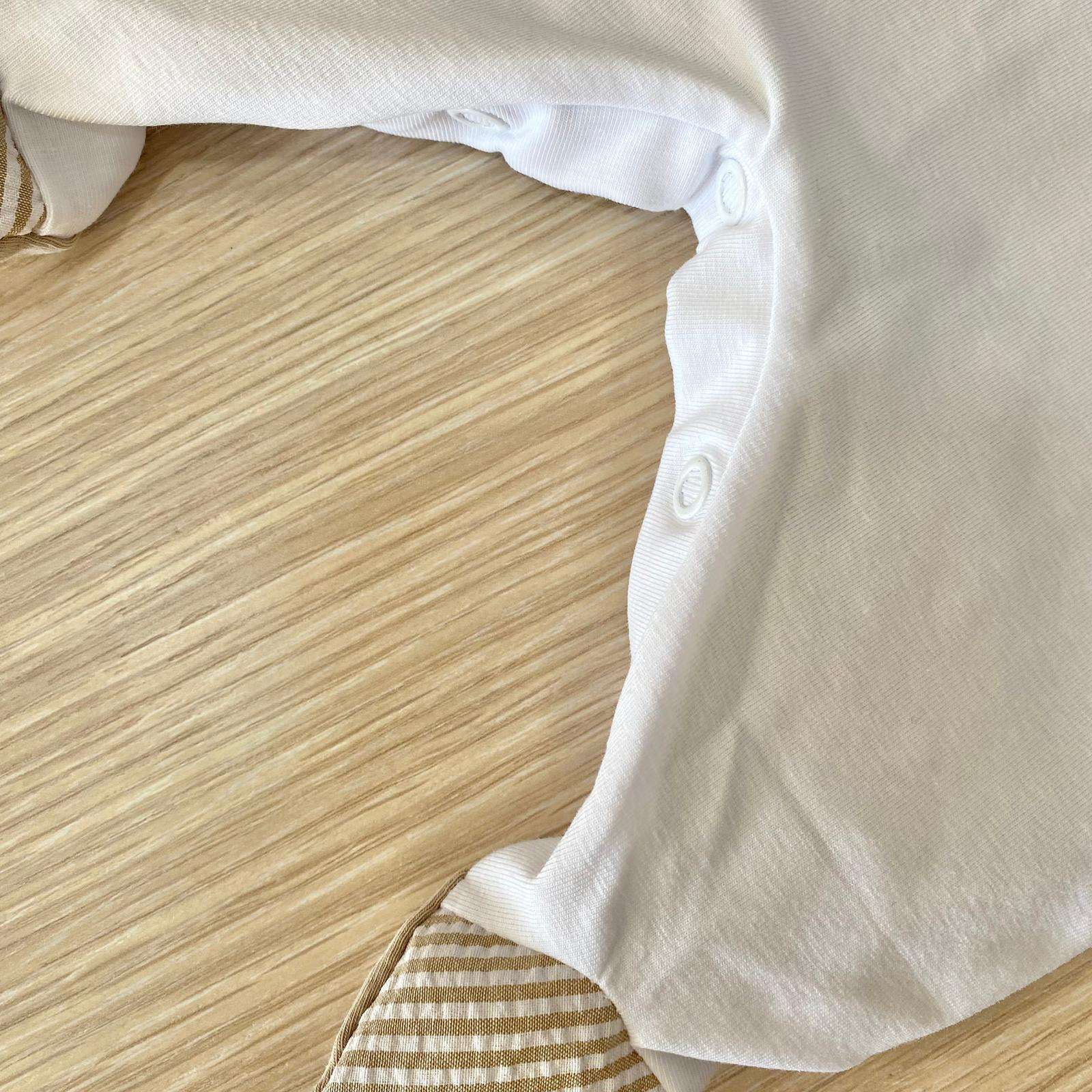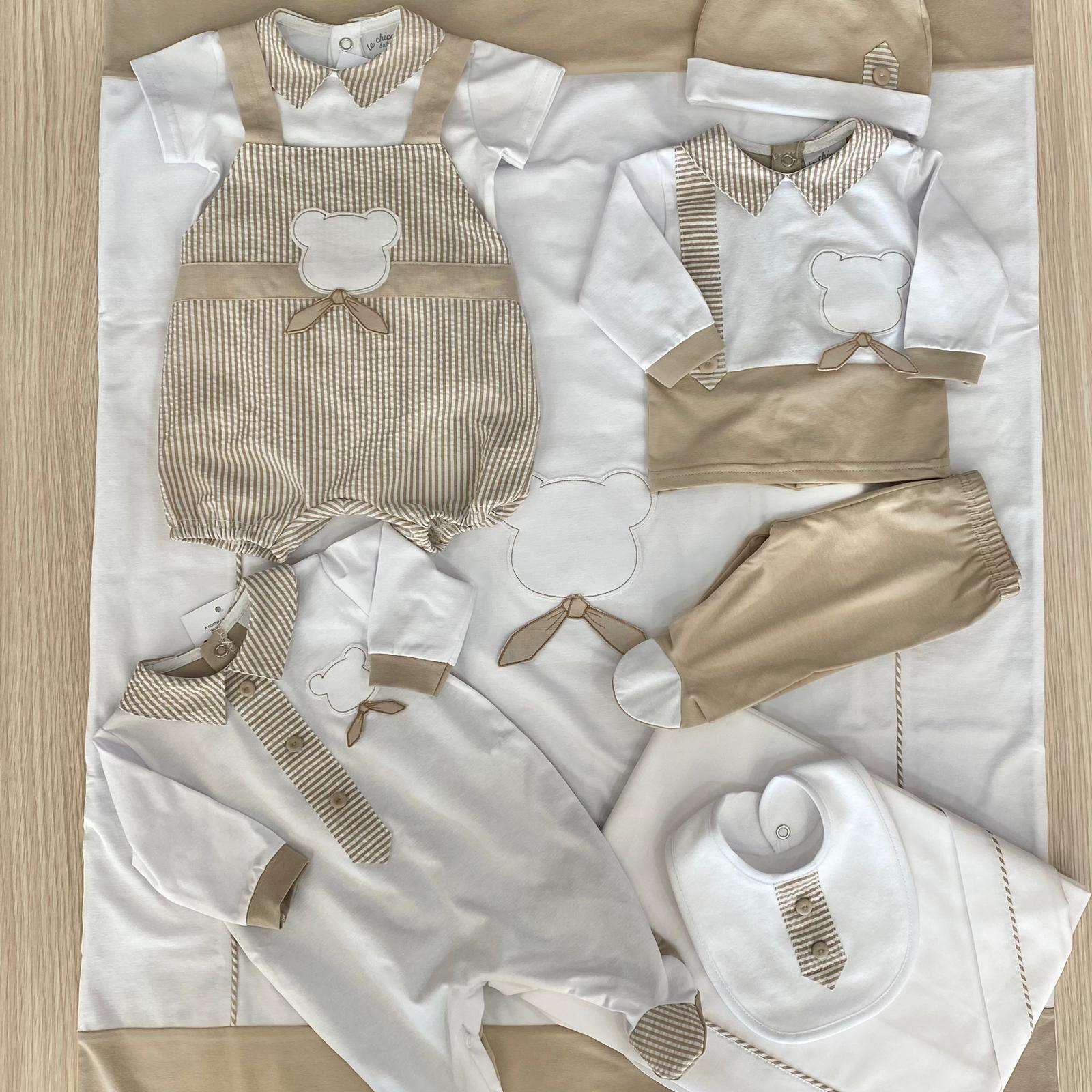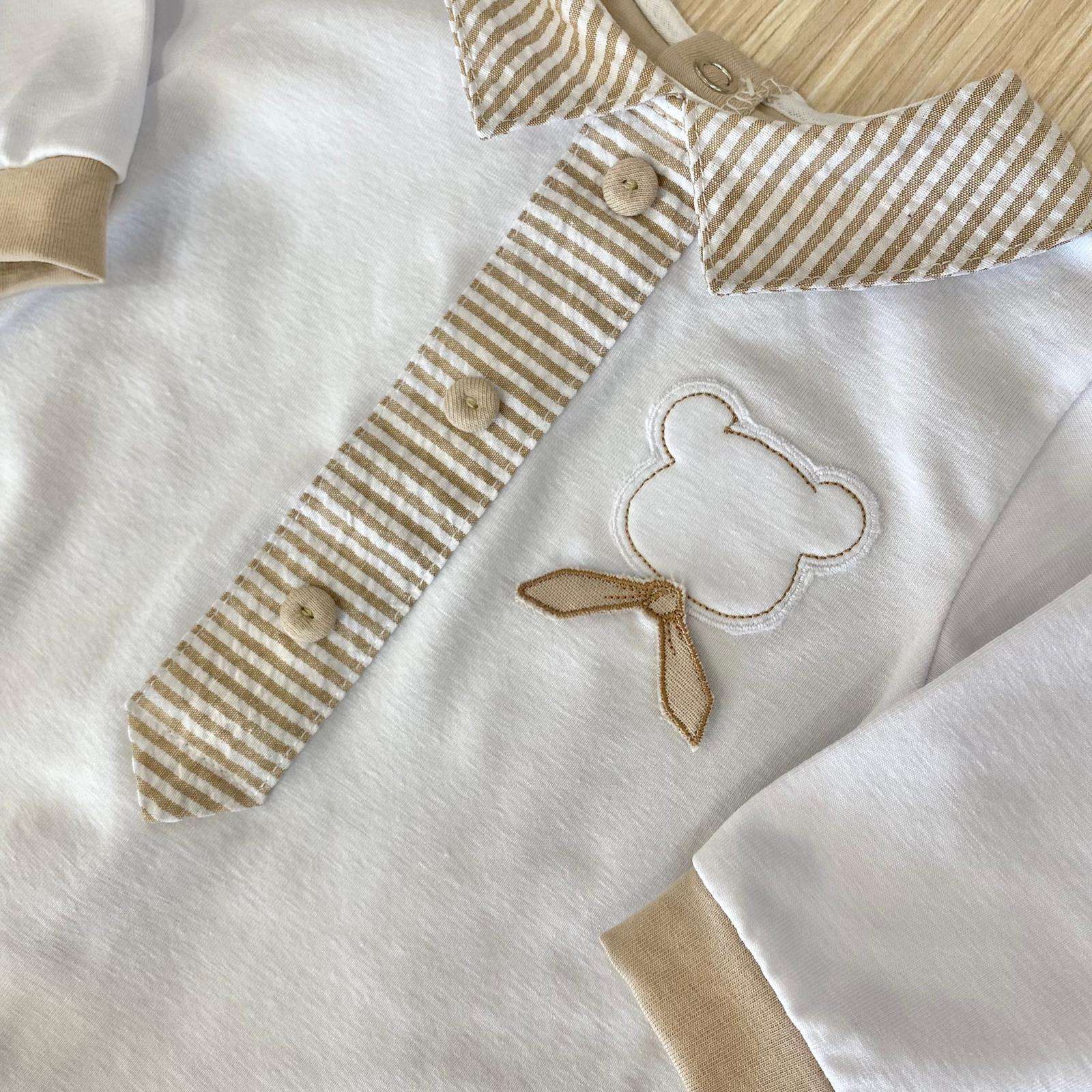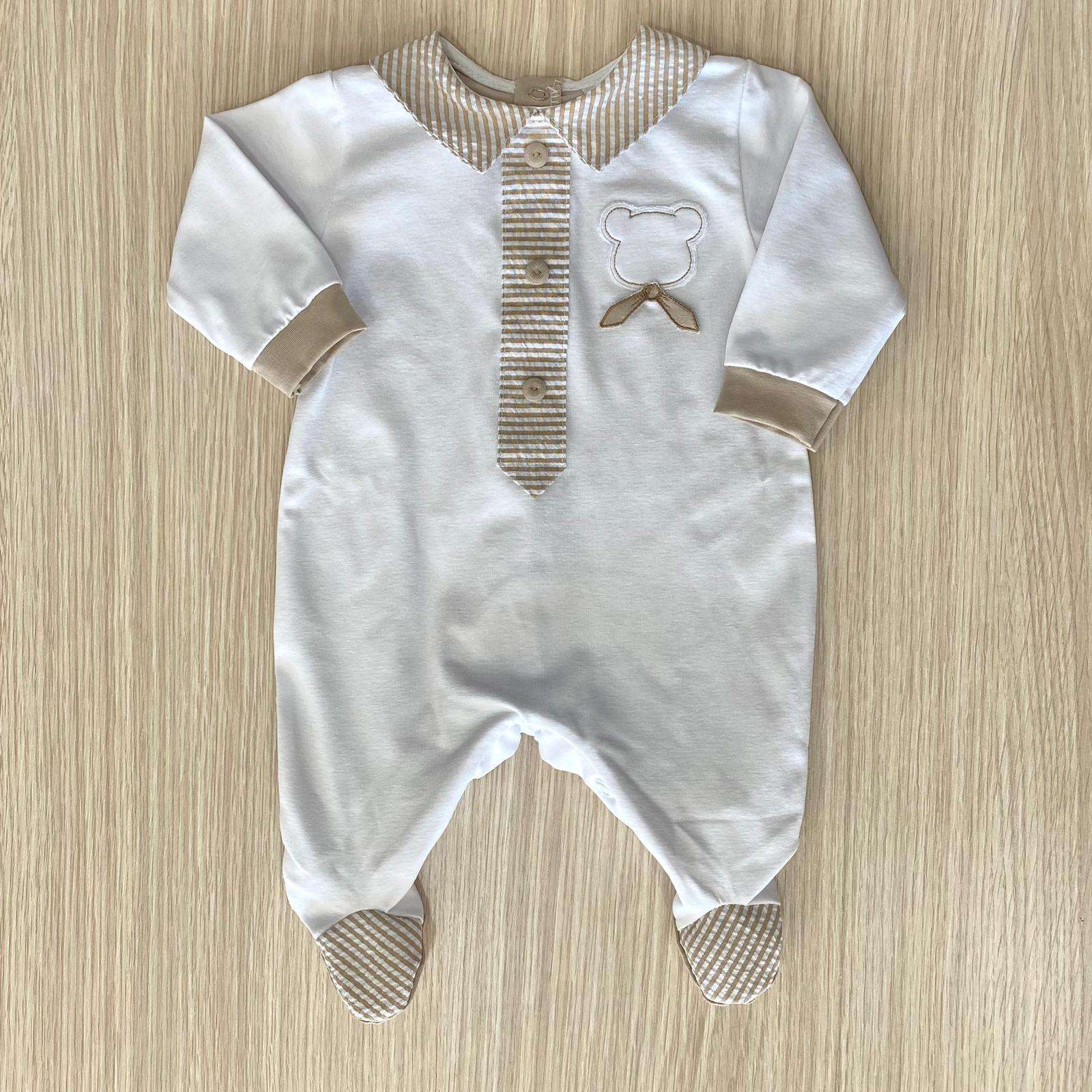 Tutina intera neonato in cotone, di colore bianco e nocciola, con disegno in rilievo e applicazione di bottoncini.
