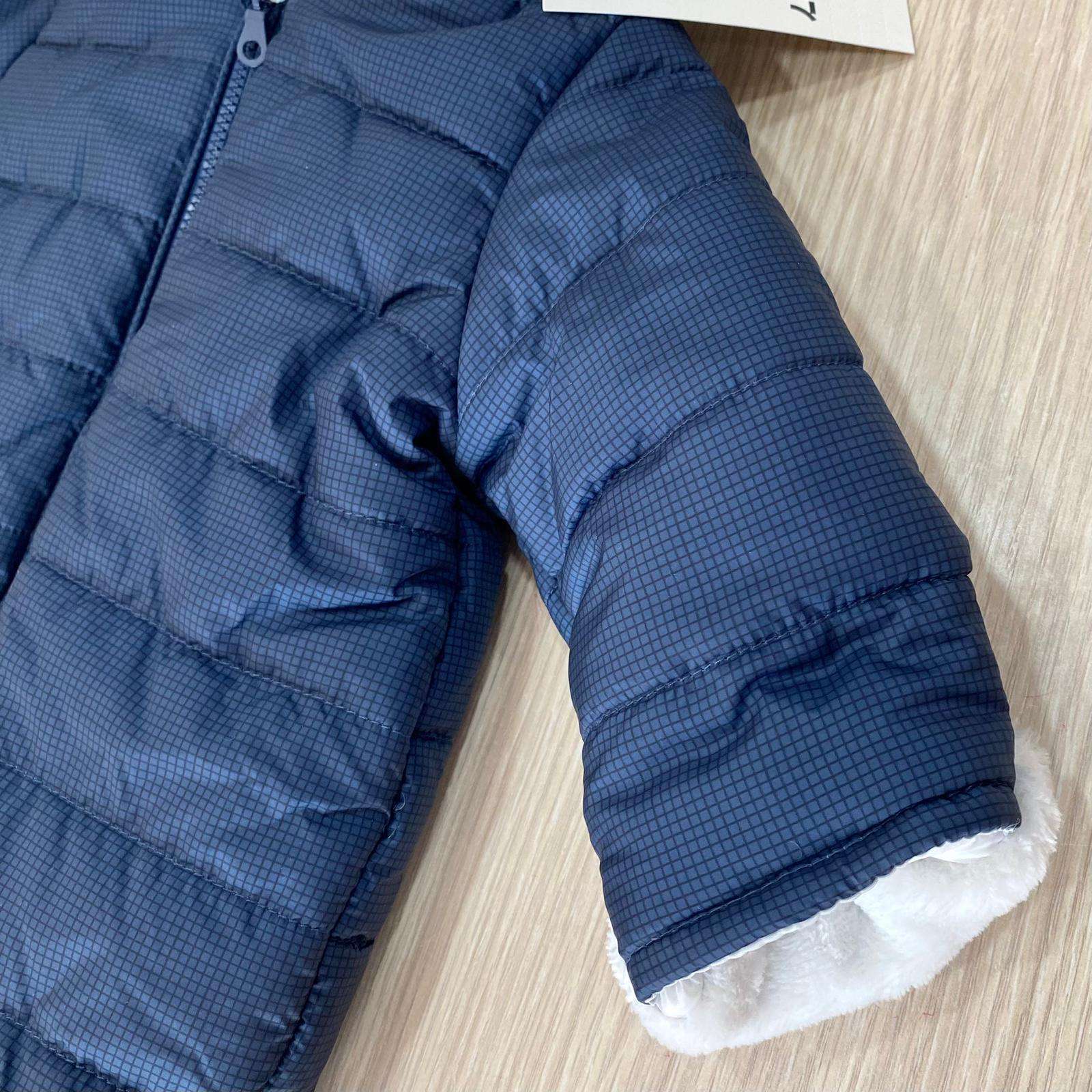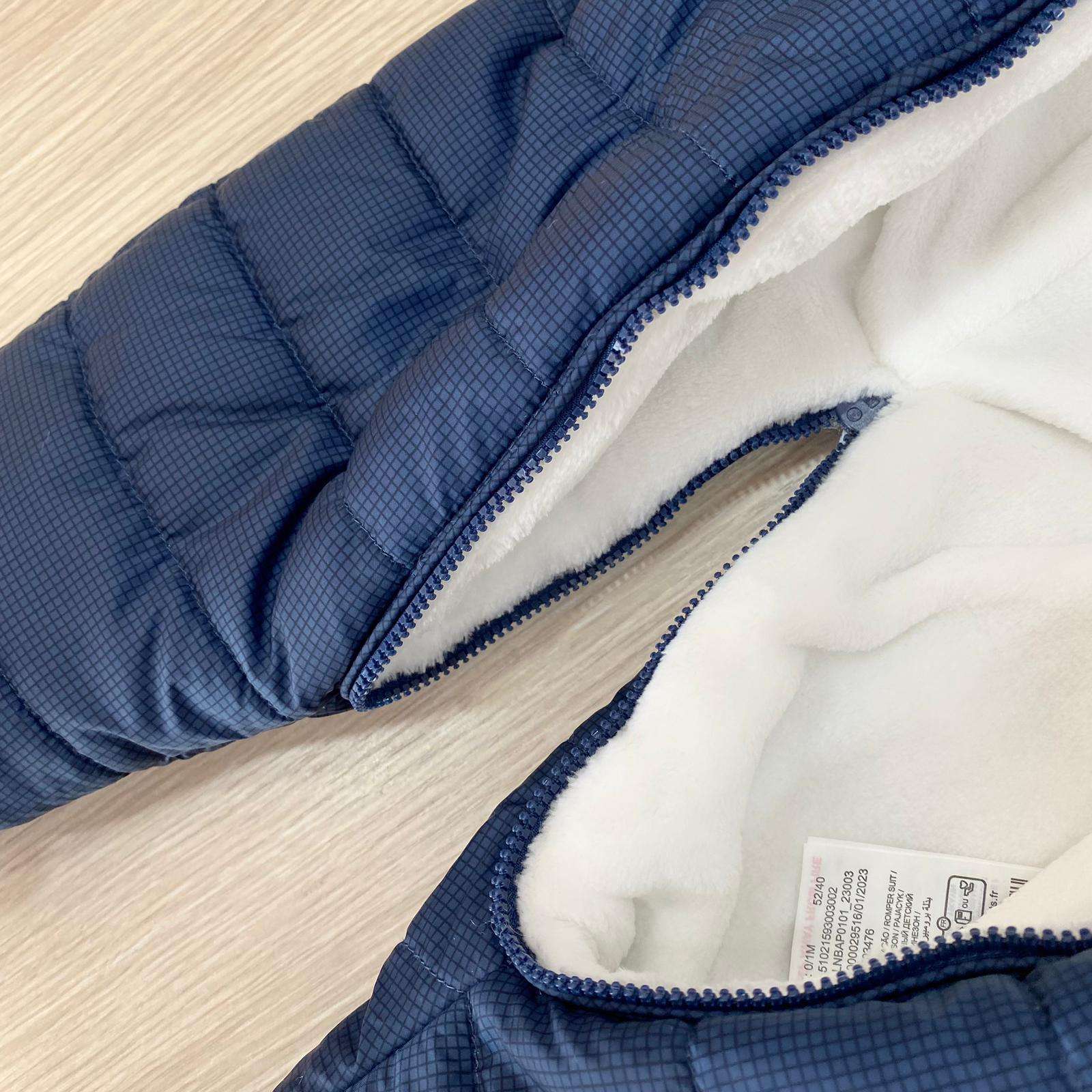 Tutone imbottito neonato con interno in caldo pile cinigliato, di colore blu e bianco.